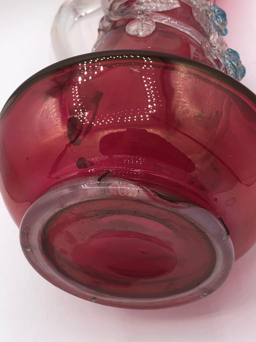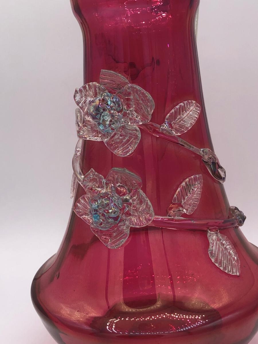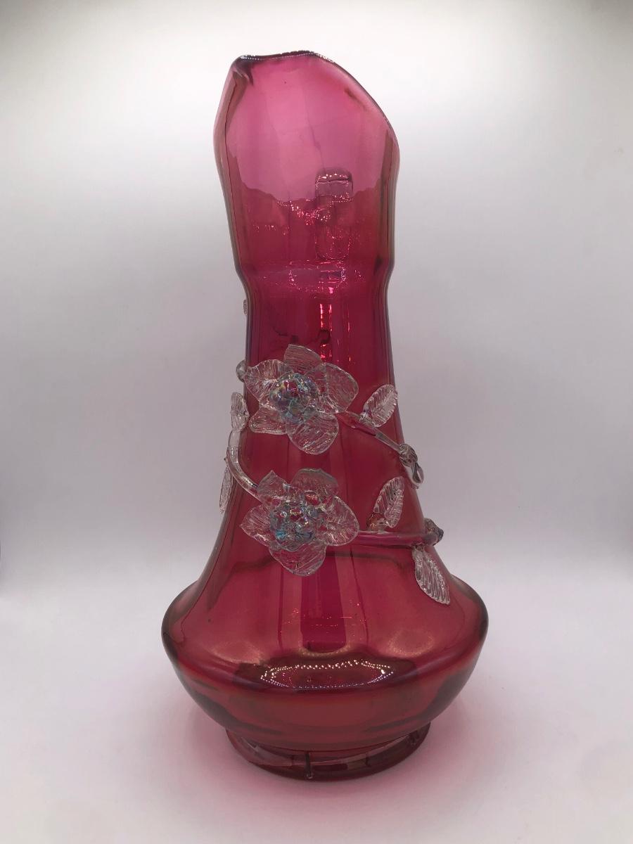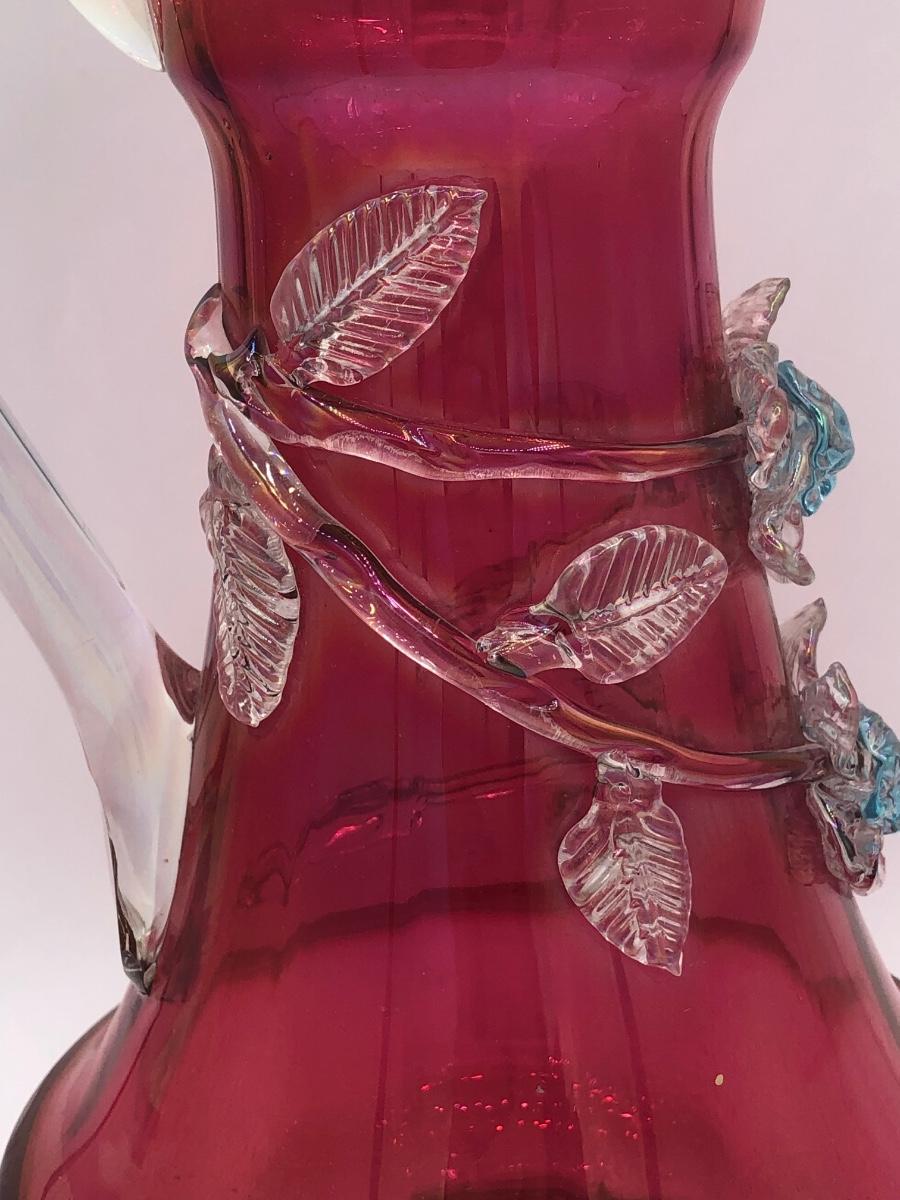 LOT 91D: Vintage Hand Blown Cranberry Glass Sculpted Flower Pitcher & Glass Wavy Edge Pedestal Compote