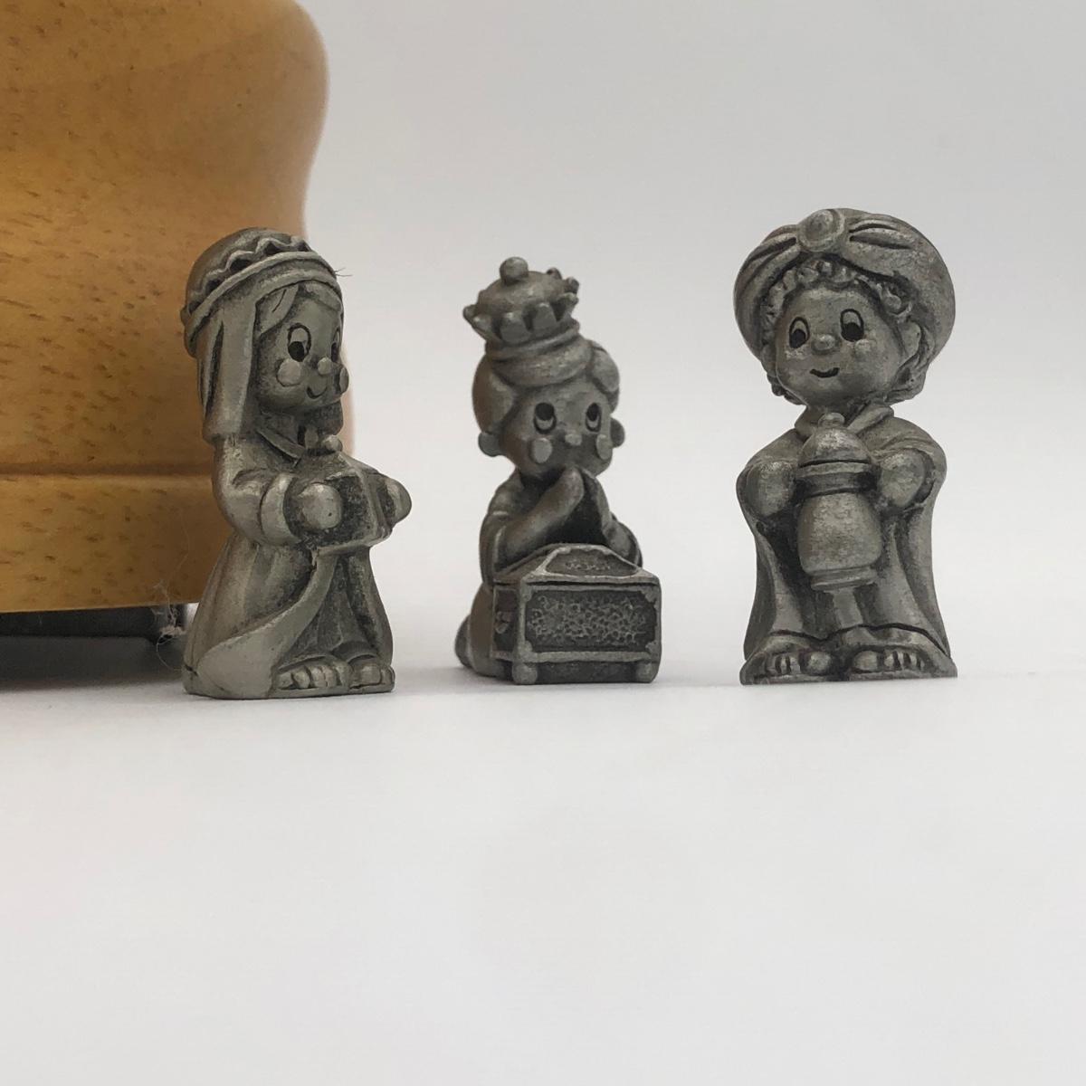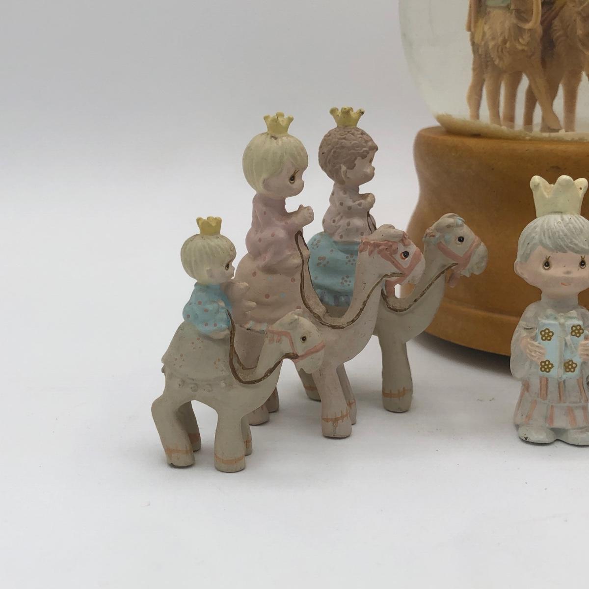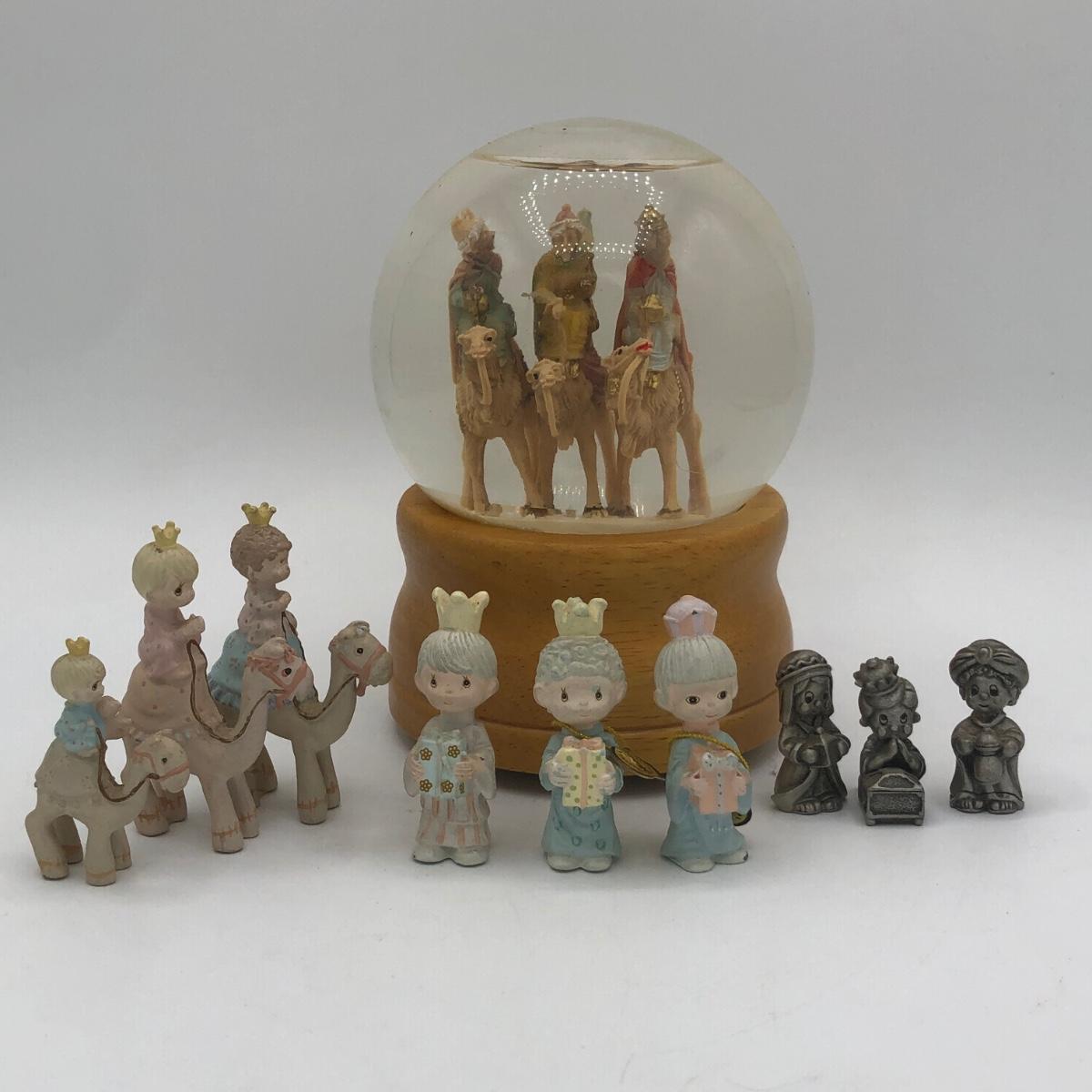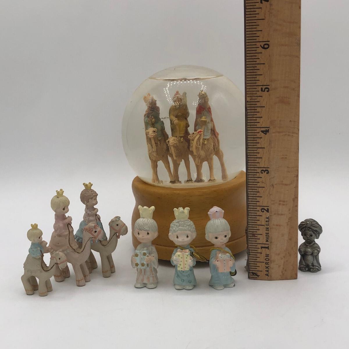 LOT 92D: Vintage Enesco Precious Moments 3 Kings Nativity Pieces, 1983 Hudson Fine Pewter 3 Kings Figurines & Roman 3 Kings on Camels Musical Water Globe