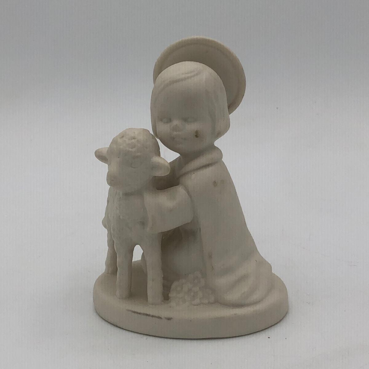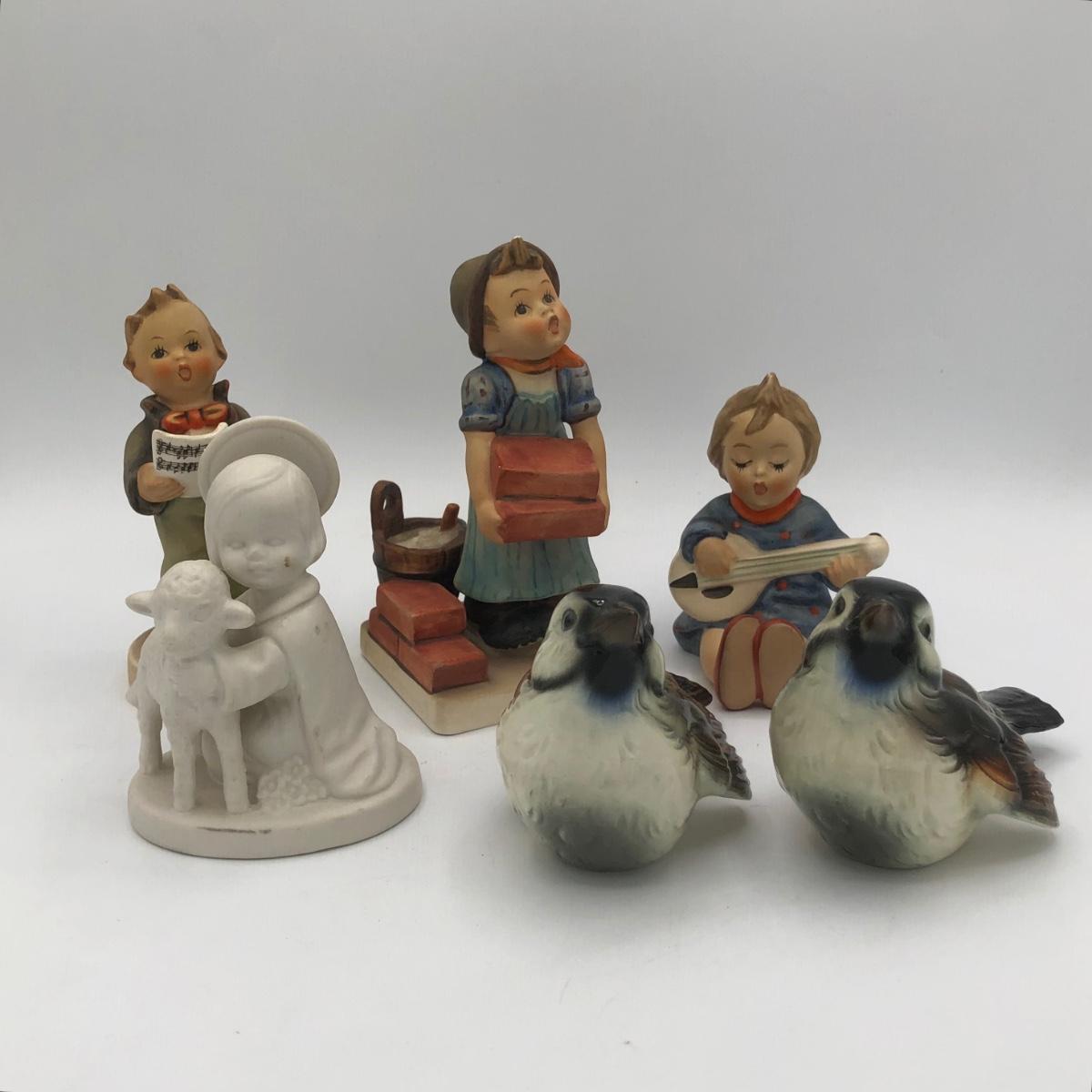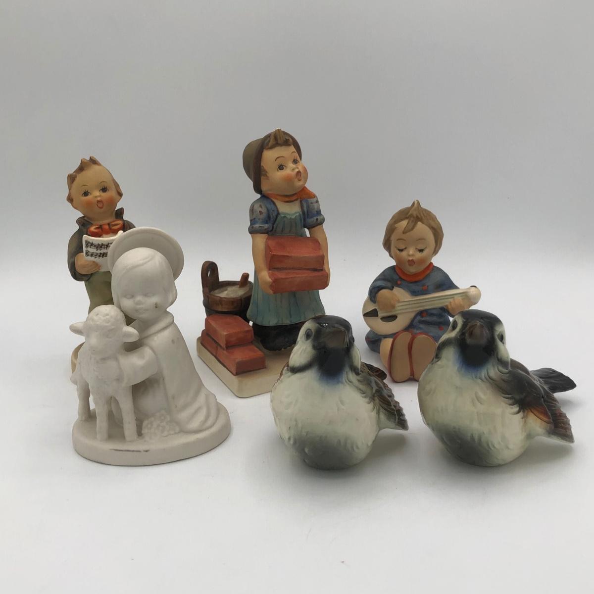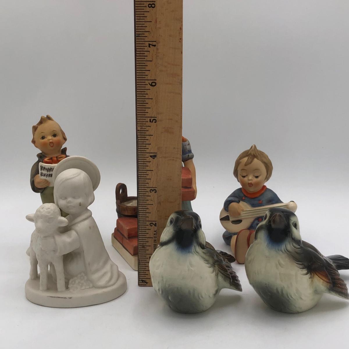 LOT 93D: Vintage Goebel Collection - Hummel 305 The Builder, Hummel 135 The Soloist, Hummel 53 Joyful, White Bisque Saint / Angel Child w/ Lamb & 2 Sparrow Birds