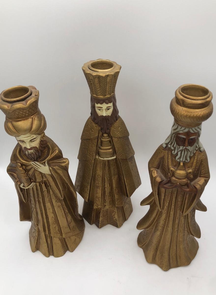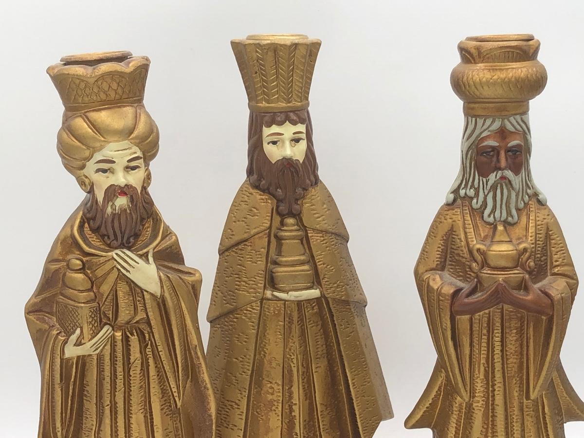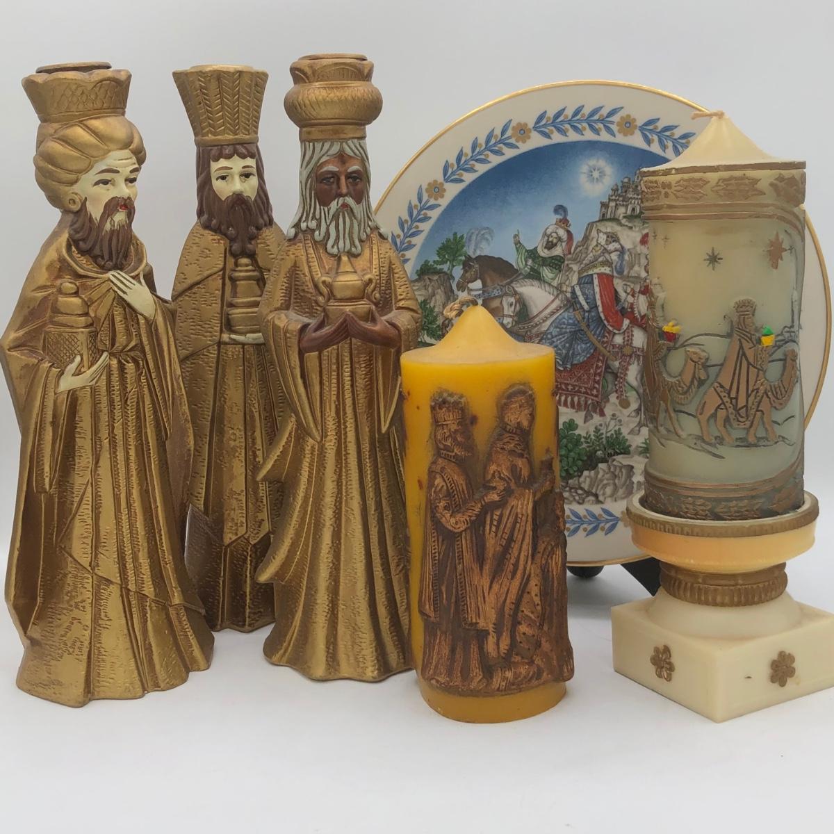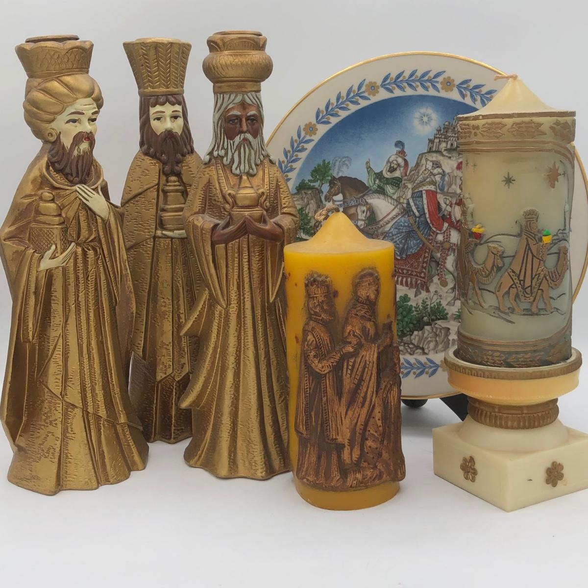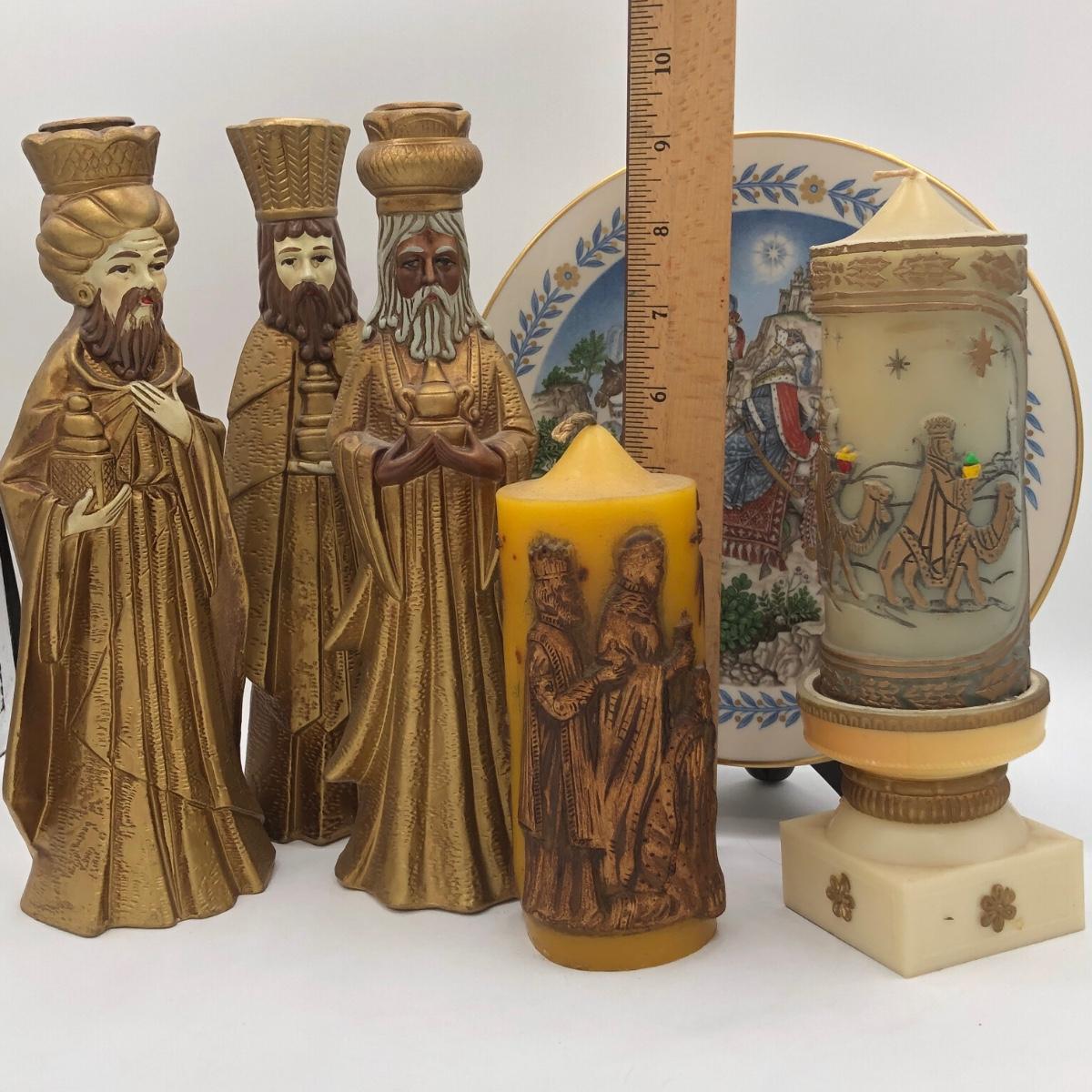 LOT 95D: 1960s/70s MCM 3 Kings Nativity Gold Color Candle Stick Holders, 1980 Fleetwood "The Magi" by Fritz Wigner Plate & 2 Unused Vintage 3 Kings / Wise Men Pillar Holiday Candles