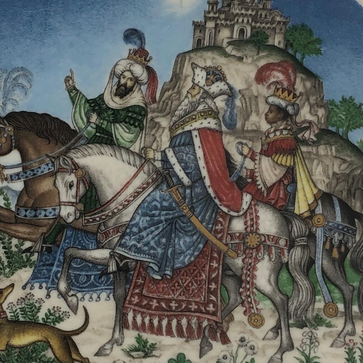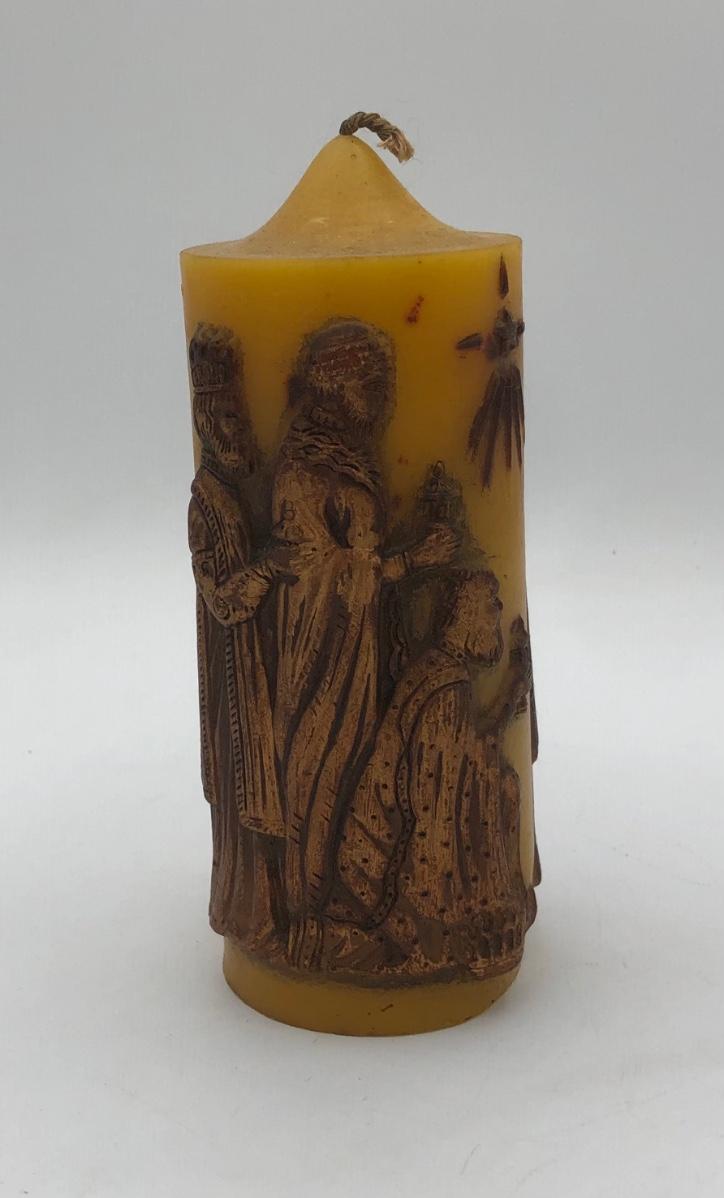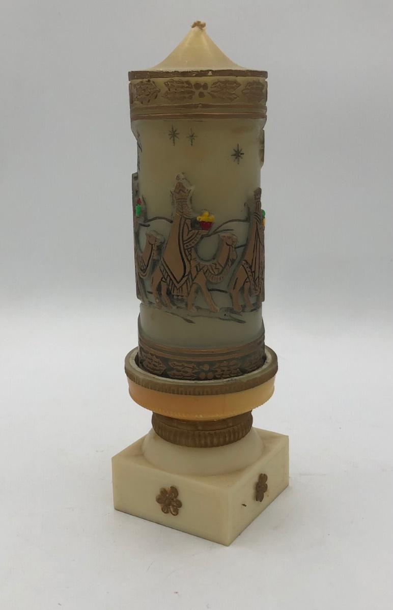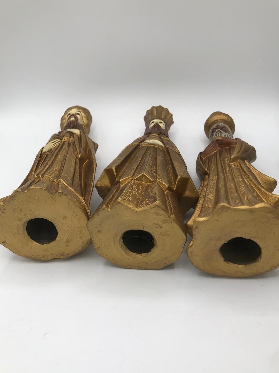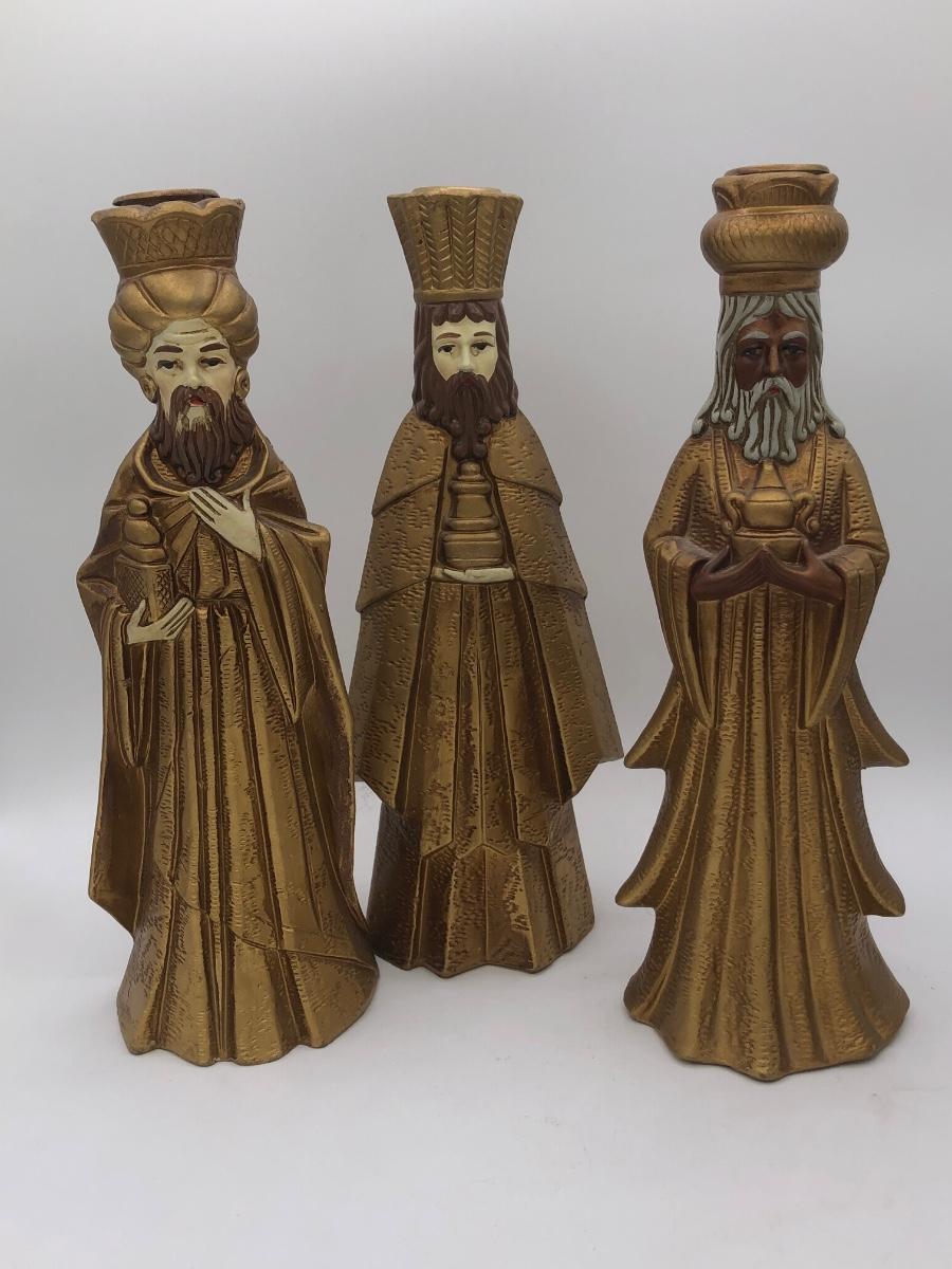 LOT 95D: 1960s/70s MCM 3 Kings Nativity Gold Color Candle Stick Holders, 1980 Fleetwood "The Magi" by Fritz Wigner Plate & 2 Unused Vintage 3 Kings / Wise Men Pillar Holiday Candles