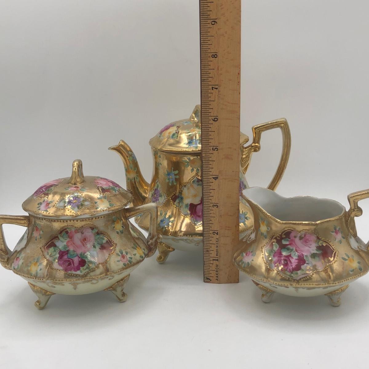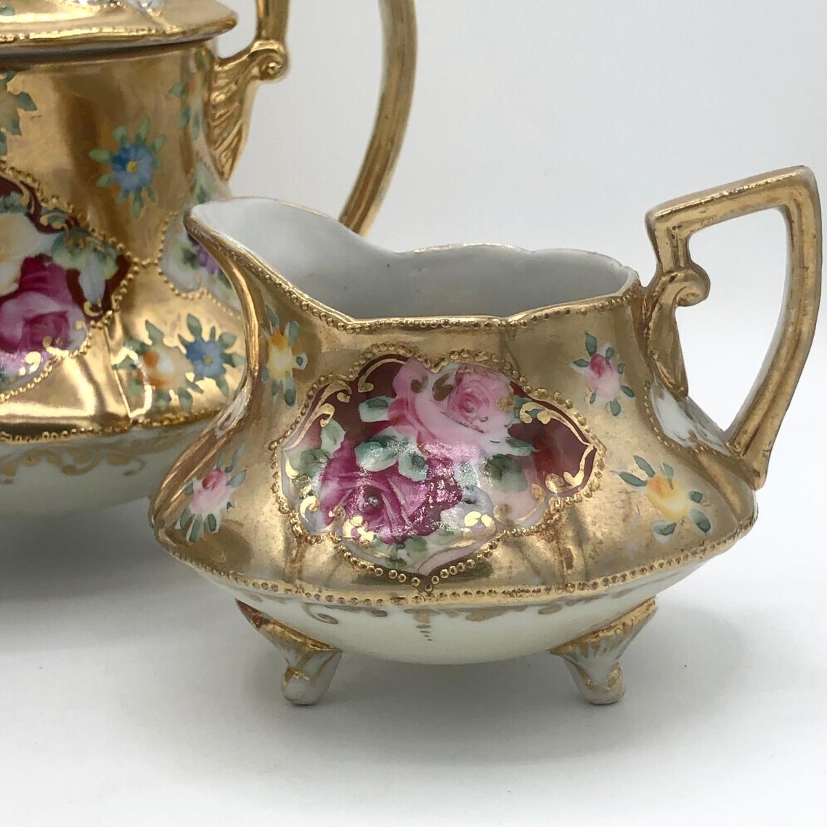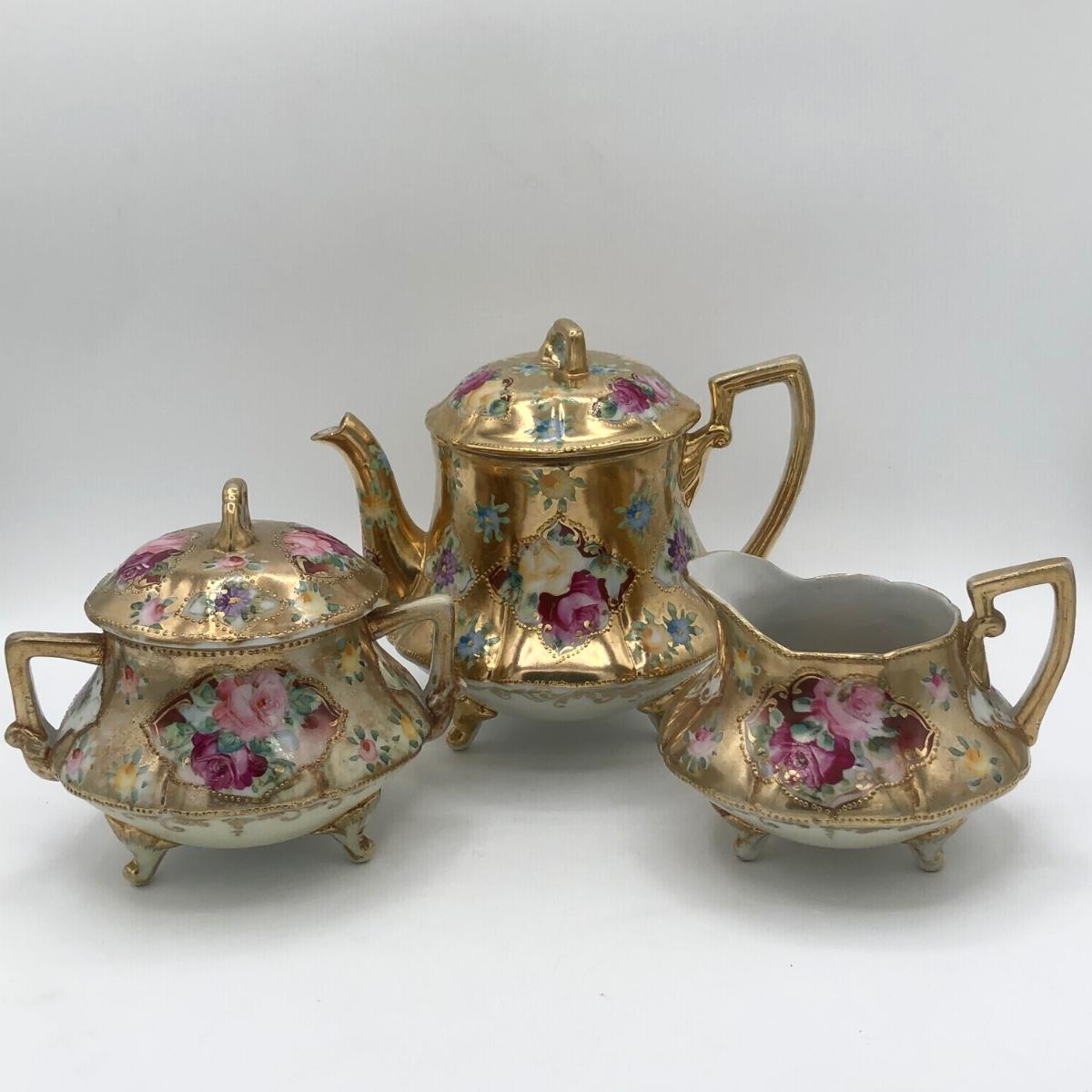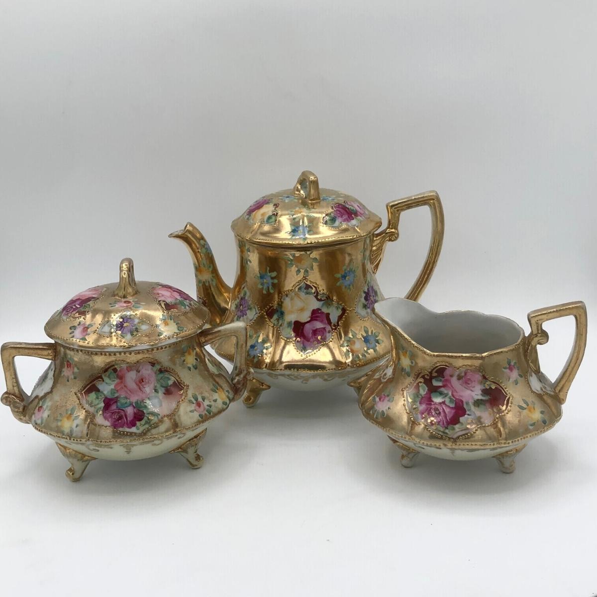 LOT 103D: Antique 1914 Hand Painted Nippon Gold Decorated Pink Rose Floral Tea Service Set - Tea Pot, Sugar Bowl & Cream Pitcher