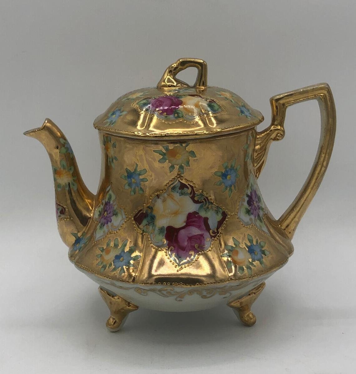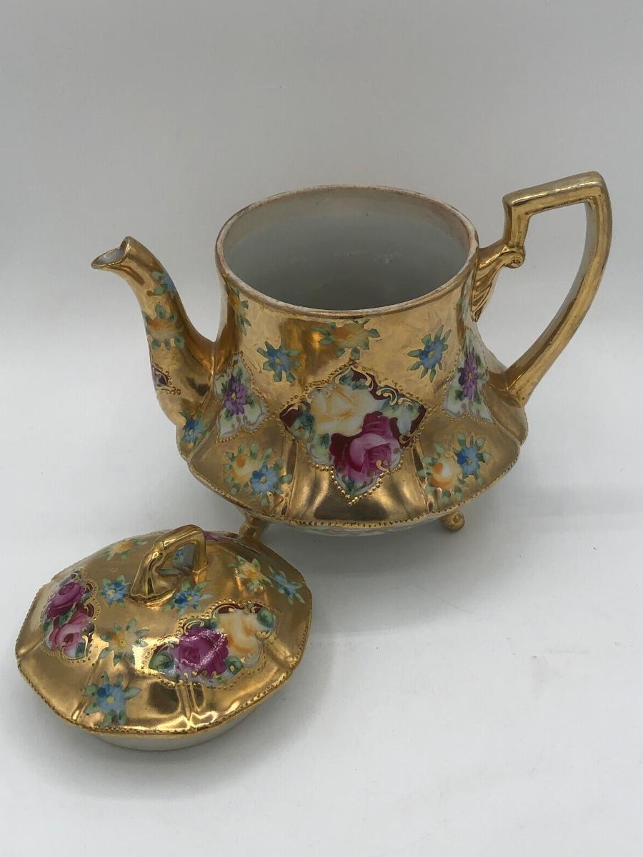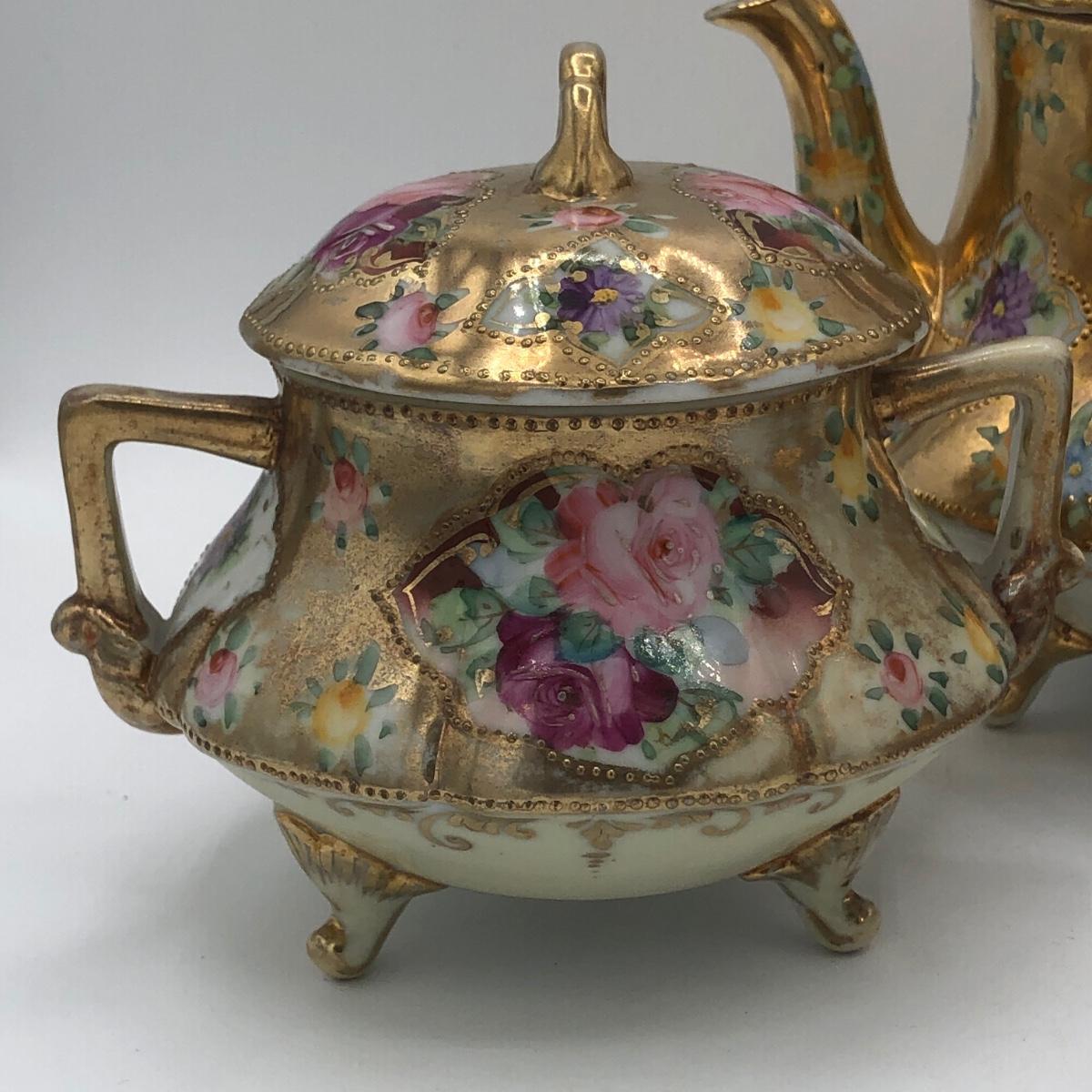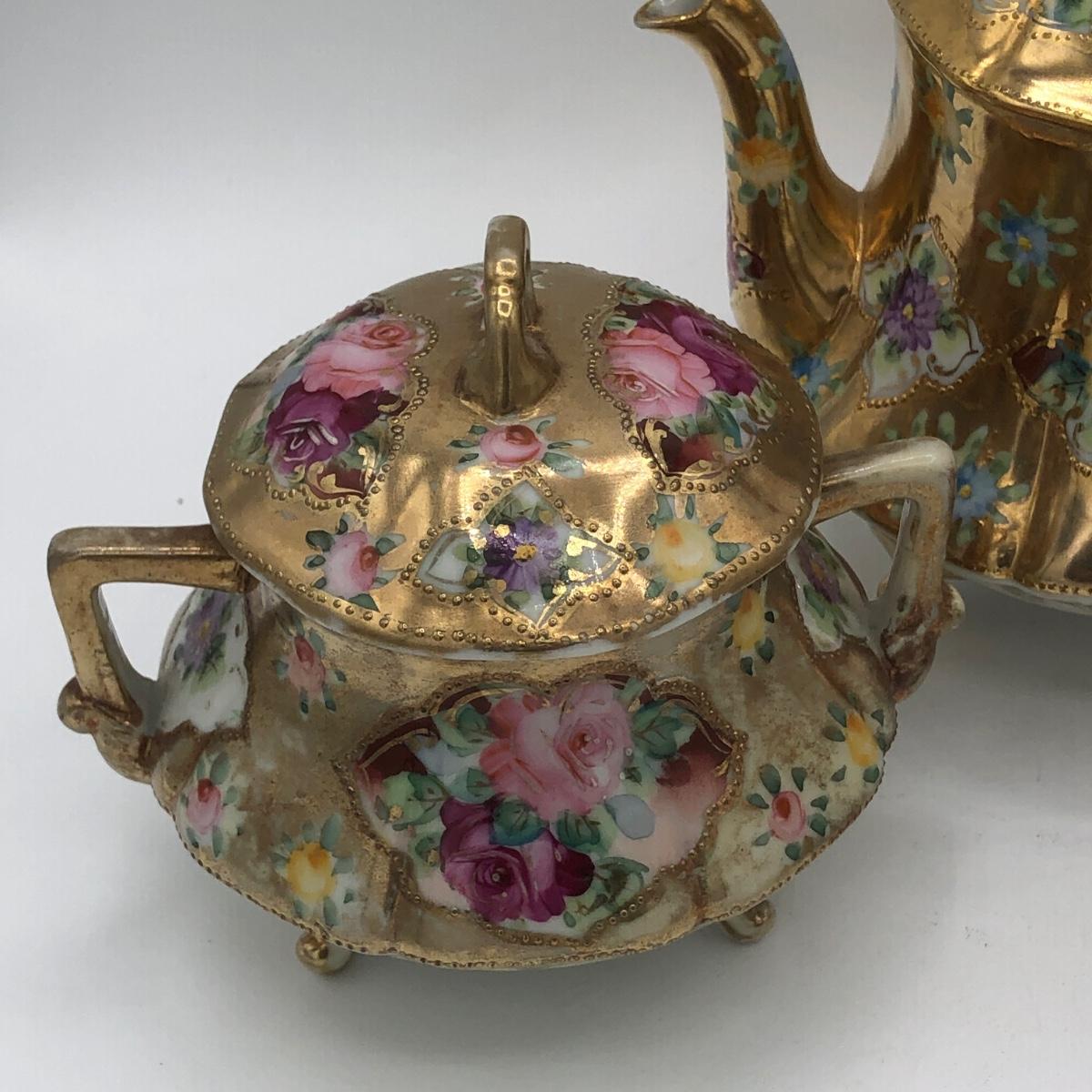 LOT 103D: Antique 1914 Hand Painted Nippon Gold Decorated Pink Rose Floral Tea Service Set - Tea Pot, Sugar Bowl & Cream Pitcher