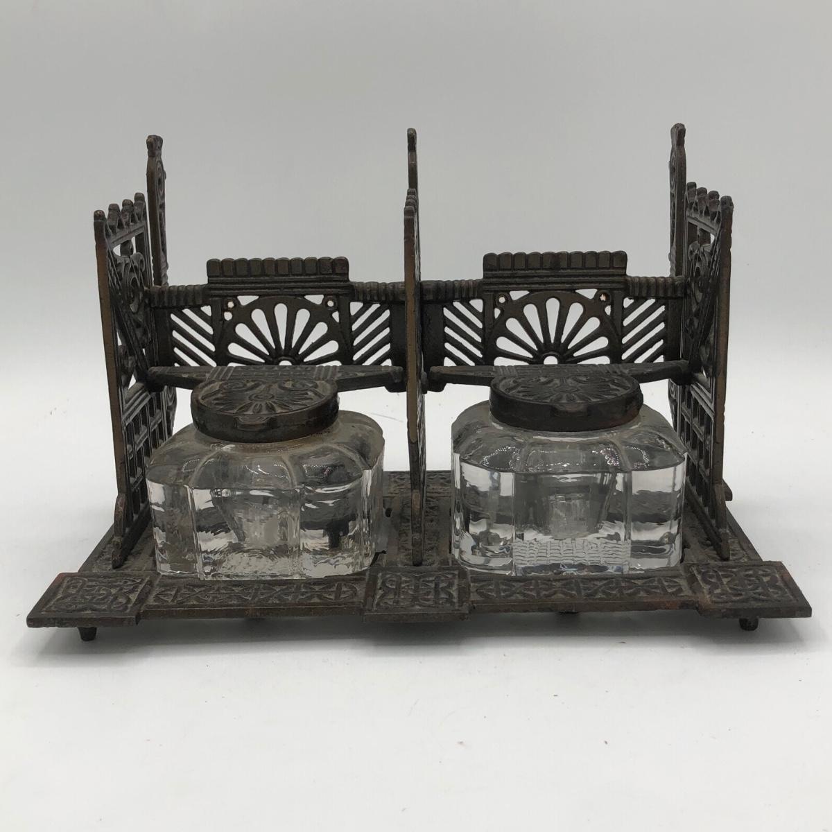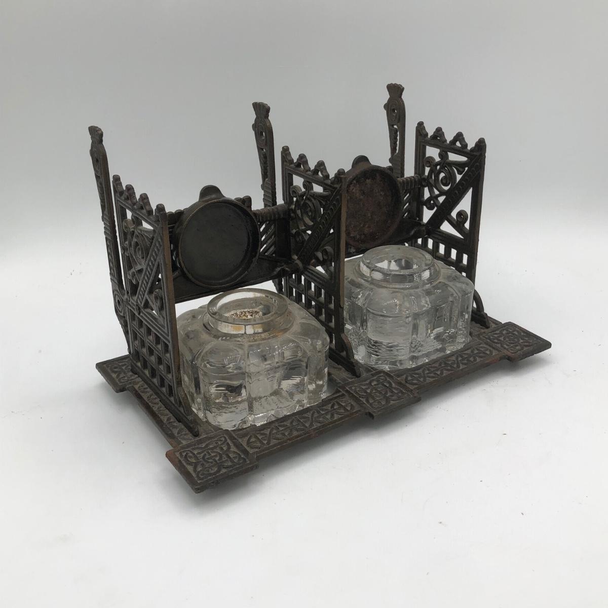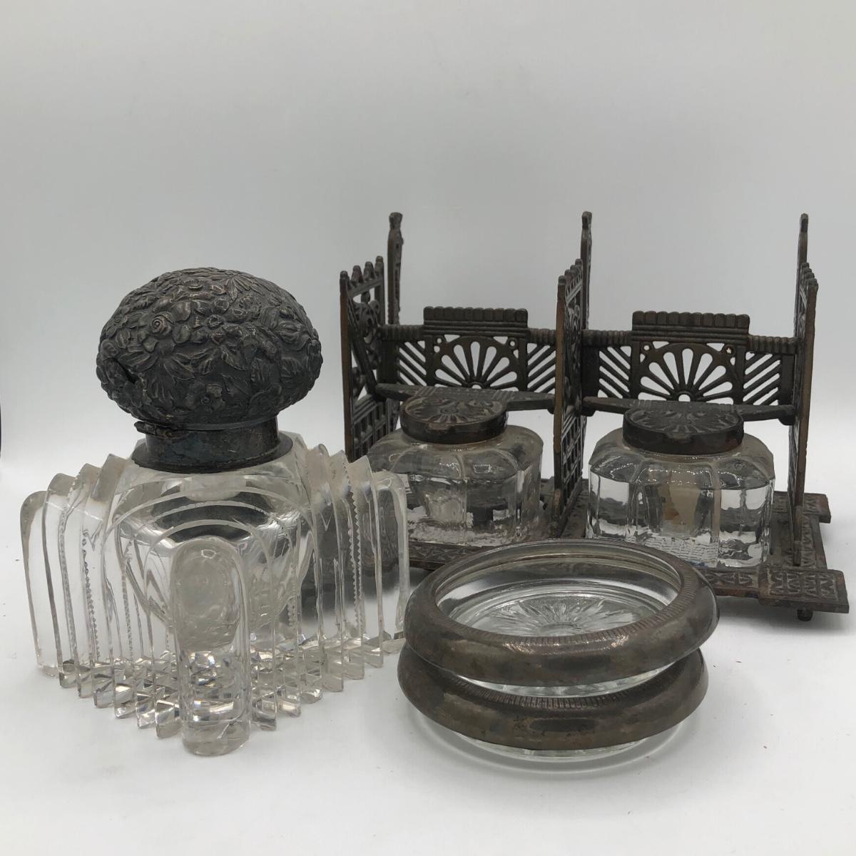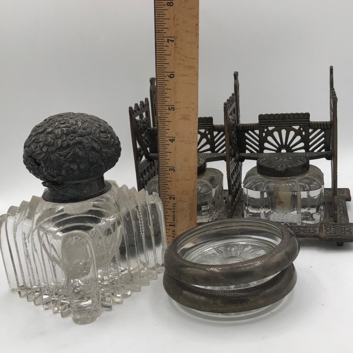 LOT 109D: Antique Victorian Cast Iron Double Inkwell, Large Antique Crystal Inkwell w/ Sterling Silver Lid & More