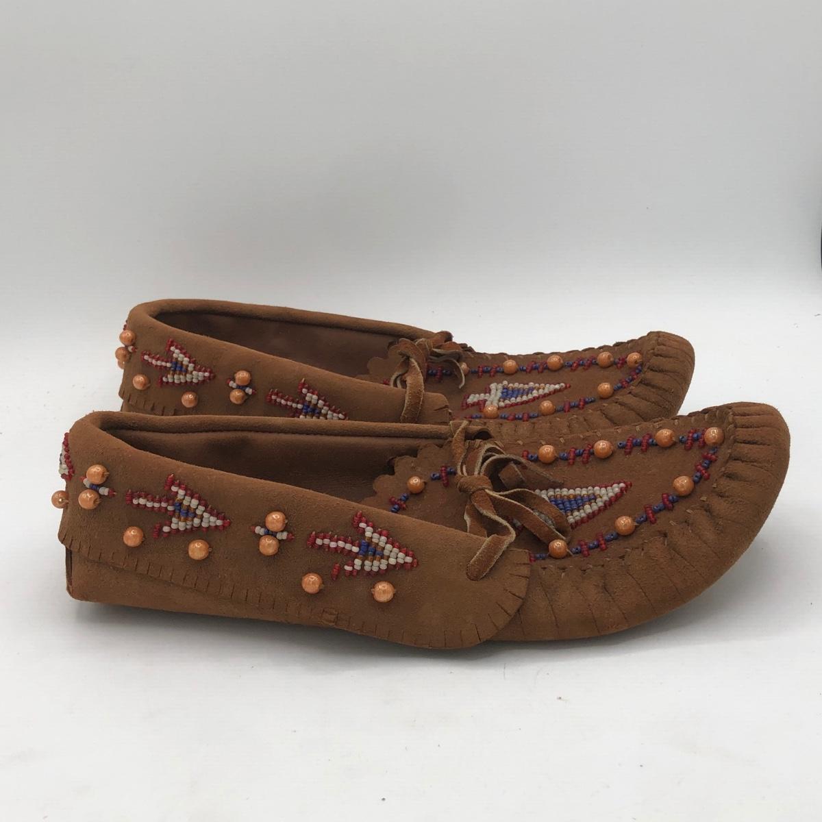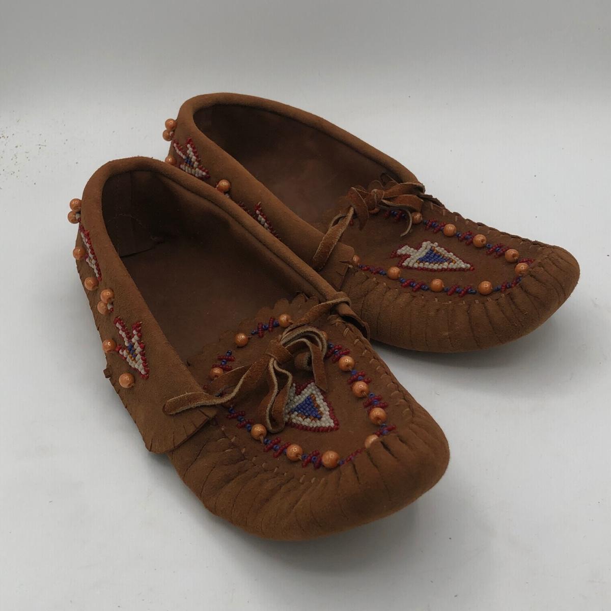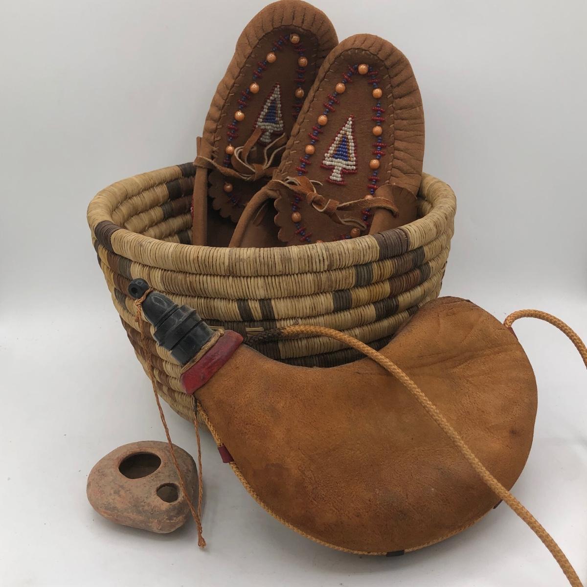 LOT 116D: Native American Woven Llama Basket, Beaded Moccasins, Leather Suede Flask & Carved Stone Whistle