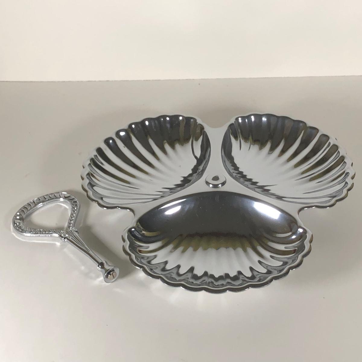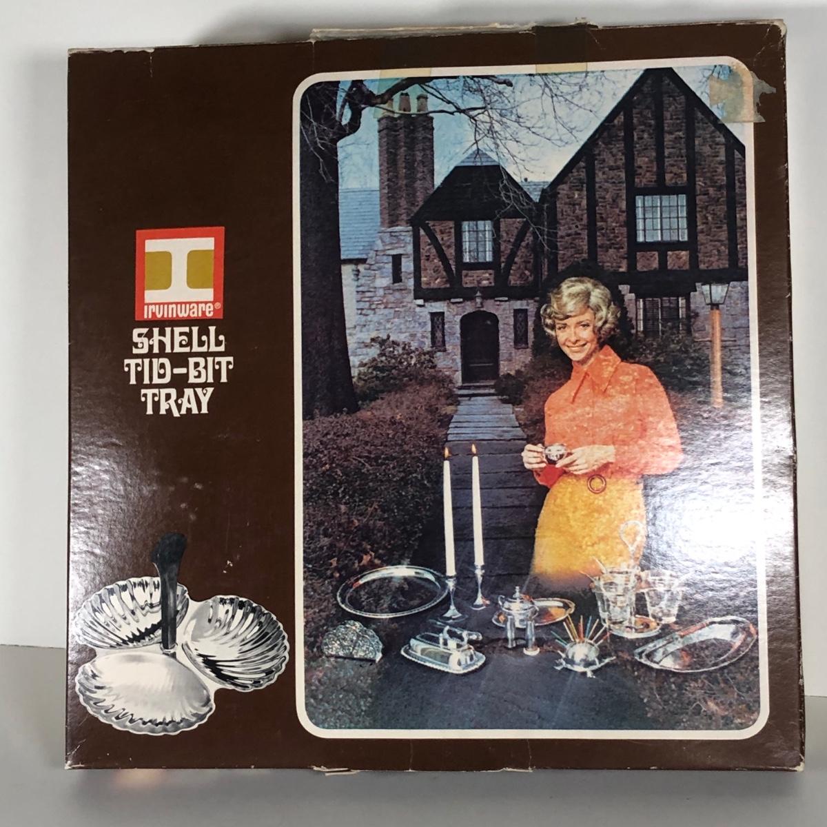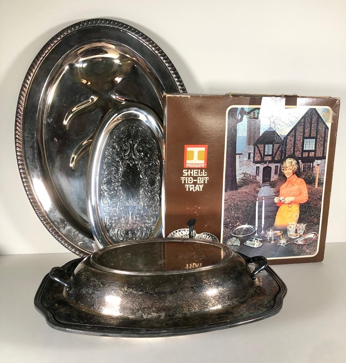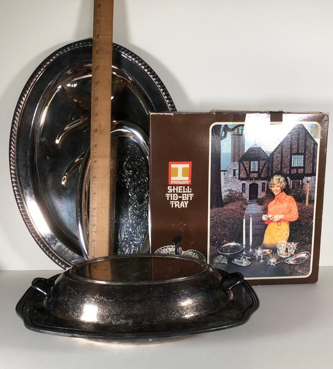 LOT 122D: Irvinware Shell Tidbit Tray w/ Box, Norfolk Rogers 6912 Lidded Serving Dish, Silver Plate Meat Tray & More