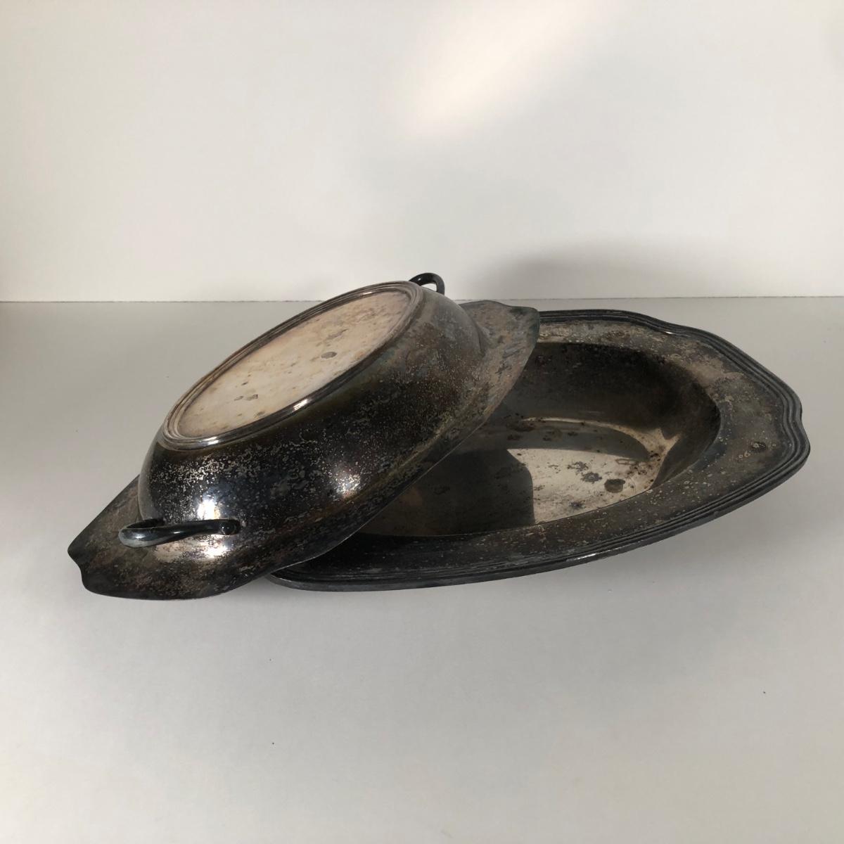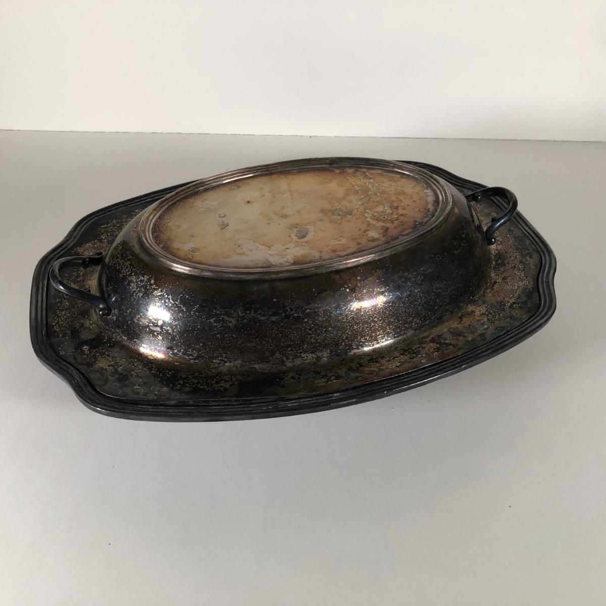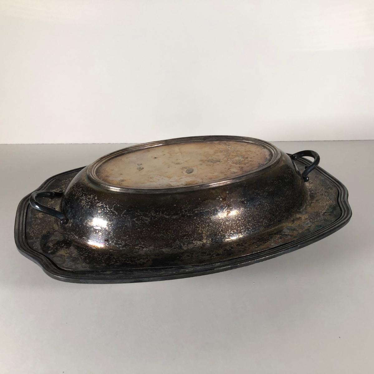 LOT 122D: Irvinware Shell Tidbit Tray w/ Box, Norfolk Rogers 6912 Lidded Serving Dish, Silver Plate Meat Tray & More
