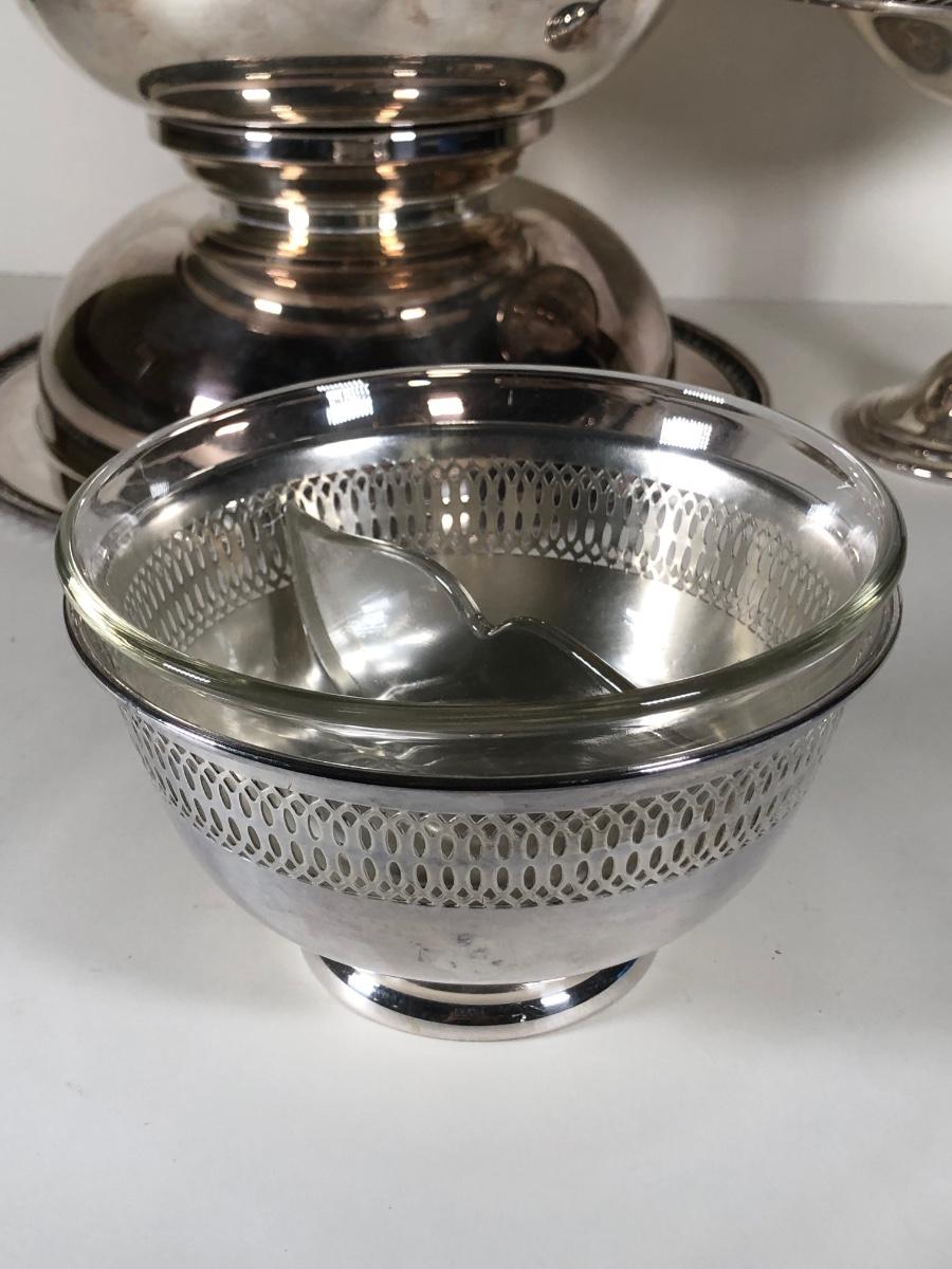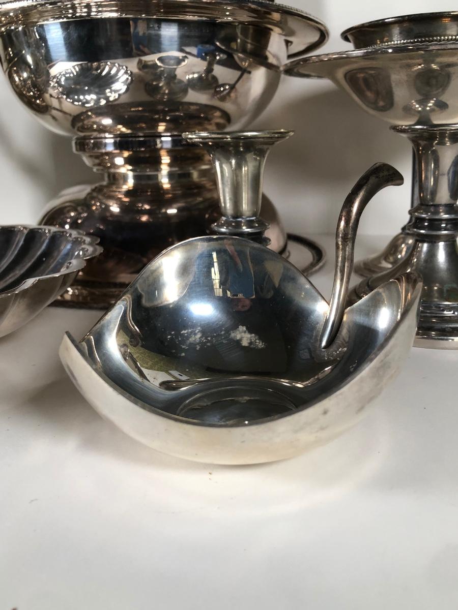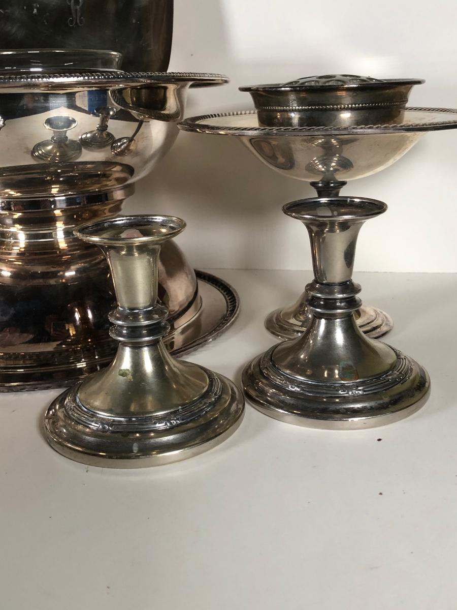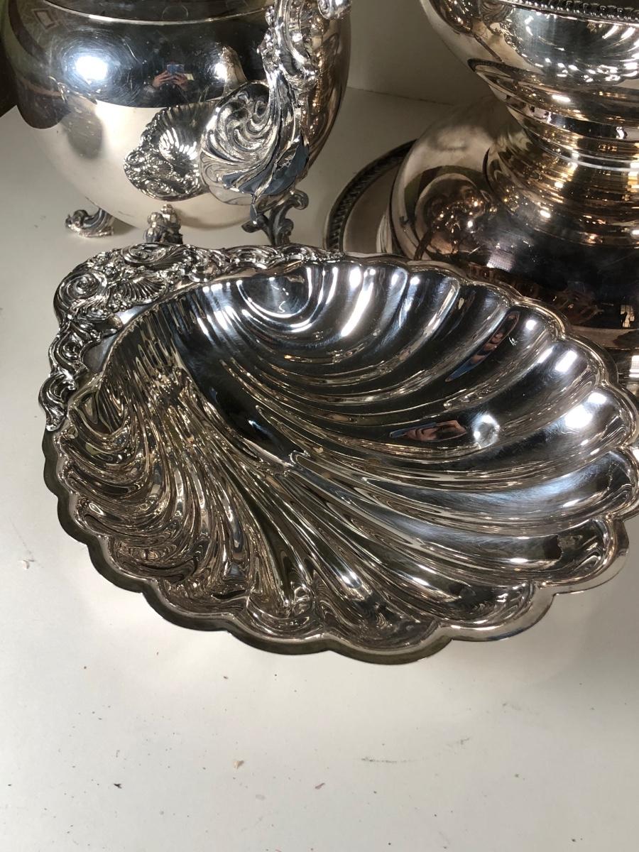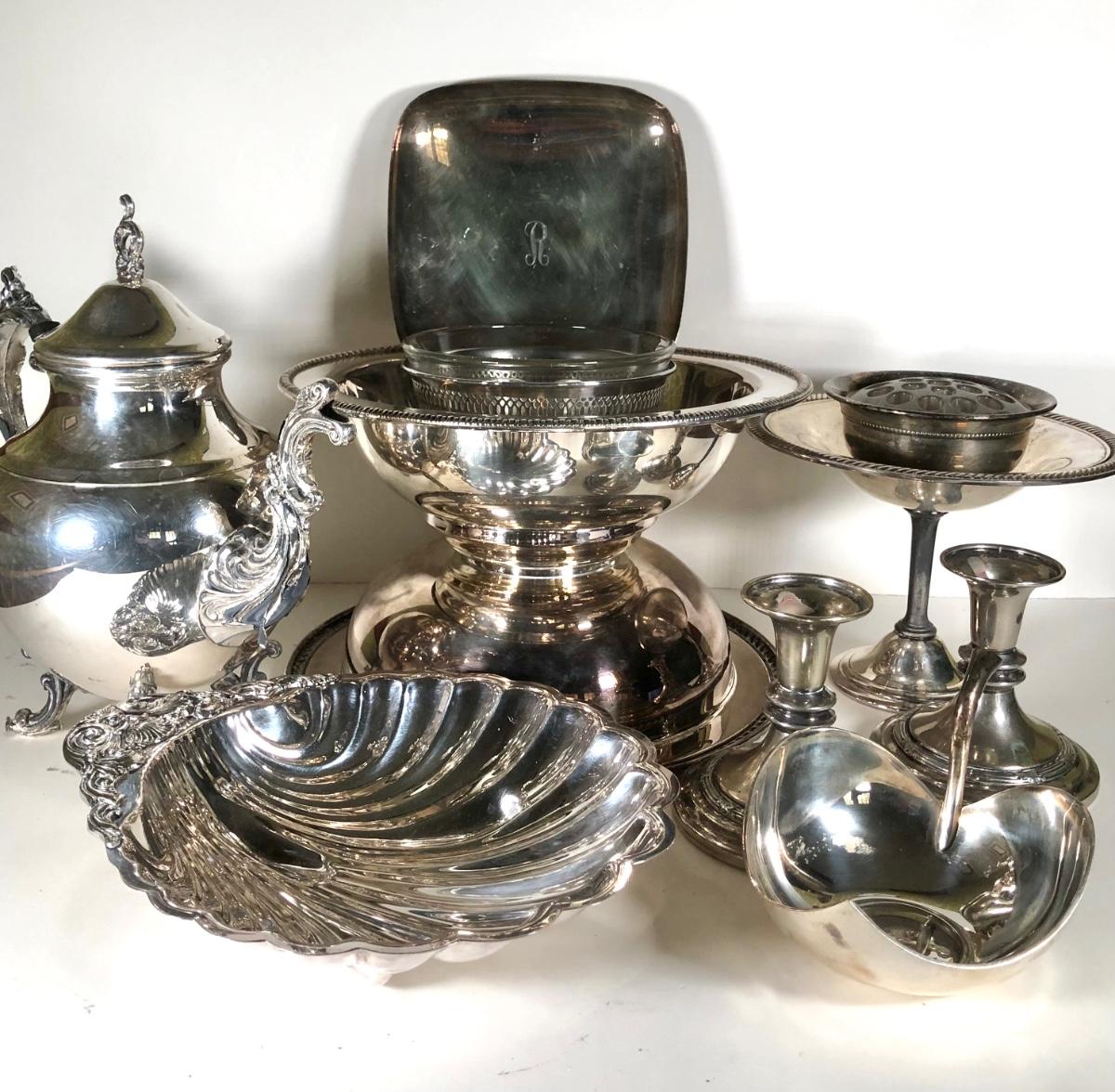 LOT 124D: Vintage Silver Plate - FB Rogers Silver Co Shell Dish 1630, Teapot 1960, Bowl w/ Glass Insert, WMM EPSN Candlestick Holders 1558, Falstaff Bowl w/ Glass Flower Frog