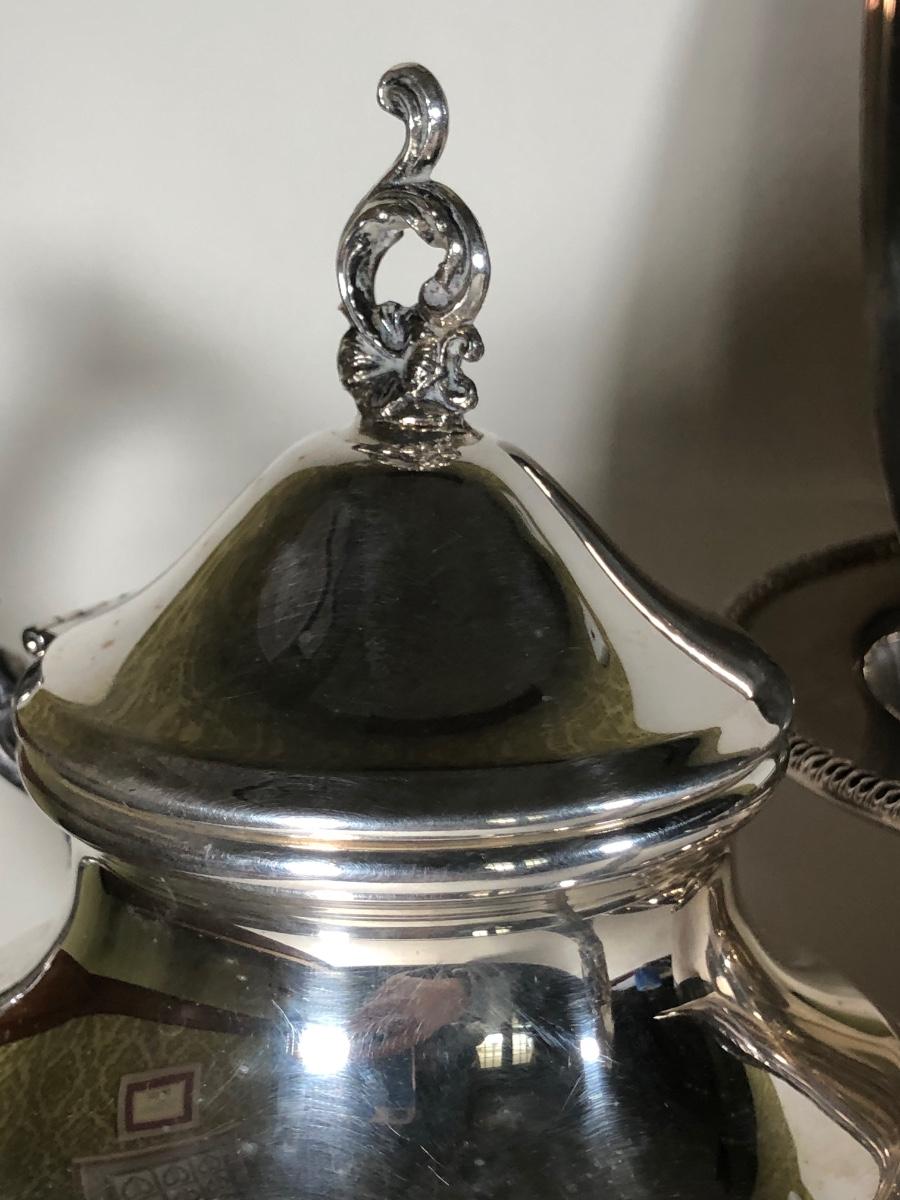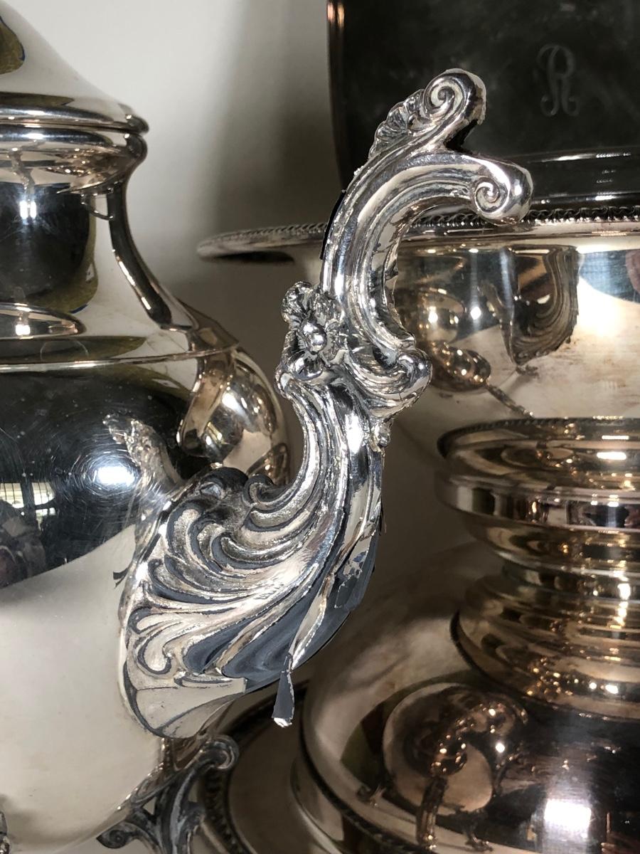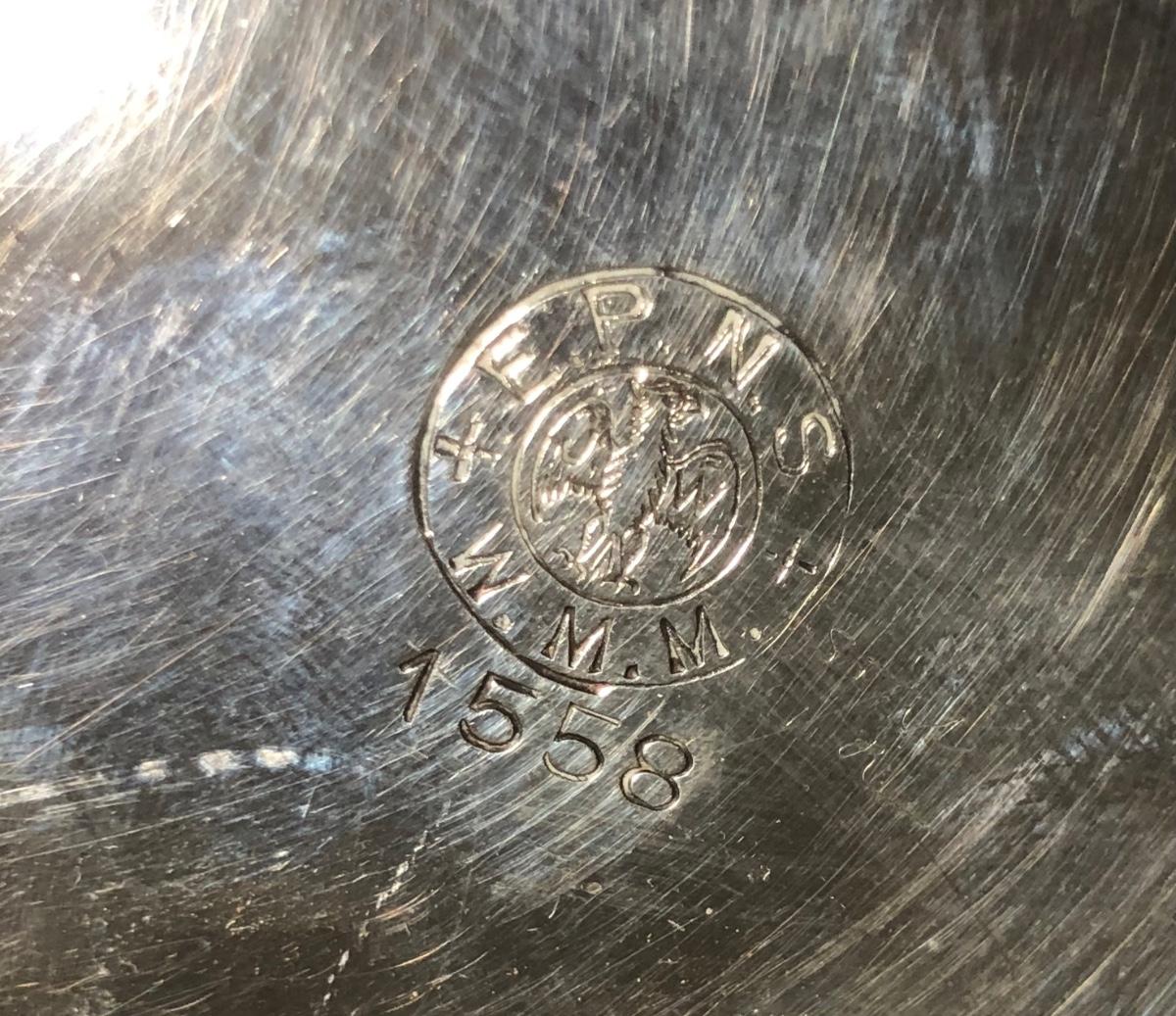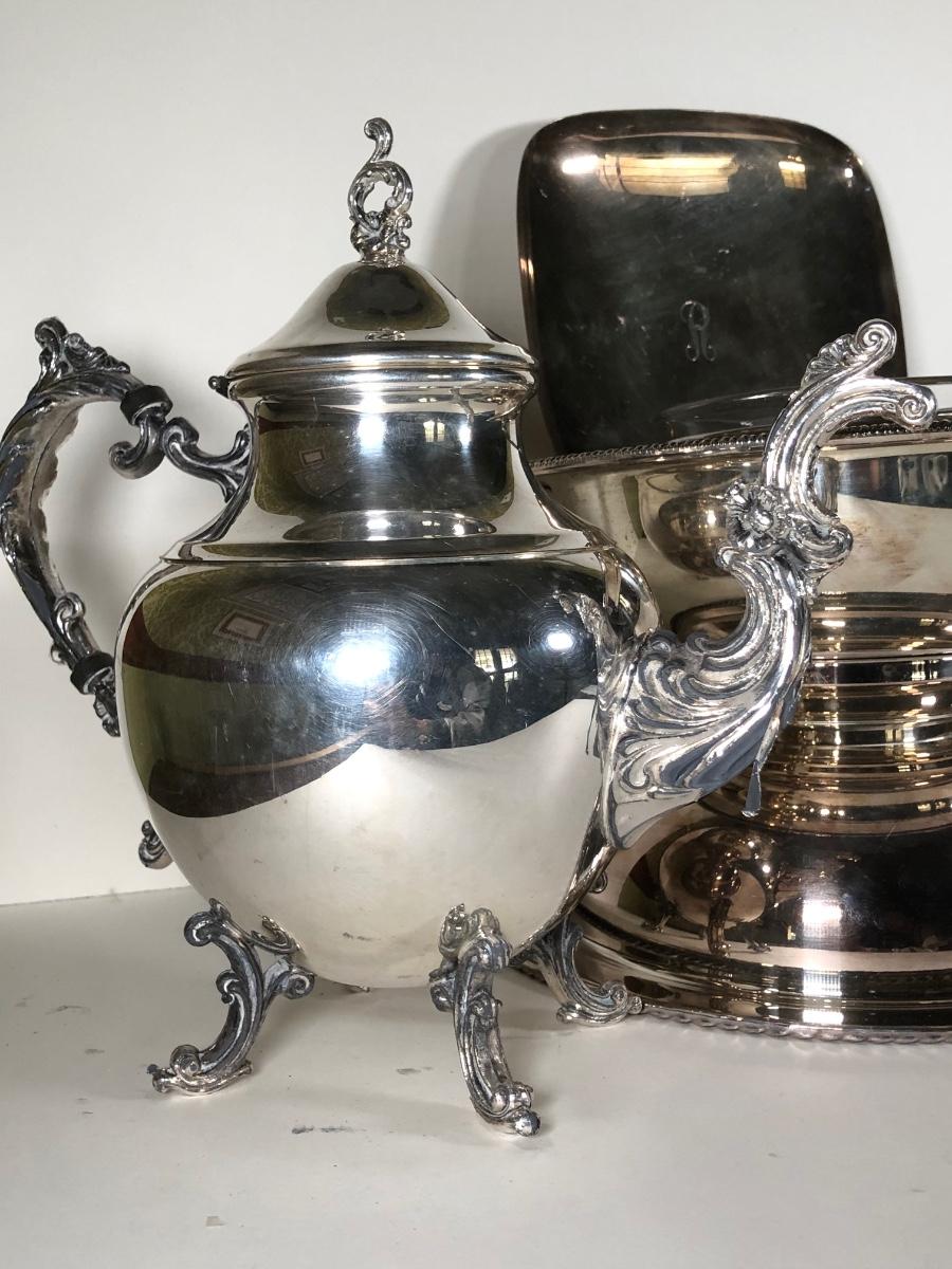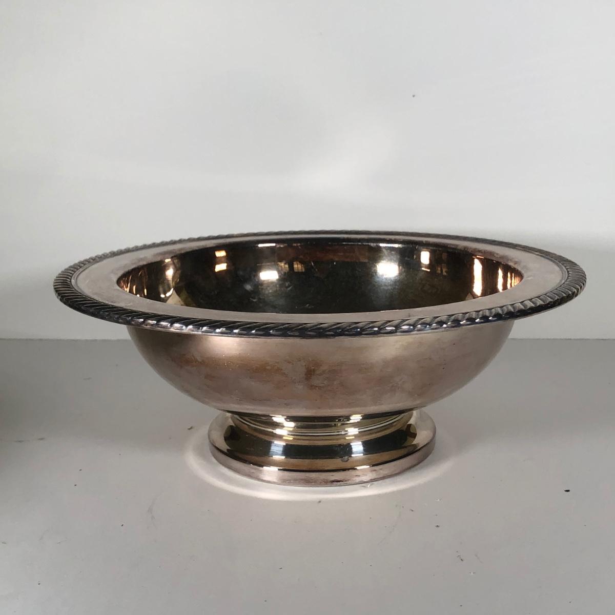 LOT 124D: Vintage Silver Plate - FB Rogers Silver Co Shell Dish 1630, Teapot 1960, Bowl w/ Glass Insert, WMM EPSN Candlestick Holders 1558, Falstaff Bowl w/ Glass Flower Frog