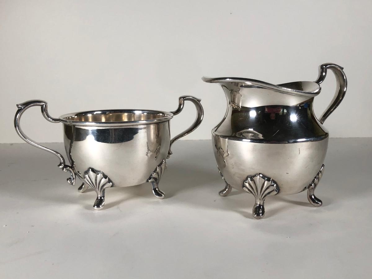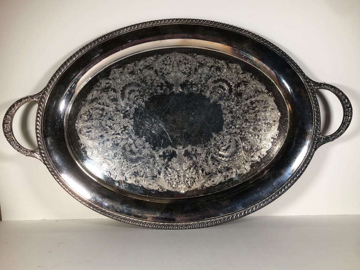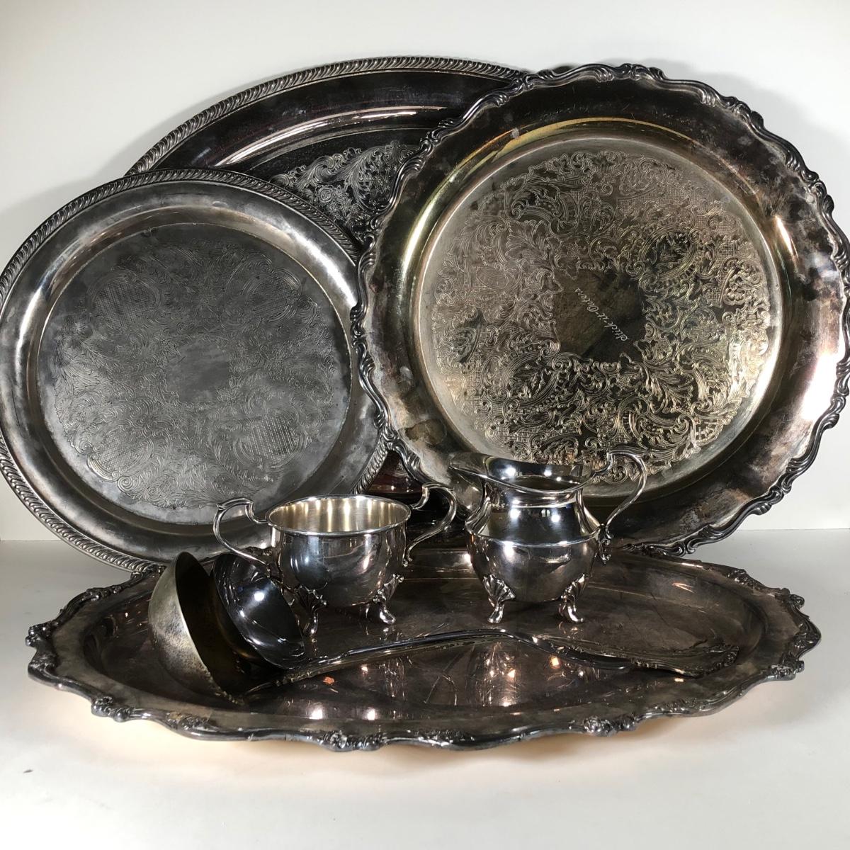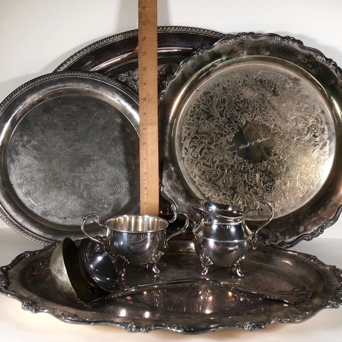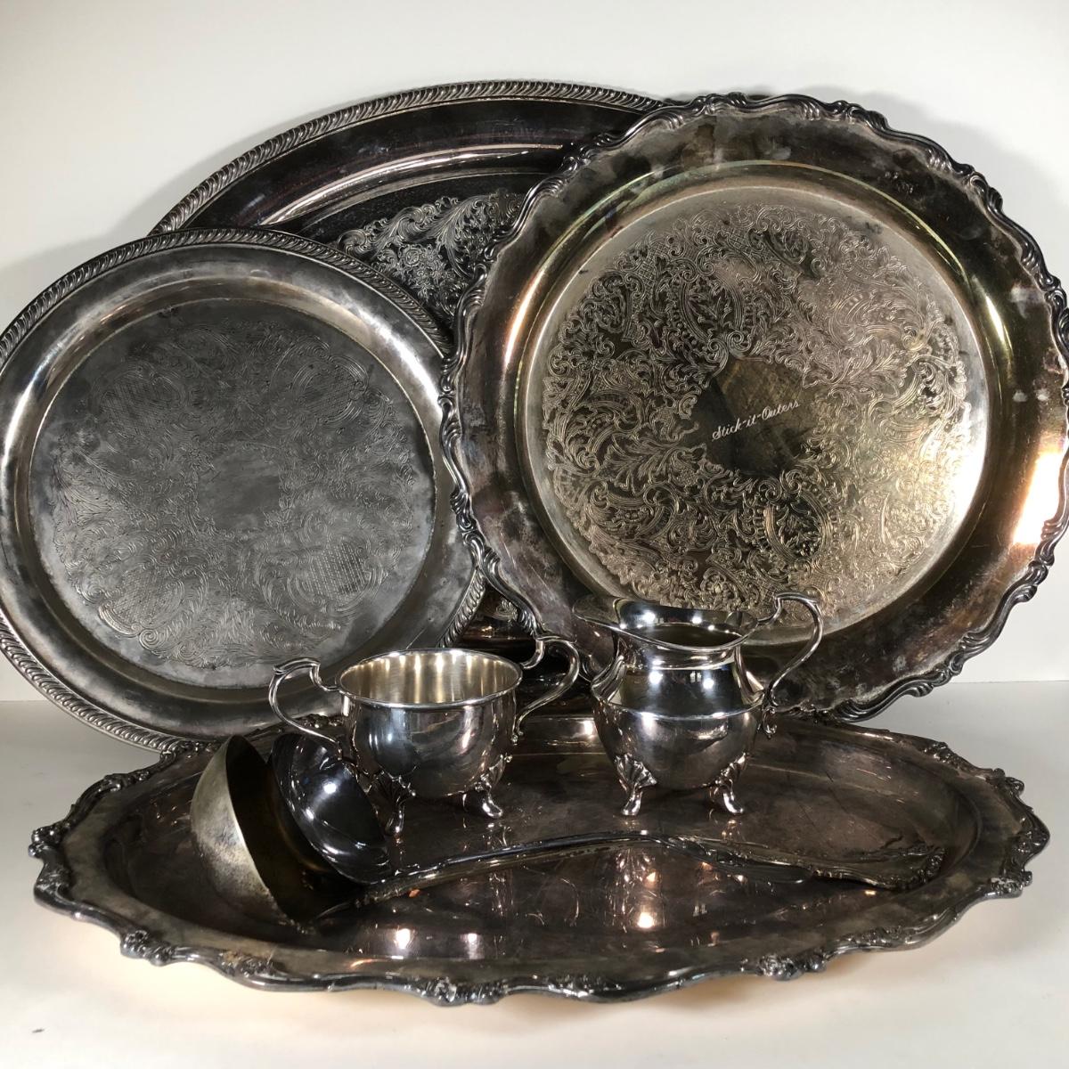 LOT 125D: Vintage Silverplate - Webster Wilcox Holloware, Oneida Platter Engraved "Stick-it-Outers", International Silver Co, Wm Rogers 881, Poole Silver Co EPCA 2500 Sugar Bowl & Creamer & More