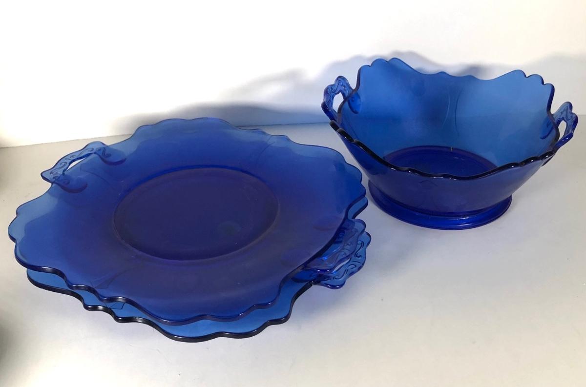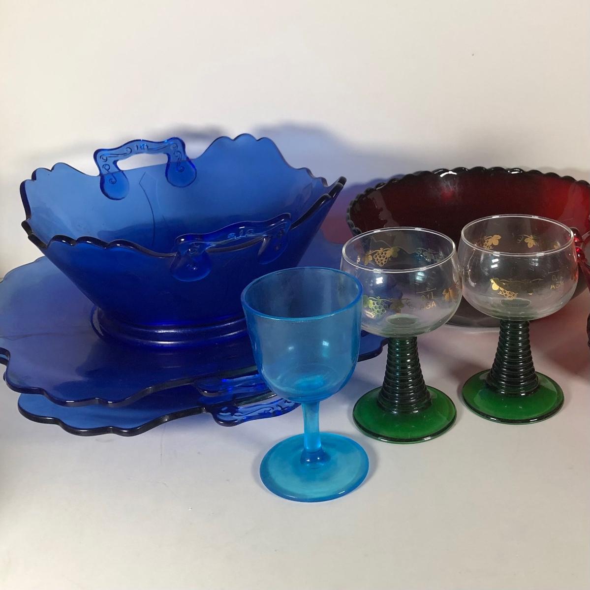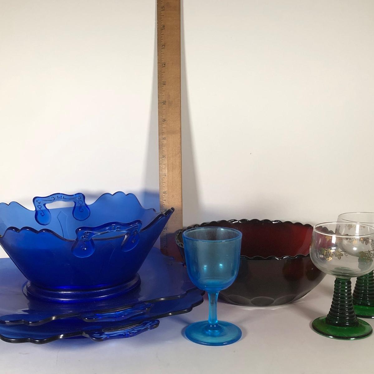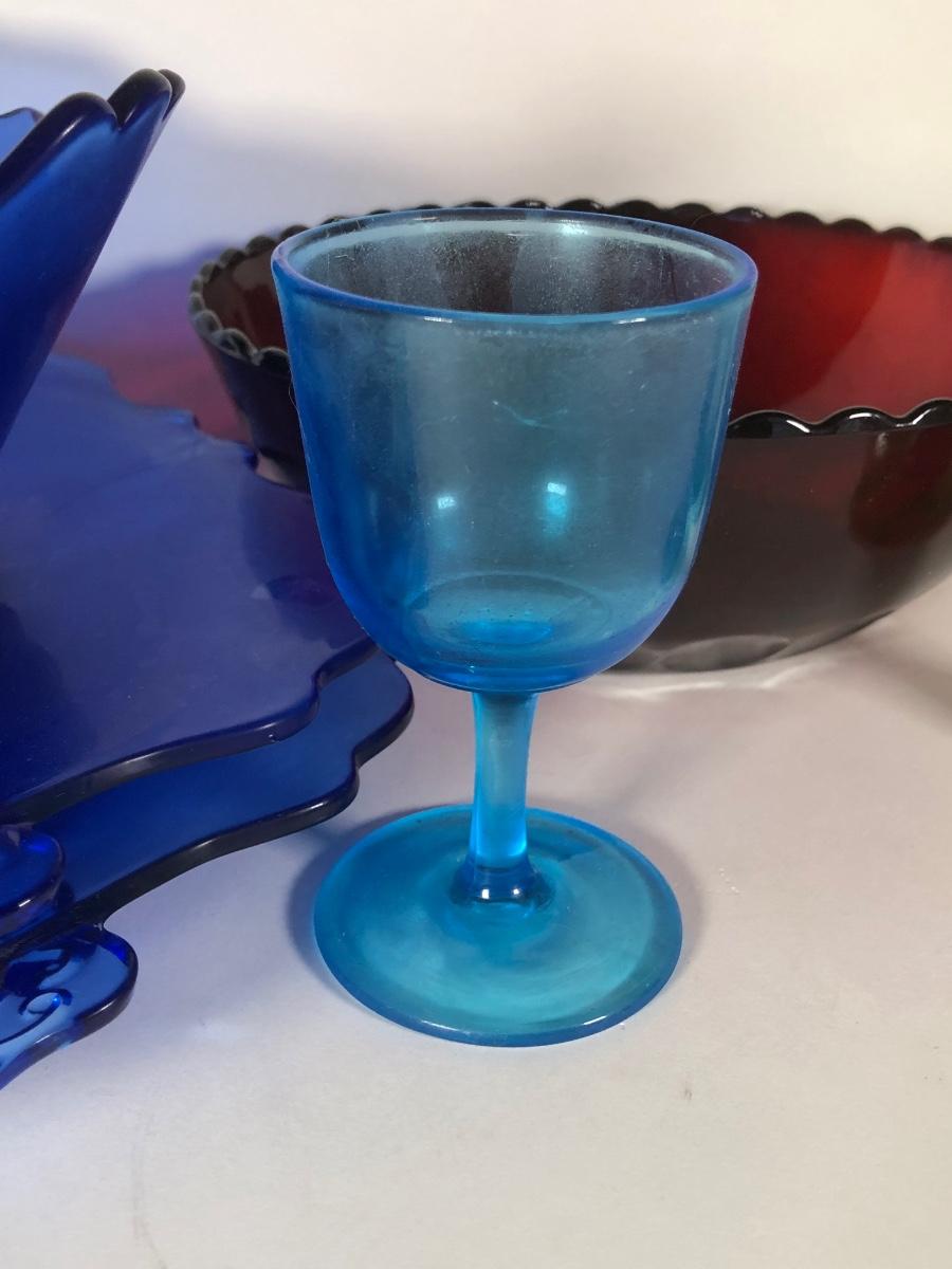 LOT 131K: Colorful Glassware - Vintage Luminaric Stem Beehive Glasses, L E Smith Mt Pleasant Cobalt Blue Cake Plates & Bowl & Ruffle Edge Ruby Bowl