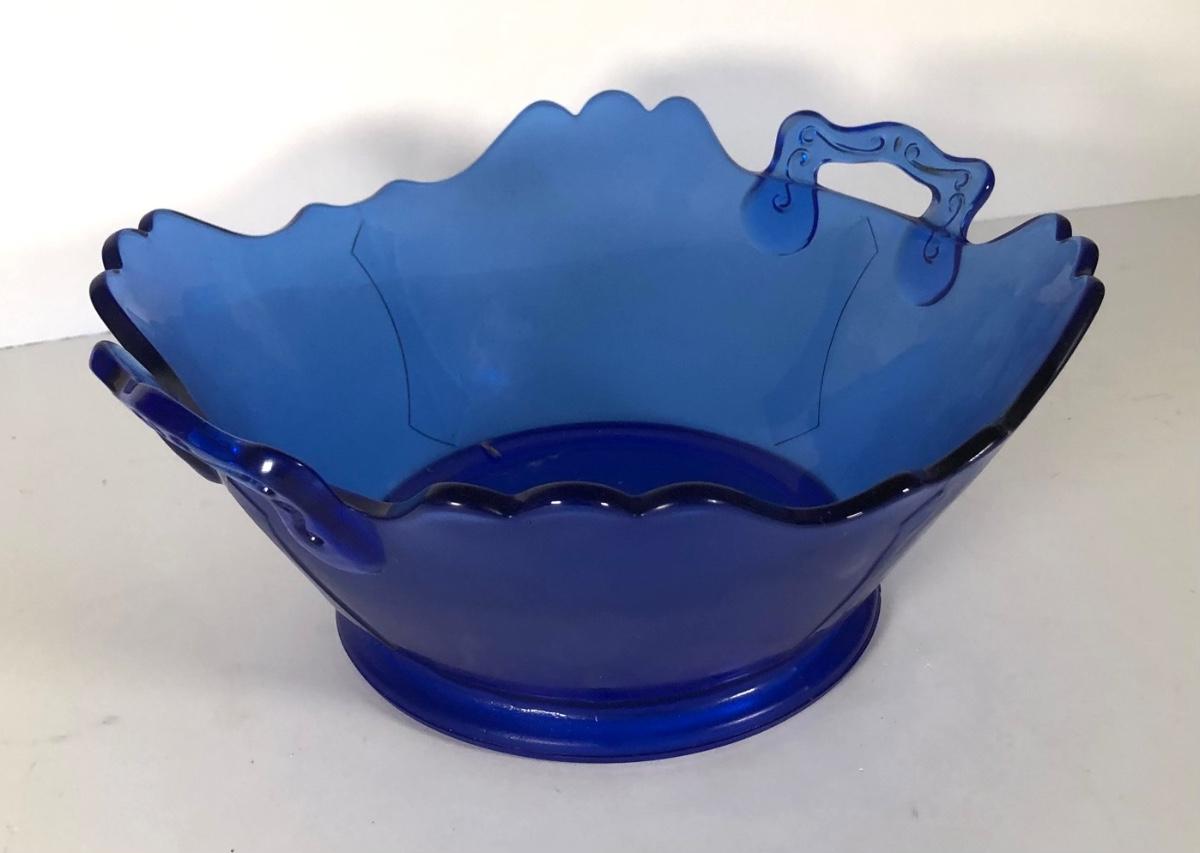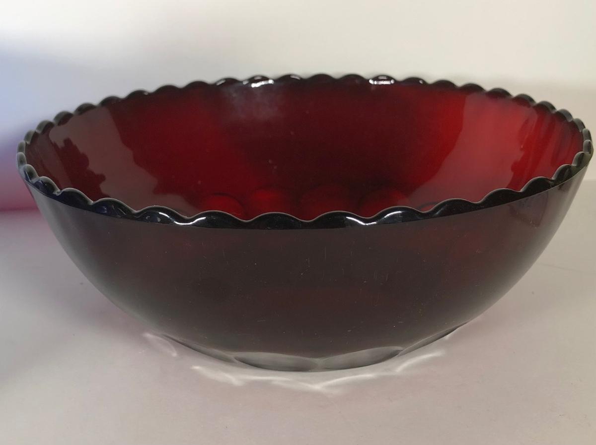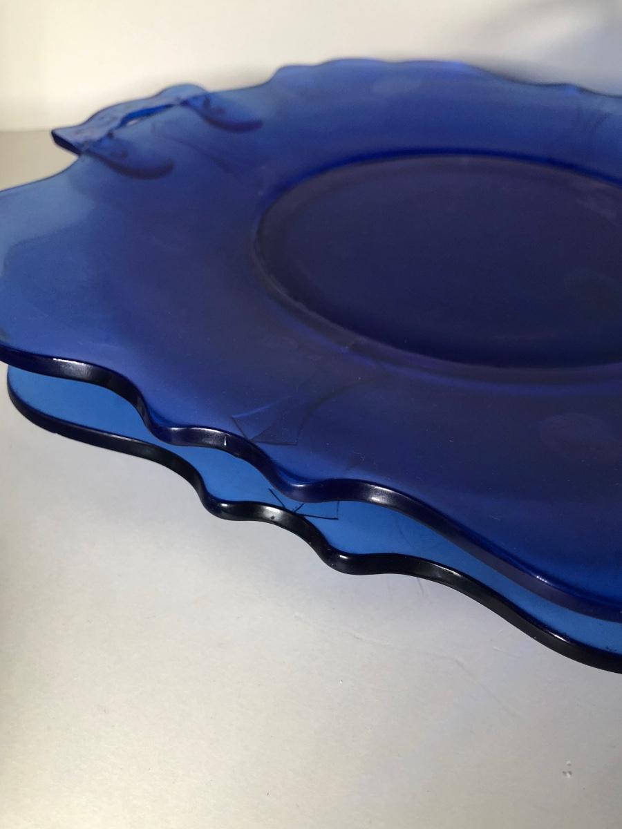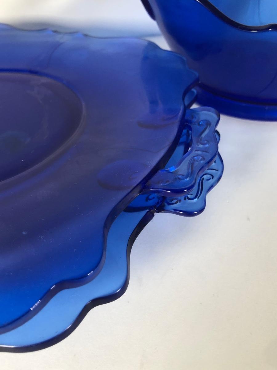 LOT 131K: Colorful Glassware - Vintage Luminaric Stem Beehive Glasses, L E Smith Mt Pleasant Cobalt Blue Cake Plates & Bowl & Ruffle Edge Ruby Bowl