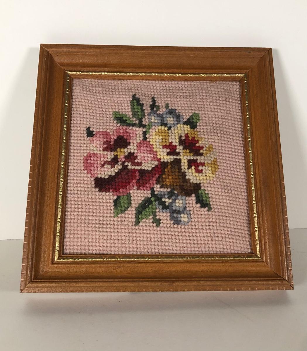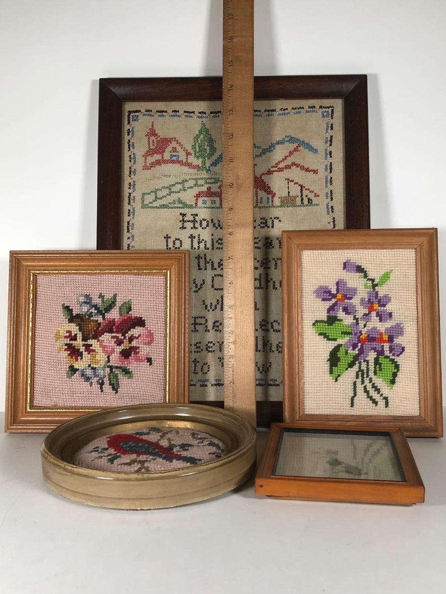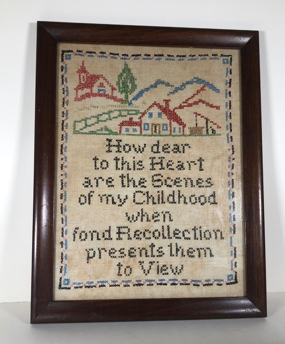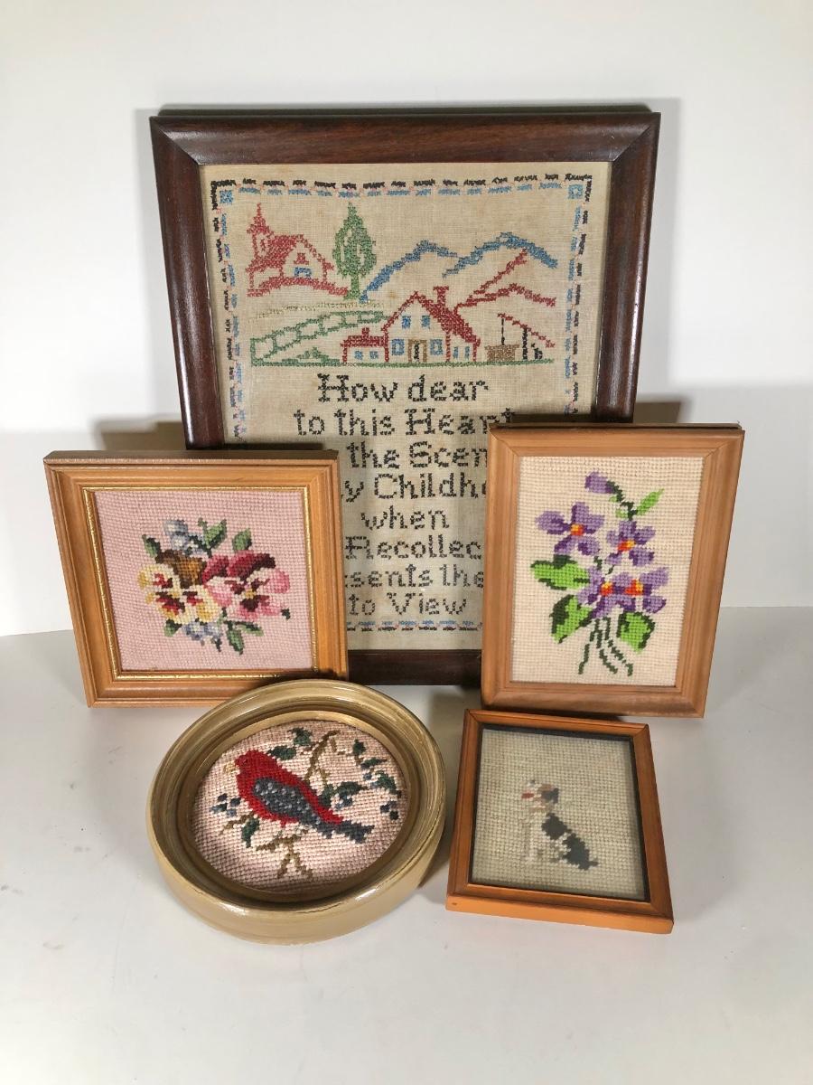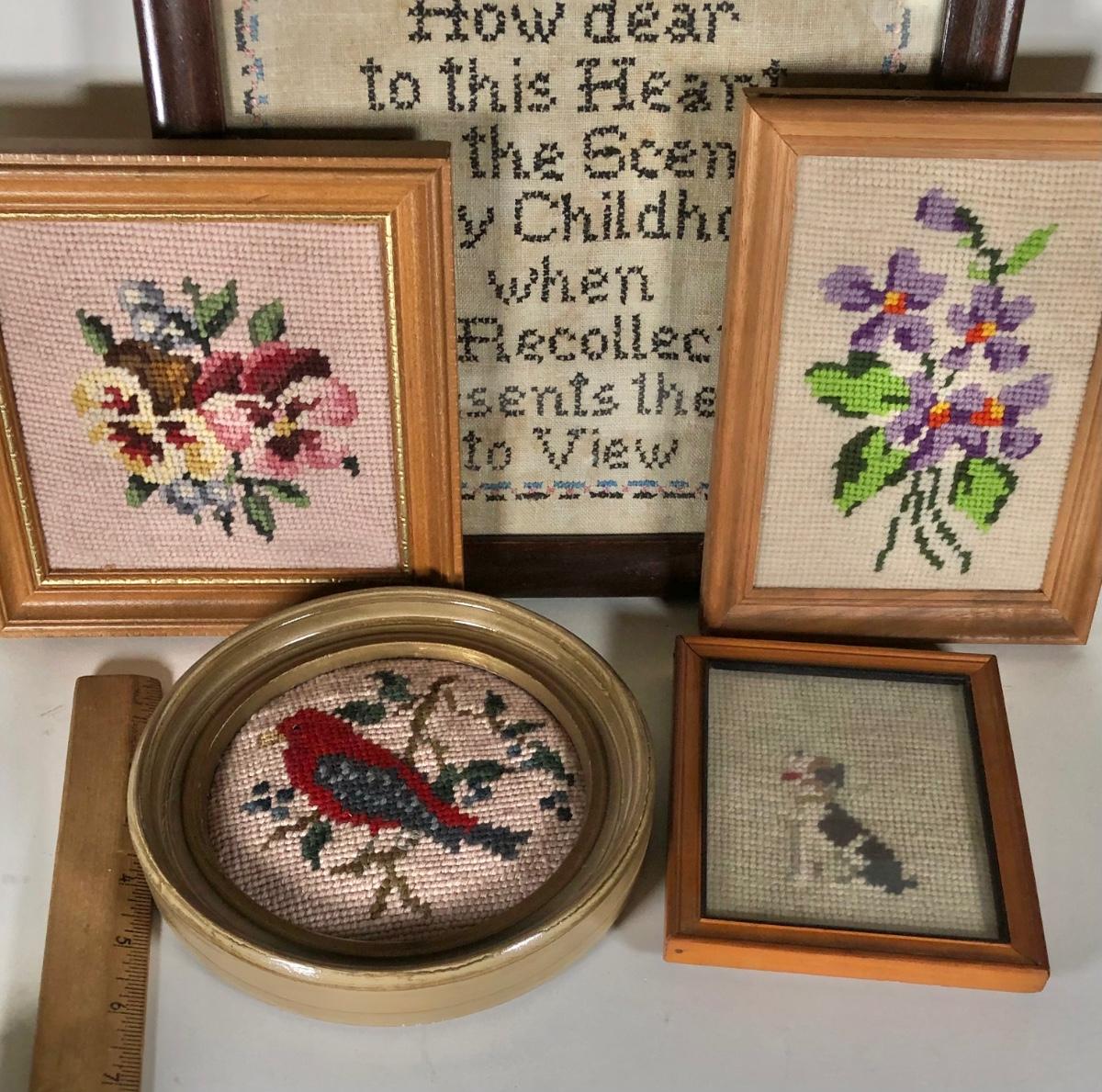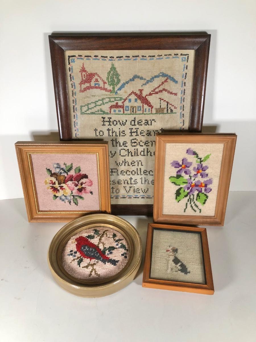 LOT 132D: Vintage Framed Cross Stitch / Needlepoint - 1946 Childhood Quote, Flowers, Dog & Cardinal