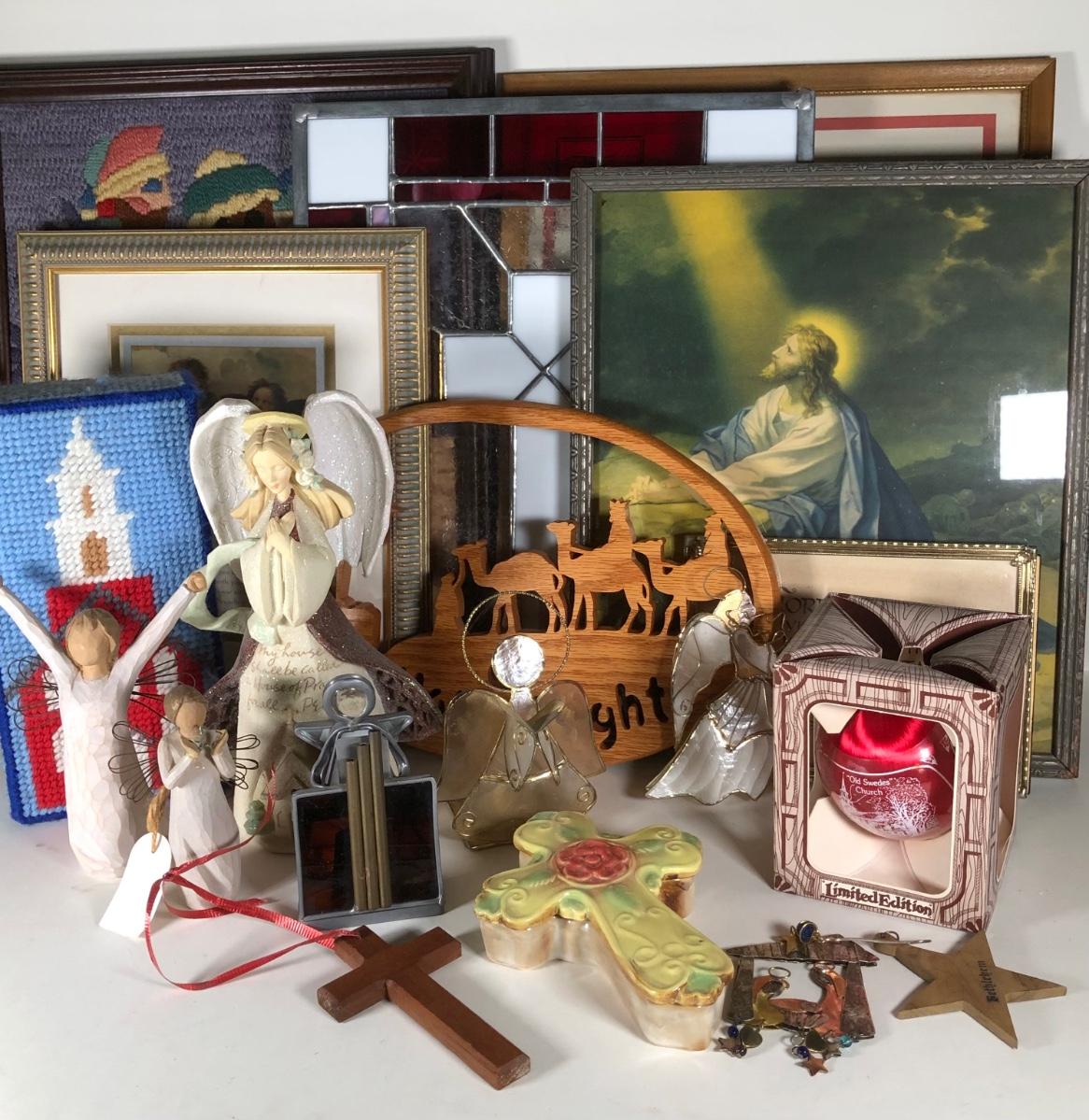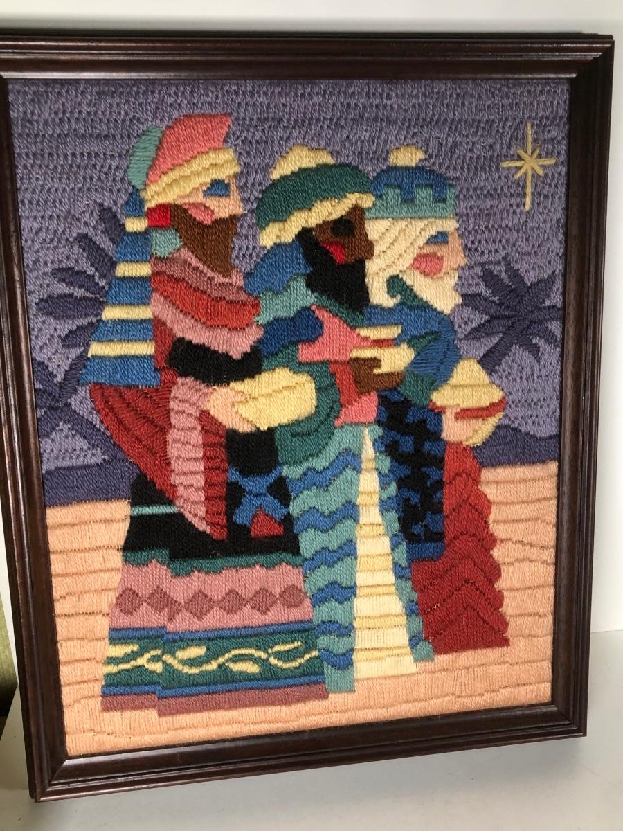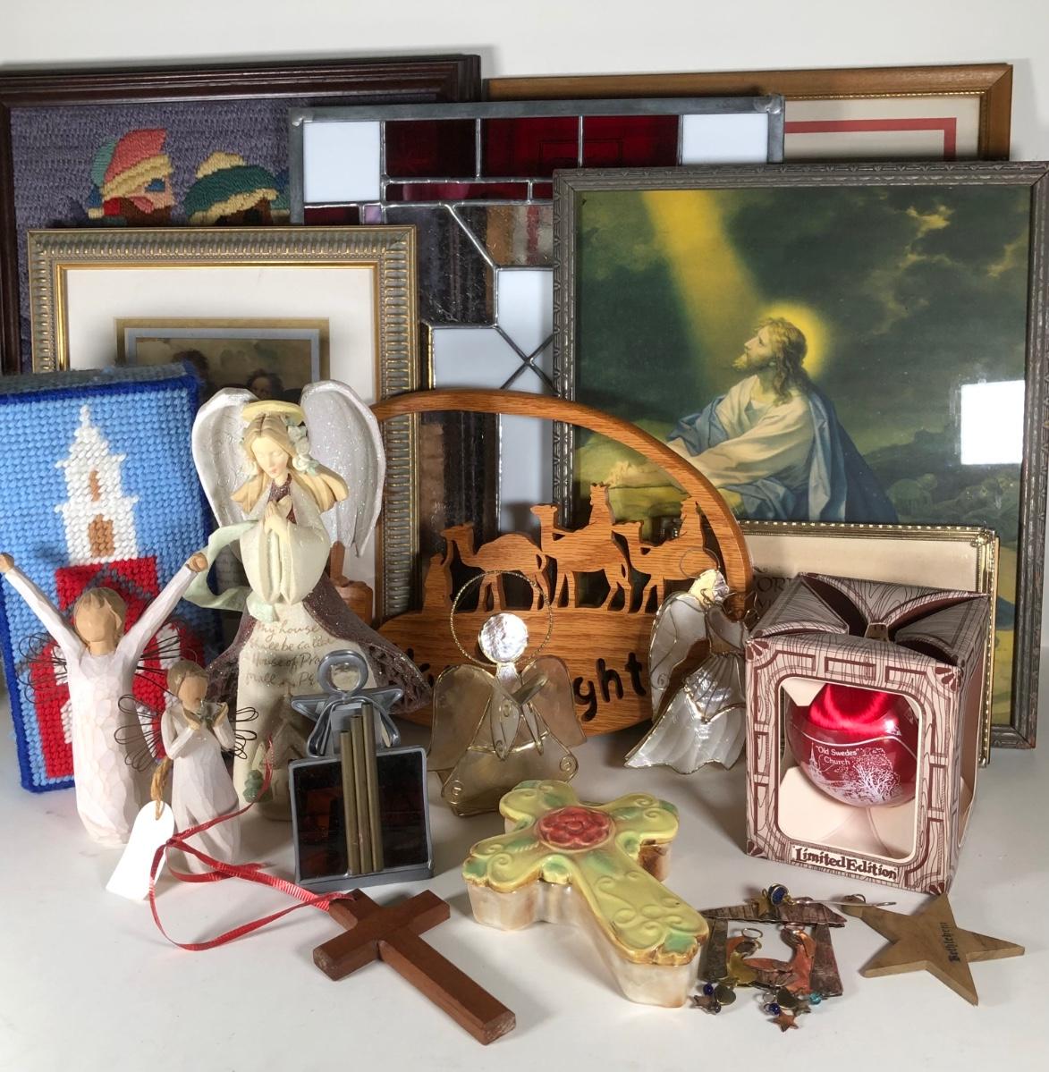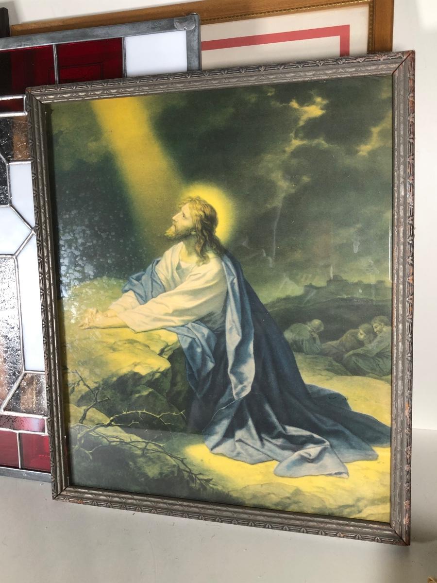 LOT 134D: Vintage Religious Home Decor - 1936 Framed Jesus Print, 3 Kings Embroidered Artwork, Stained Glass Cross, Brick from Trinity Church w/ Cover & More