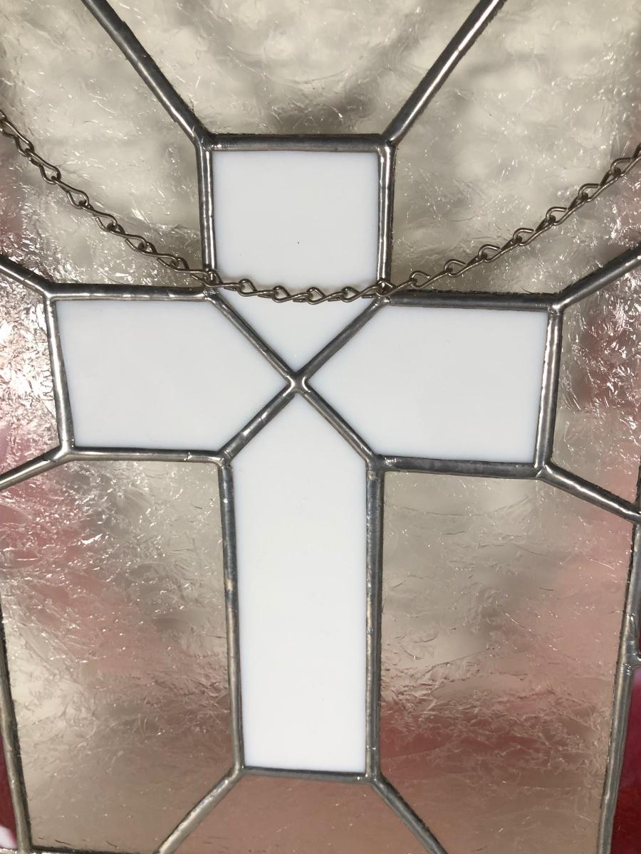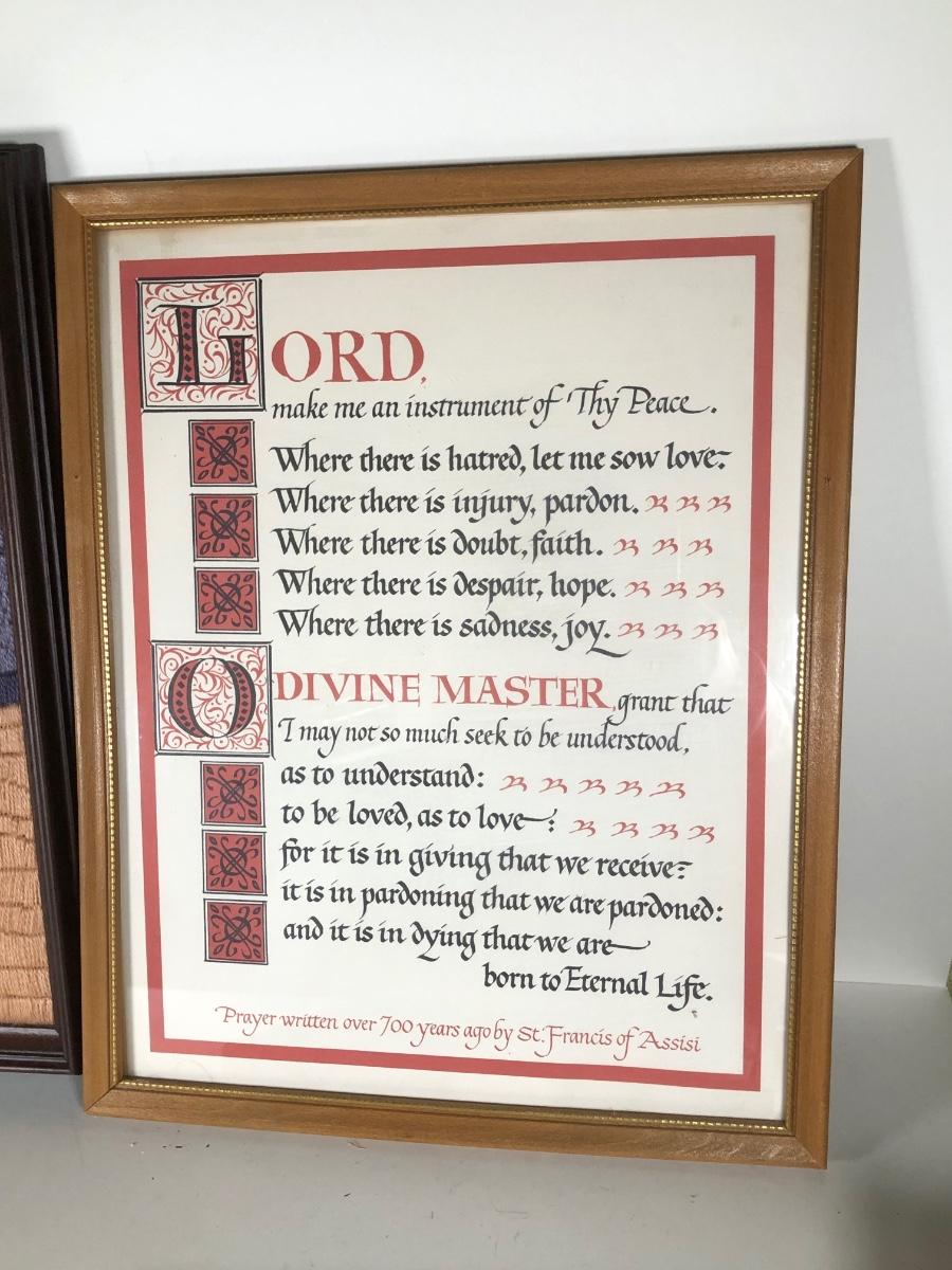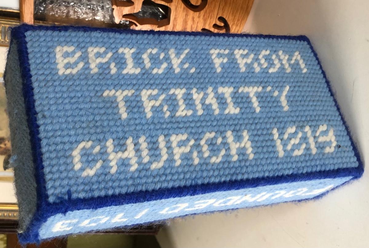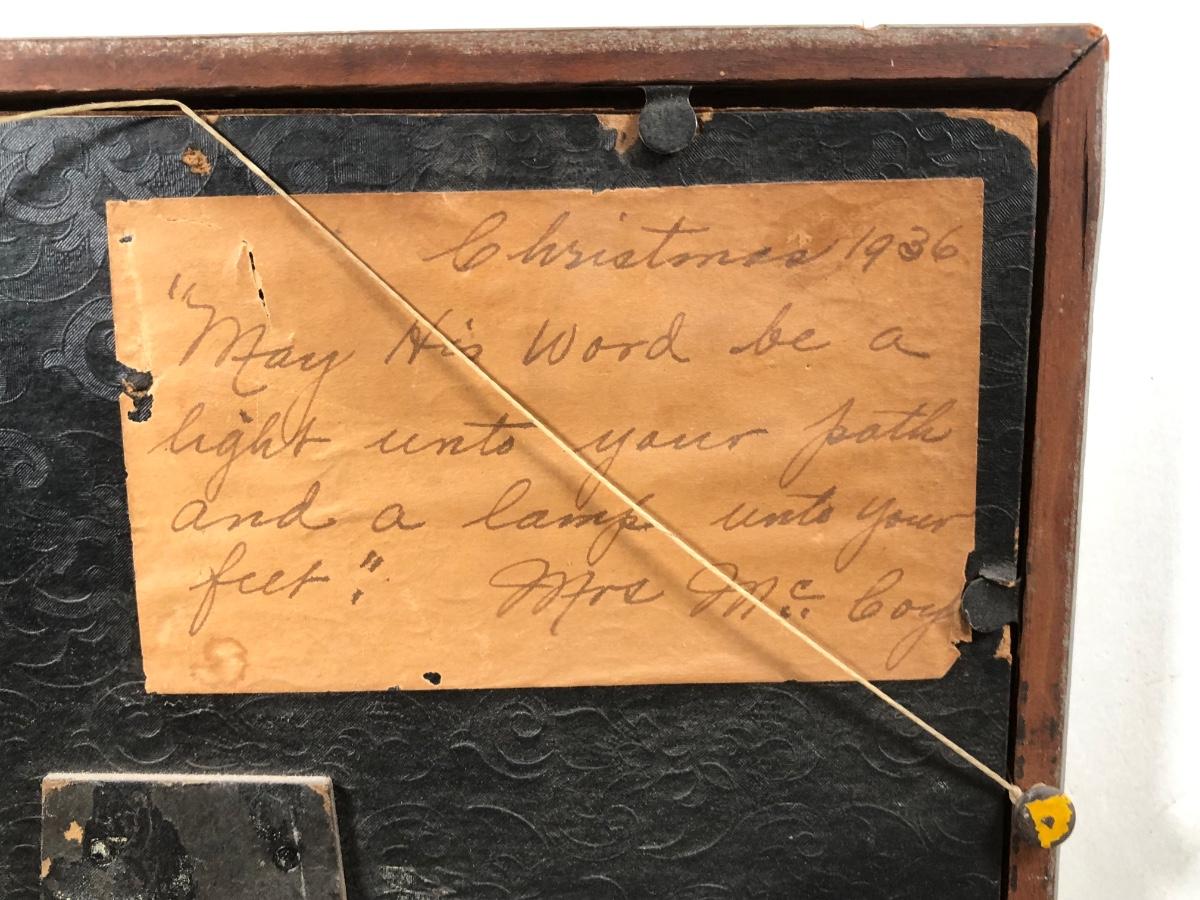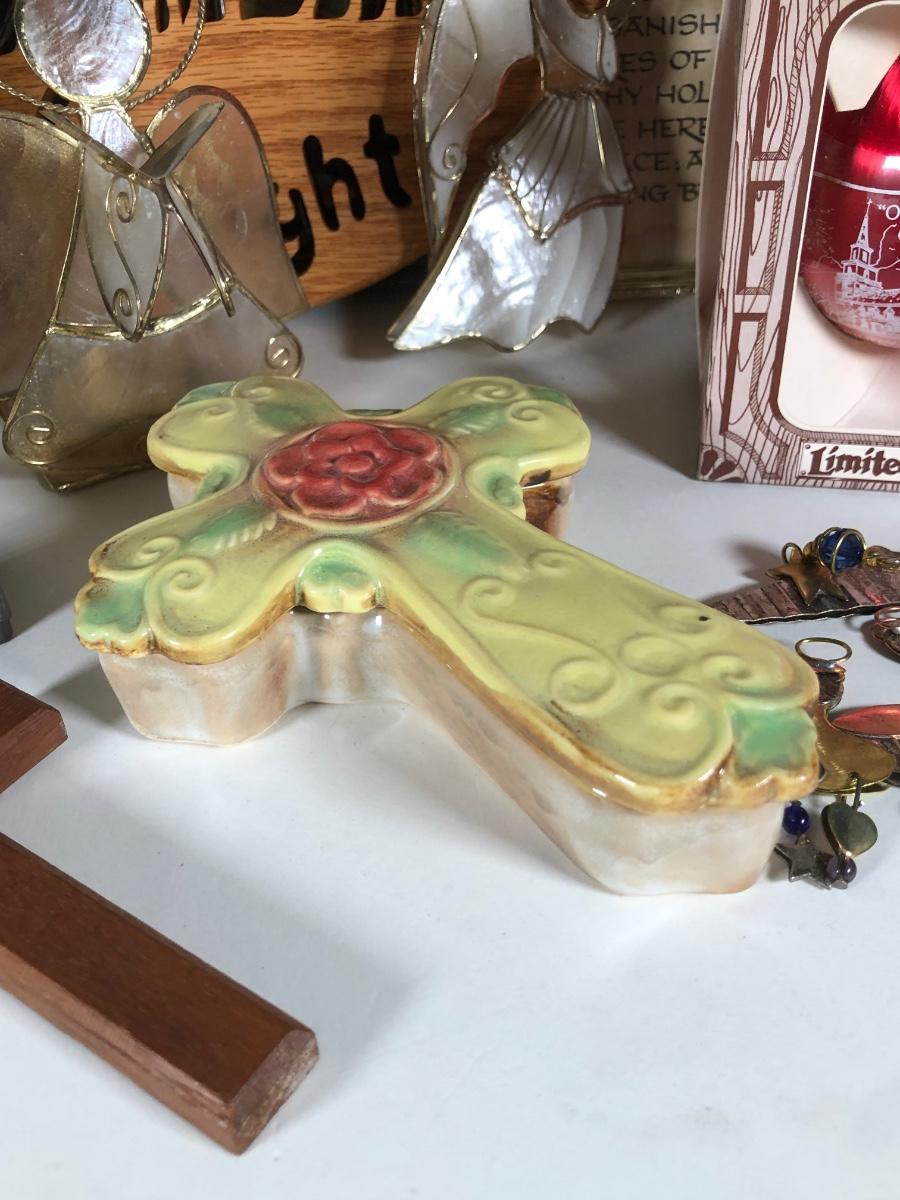 LOT 134D: Vintage Religious Home Decor - 1936 Framed Jesus Print, 3 Kings Embroidered Artwork, Stained Glass Cross, Brick from Trinity Church w/ Cover & More