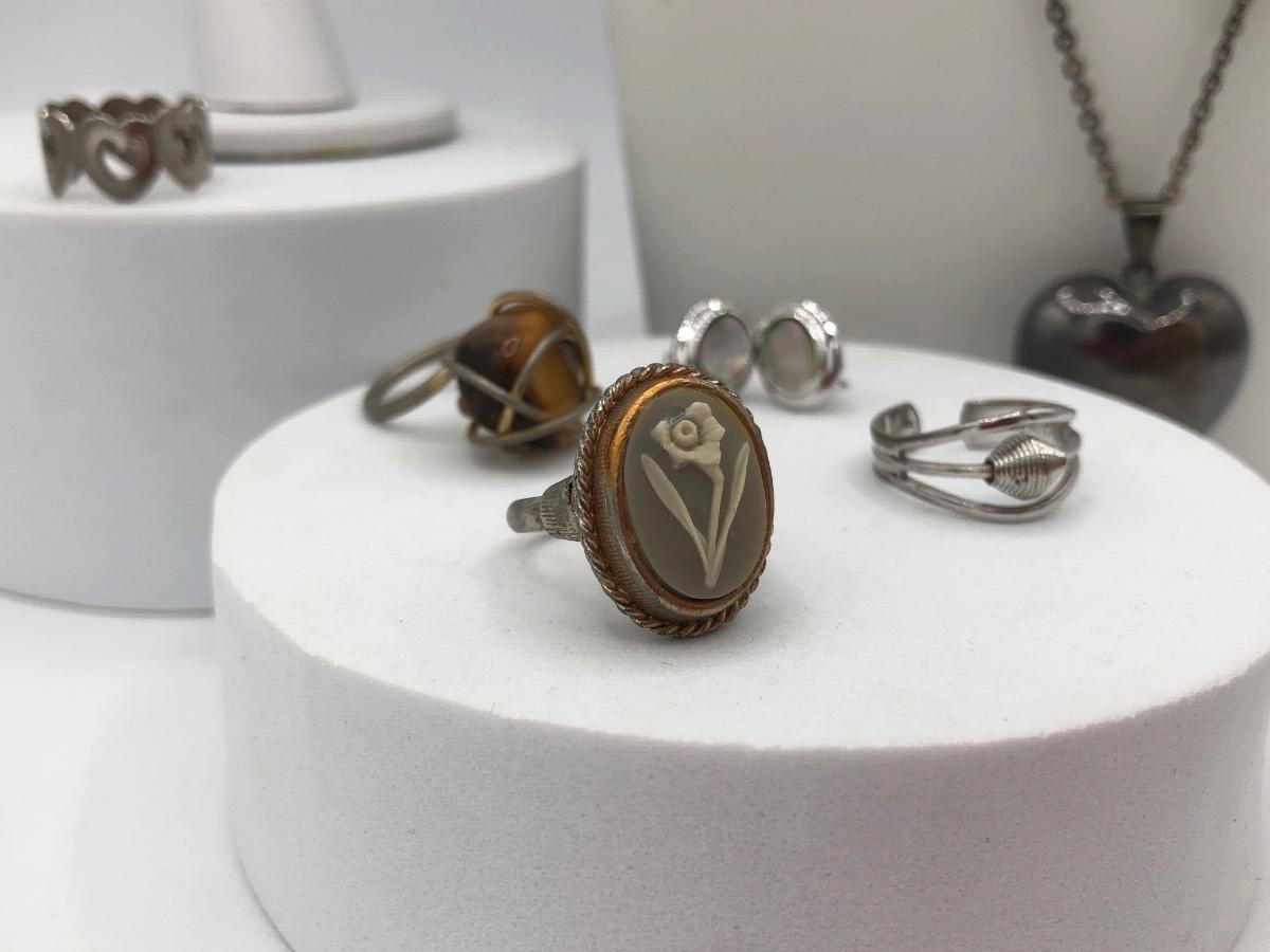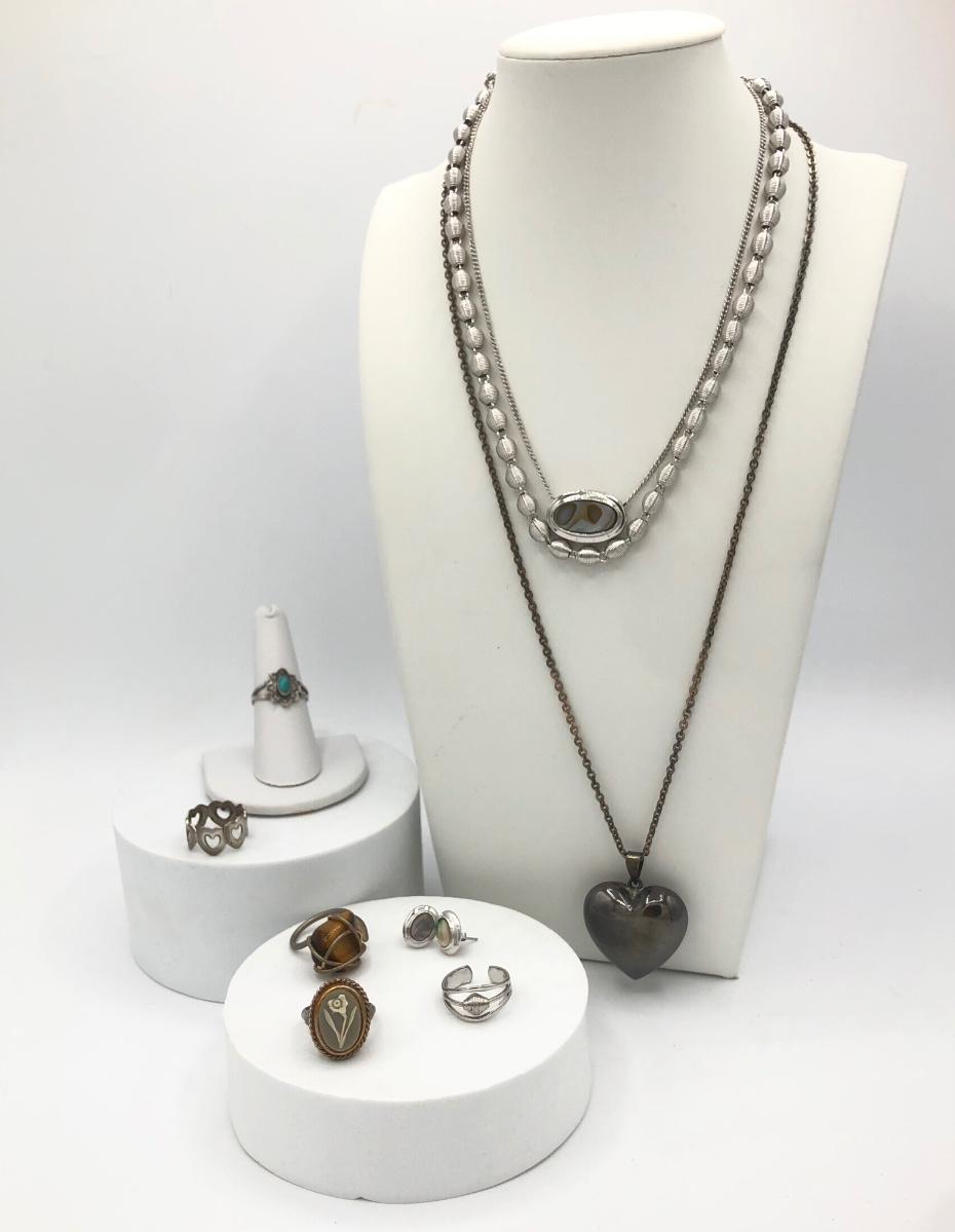 LOT 181J: Vintage Silvertone Costume Jewelry - Rings, Heart Necklace, Sarah Coventry Set & Avon Set