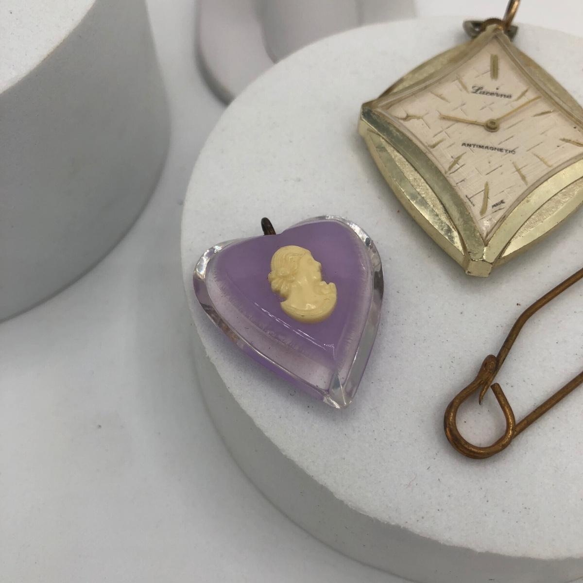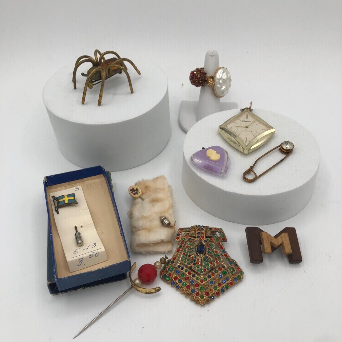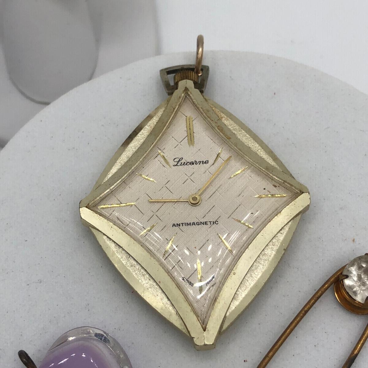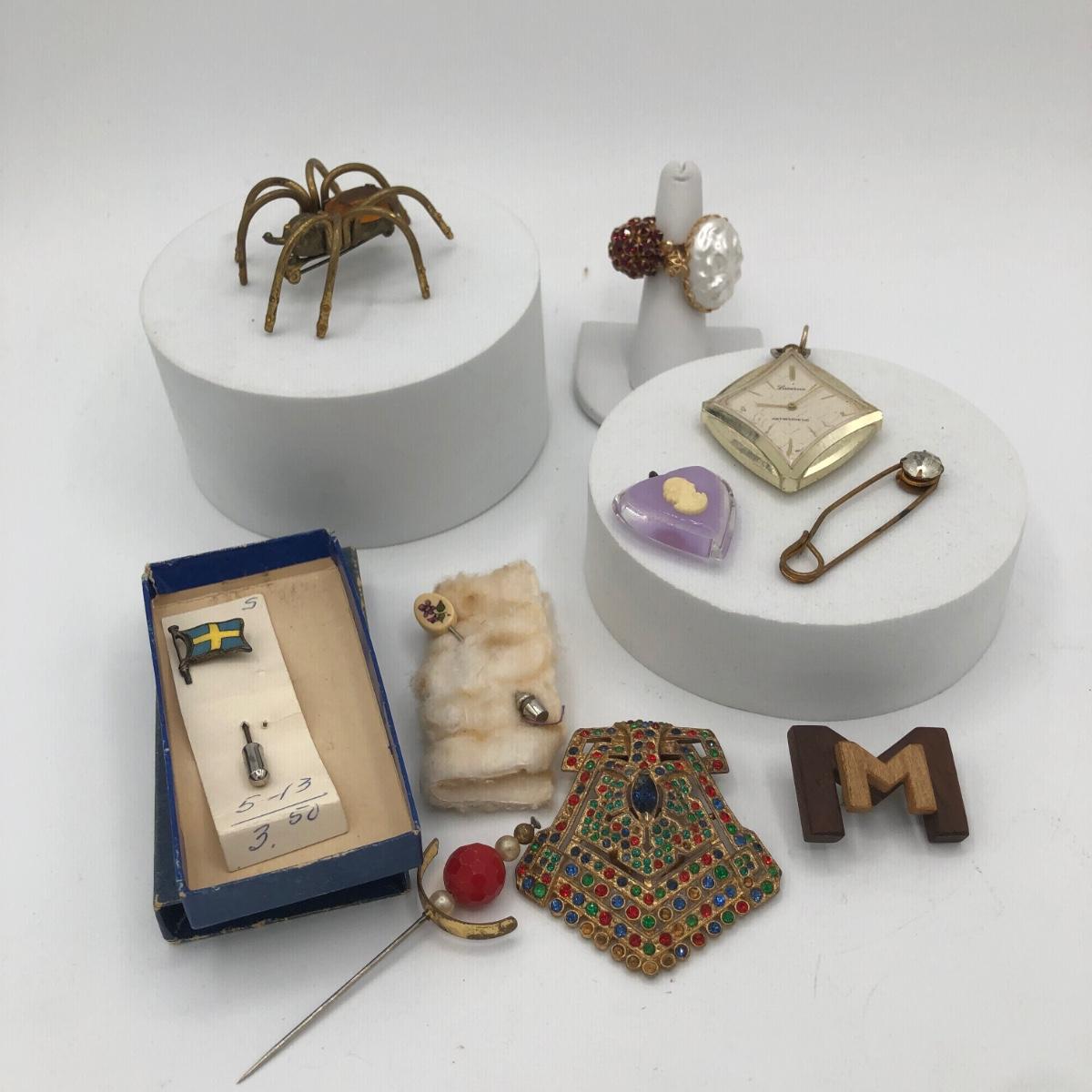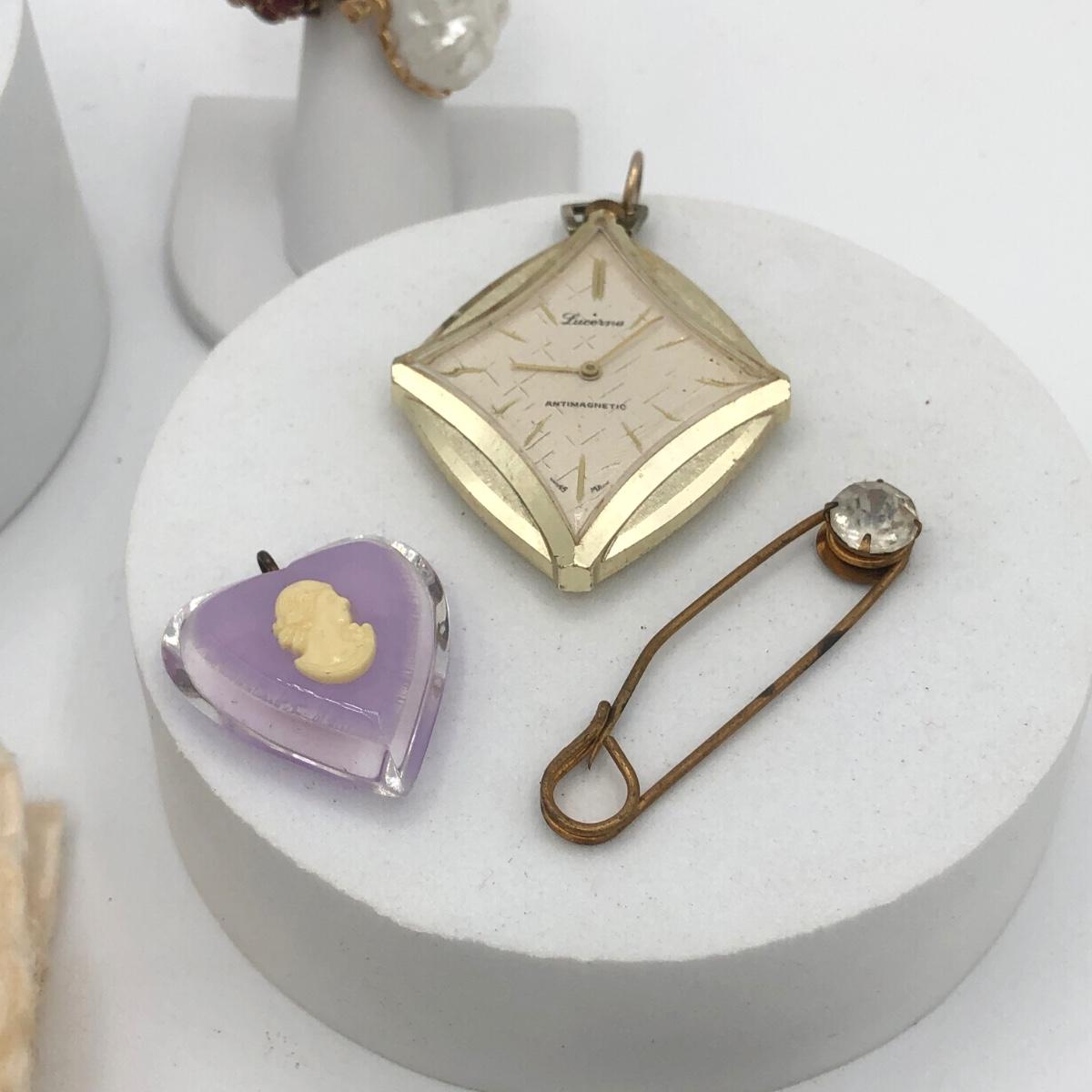 LOT 205J: Collection of Vintage Jewelry - Lucerne Swiss Watch Pendant, Amber Gem Spider Brooch, Cameo Heart Pendant, Rings & More