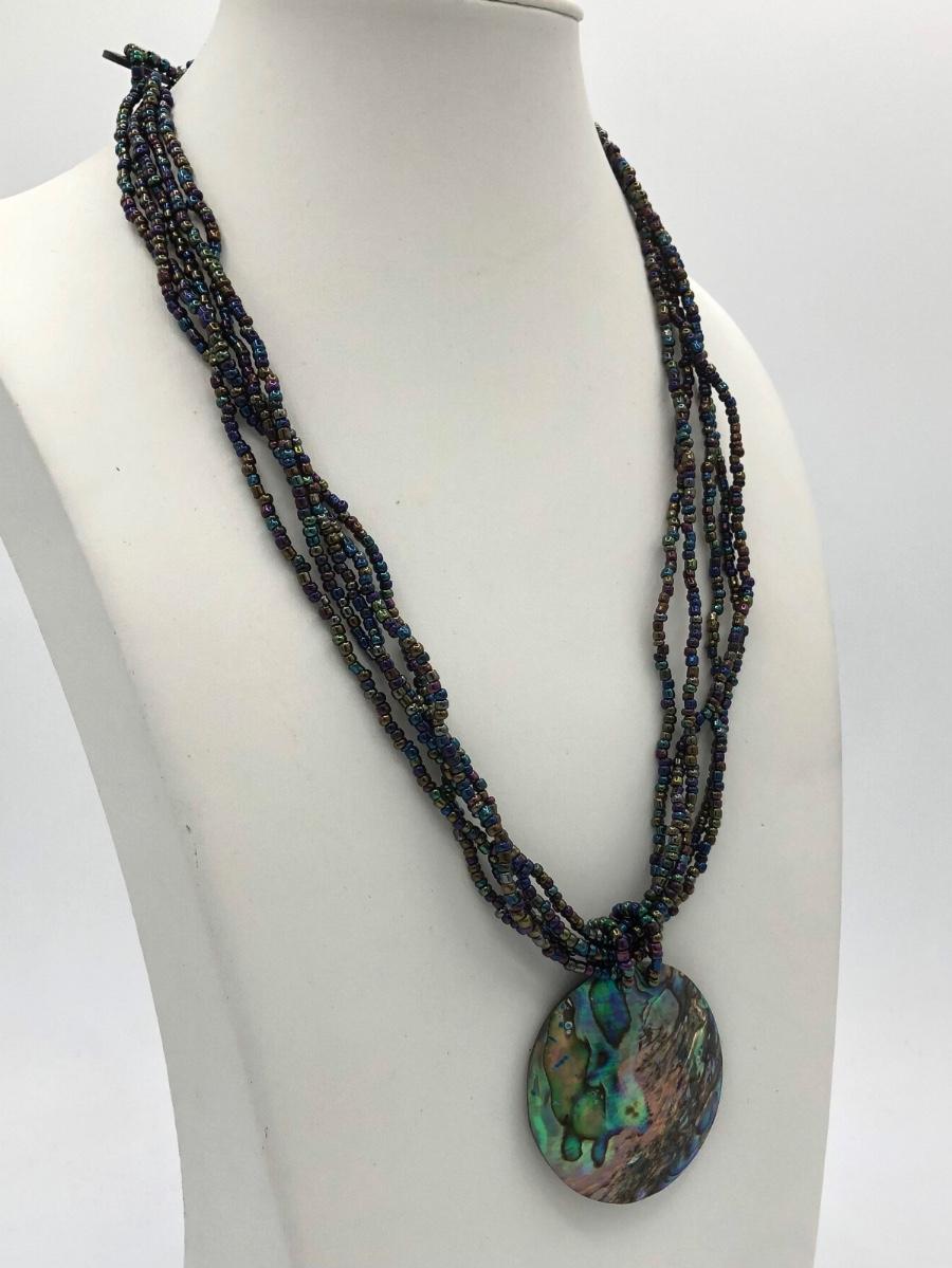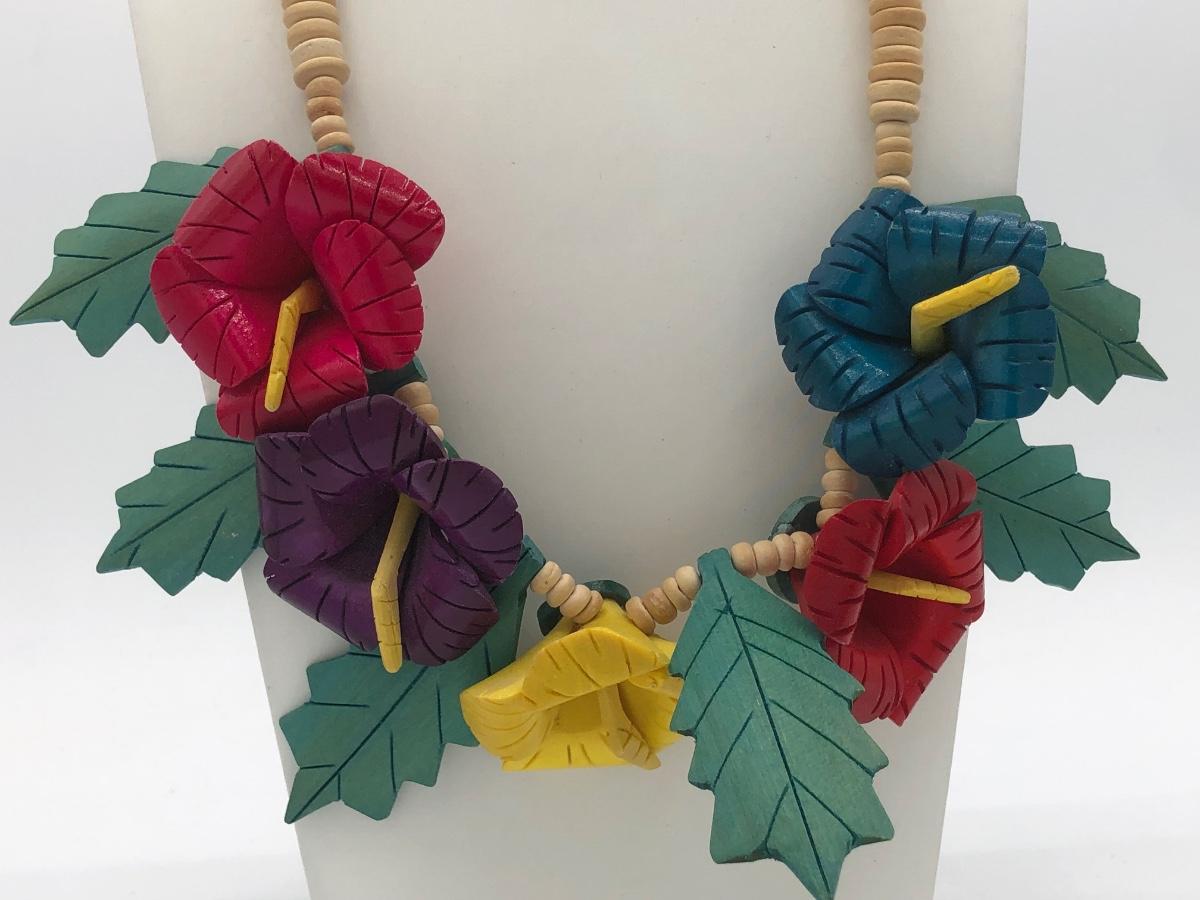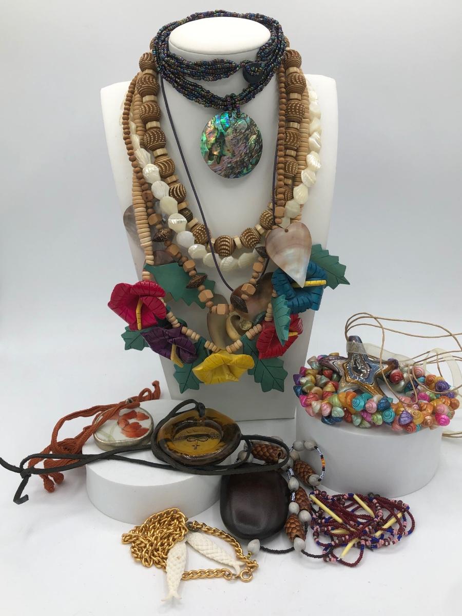 LOT 214J: Collection of Beaded Necklaces w/ Wood Hibiscus Necklace & Glass Pendants