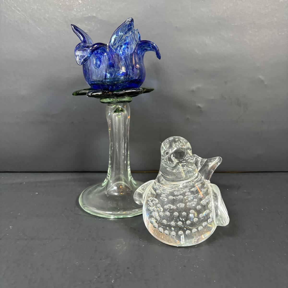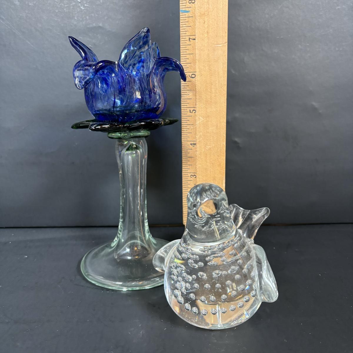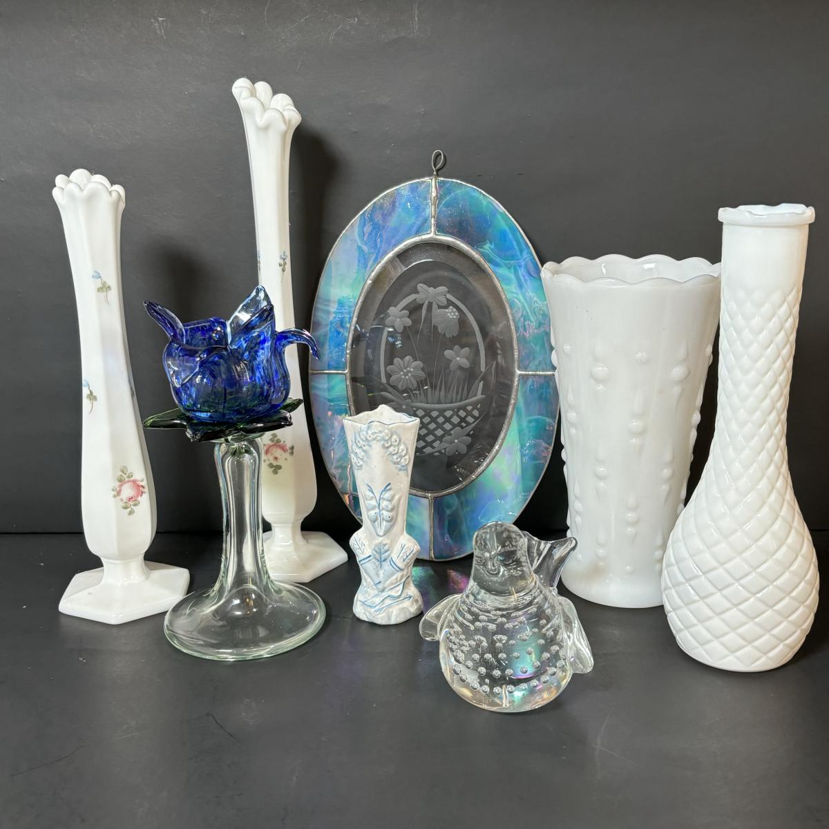 LOT 3: Stained Glass Floral Sun Catcher, Art Glass Bubble Paperweight Bird, Milk Glass Vases & More