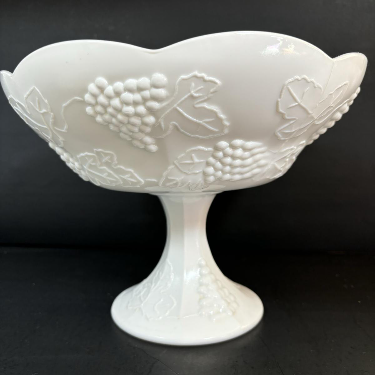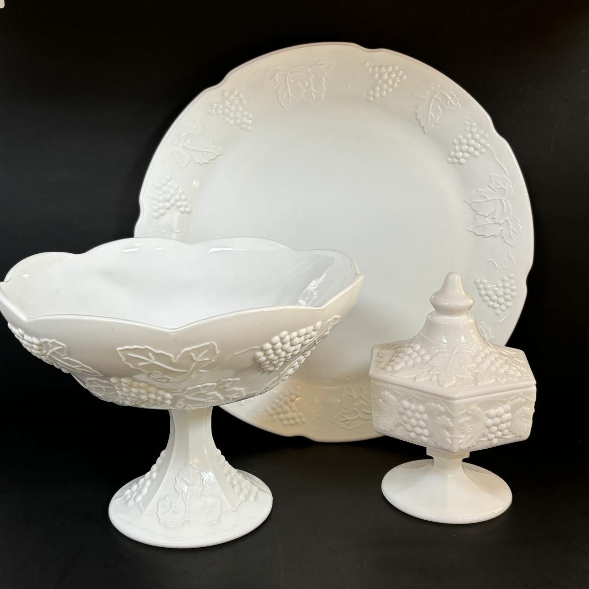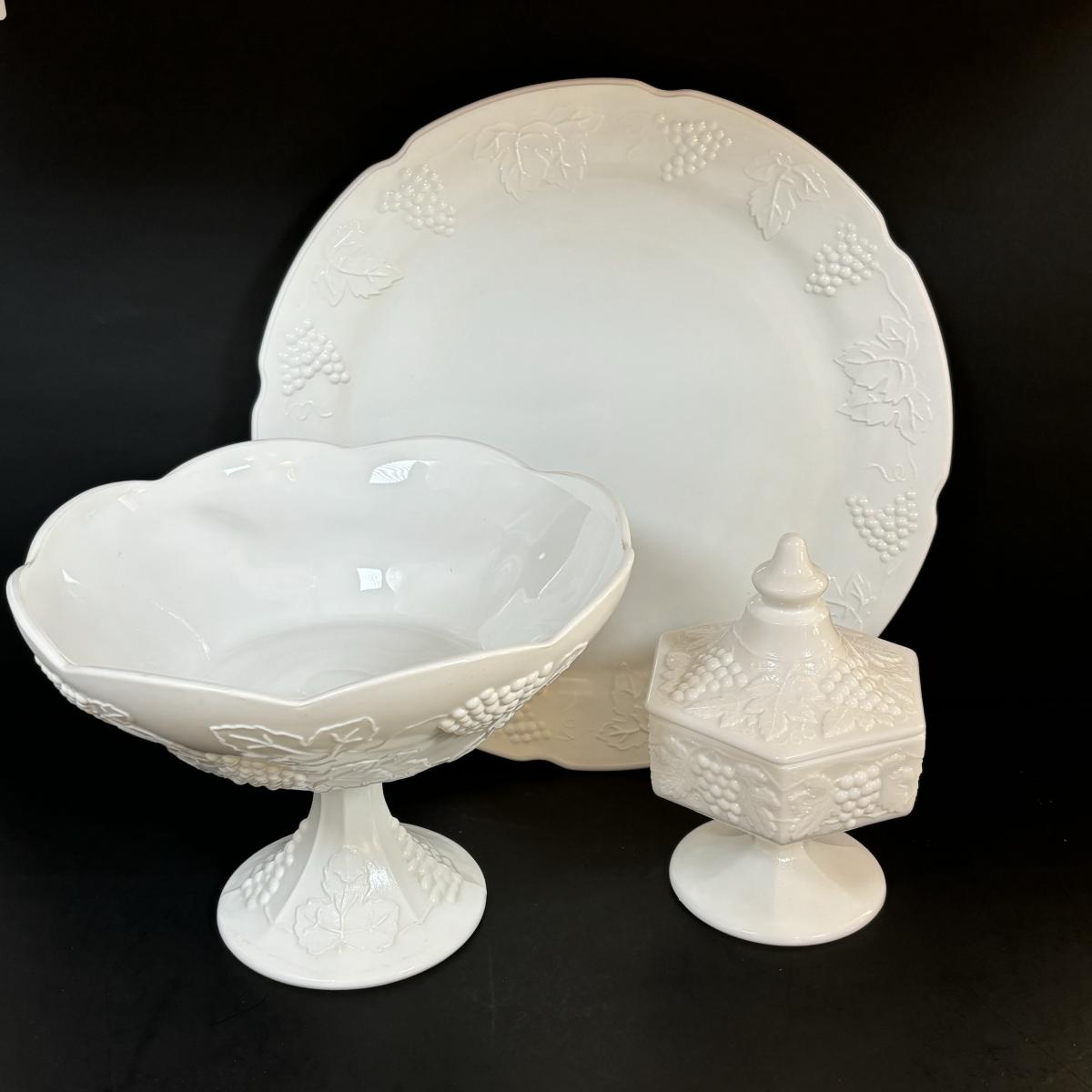 LOT 7: Vintage Milk Glass Grapes/Ivy Serving Platter, Pedestal Compote Dish & Covered Candy Dish