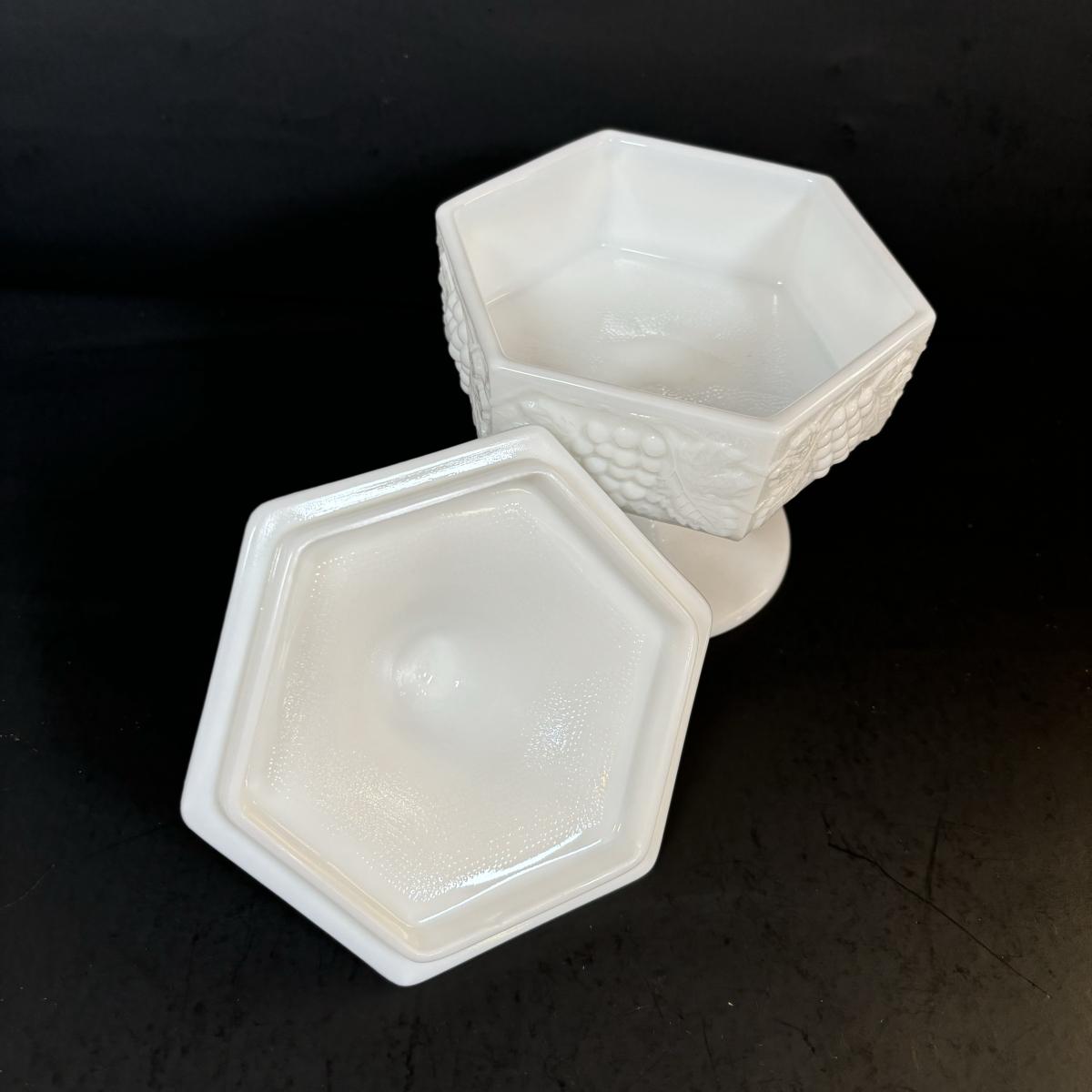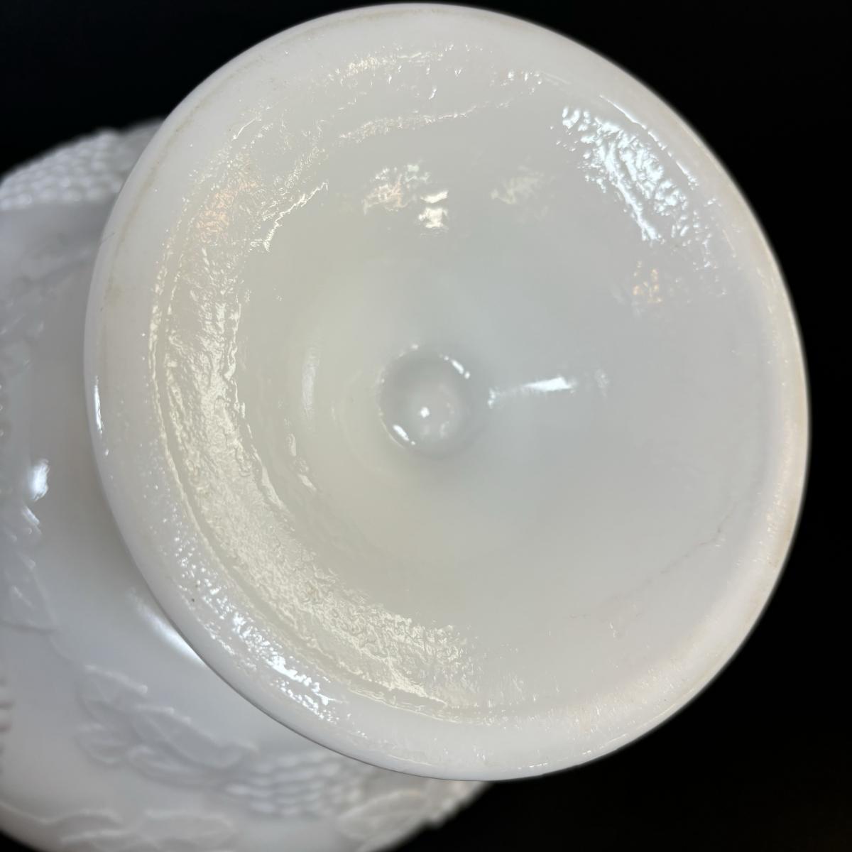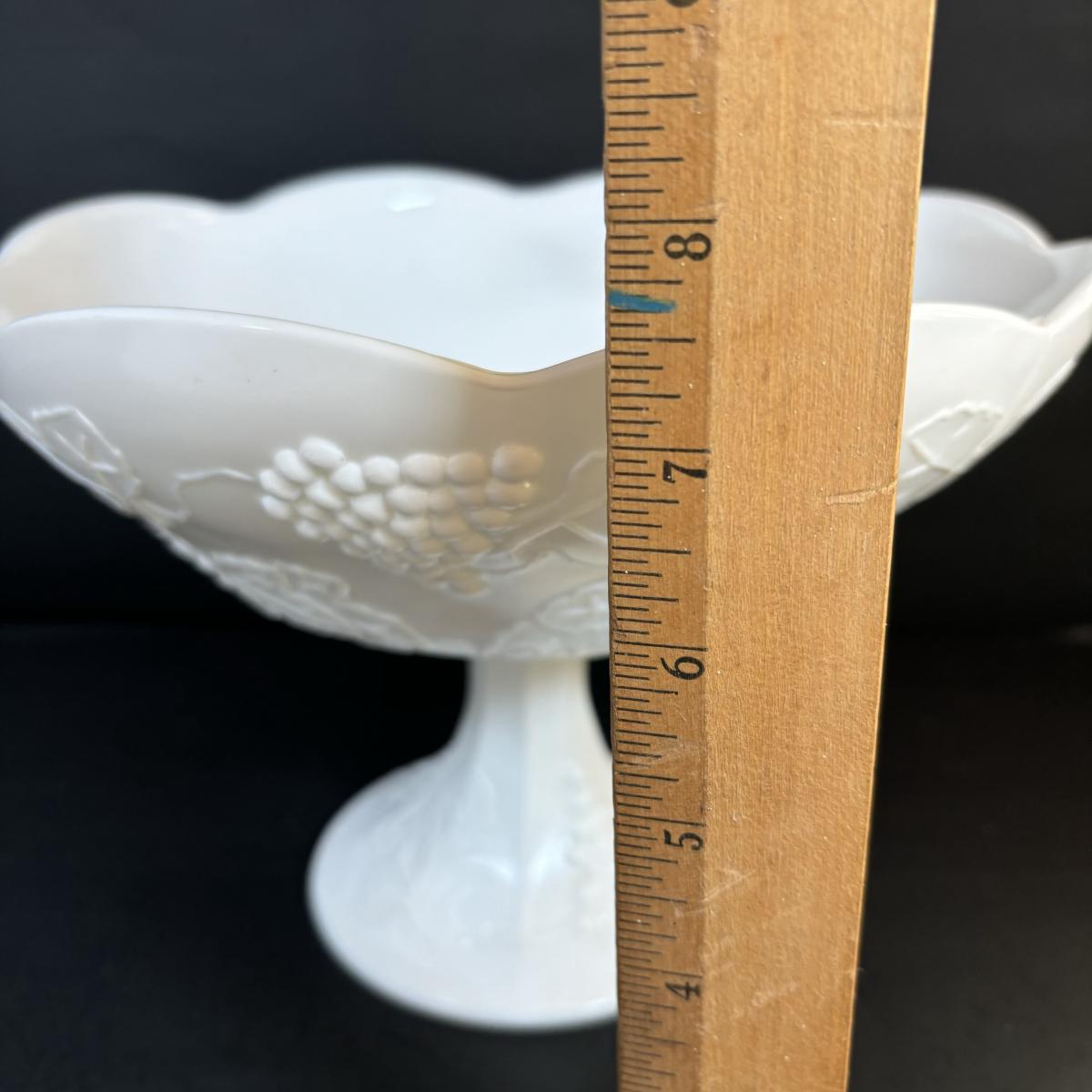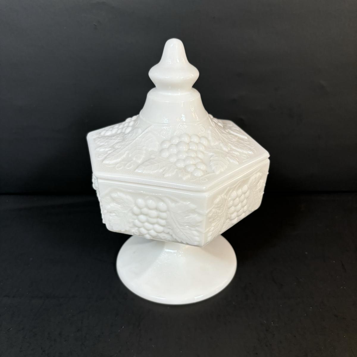 LOT 7: Vintage Milk Glass Grapes/Ivy Serving Platter, Pedestal Compote Dish & Covered Candy Dish