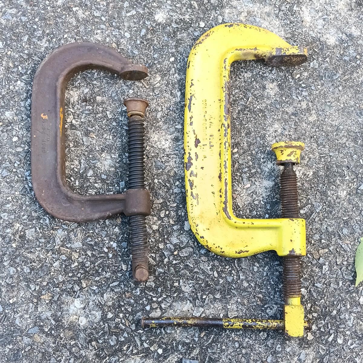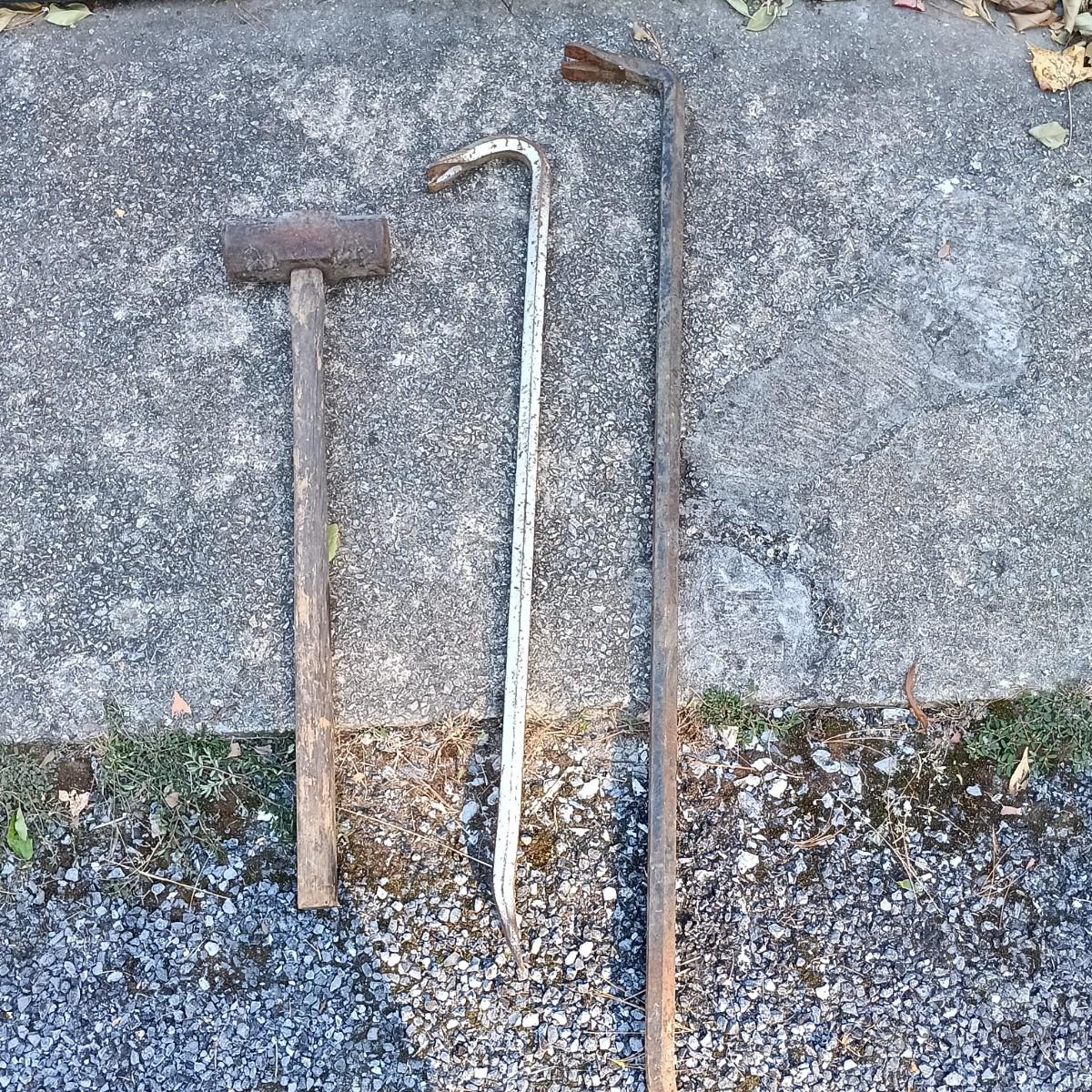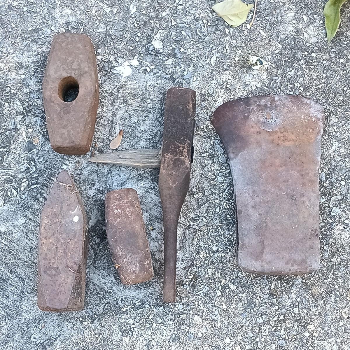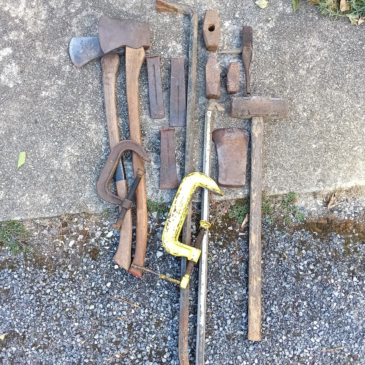 LOT 47: Axes, Axe Head, Hammer and Hammer Heads, Crow Bar & C-Clamps