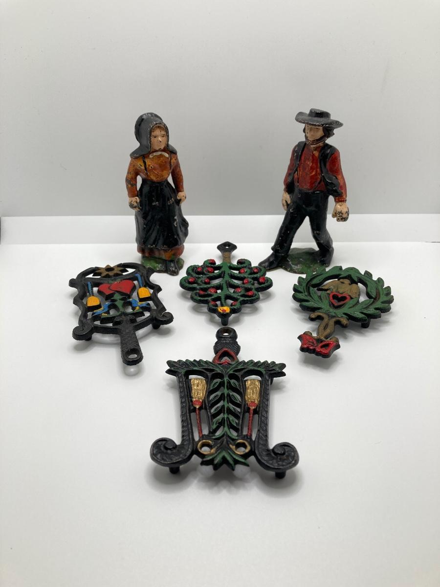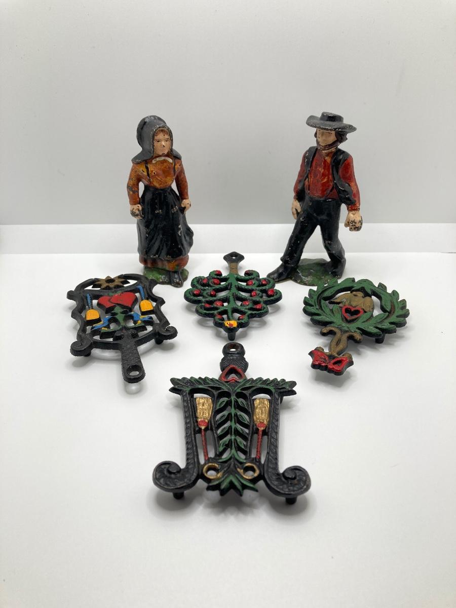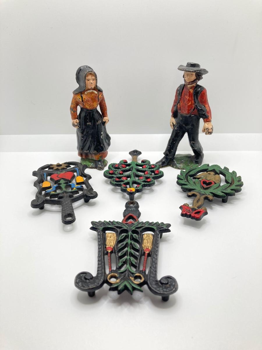 LOT 58: Cast Iron Collection - Amish Couple and Four Miniature Trivets