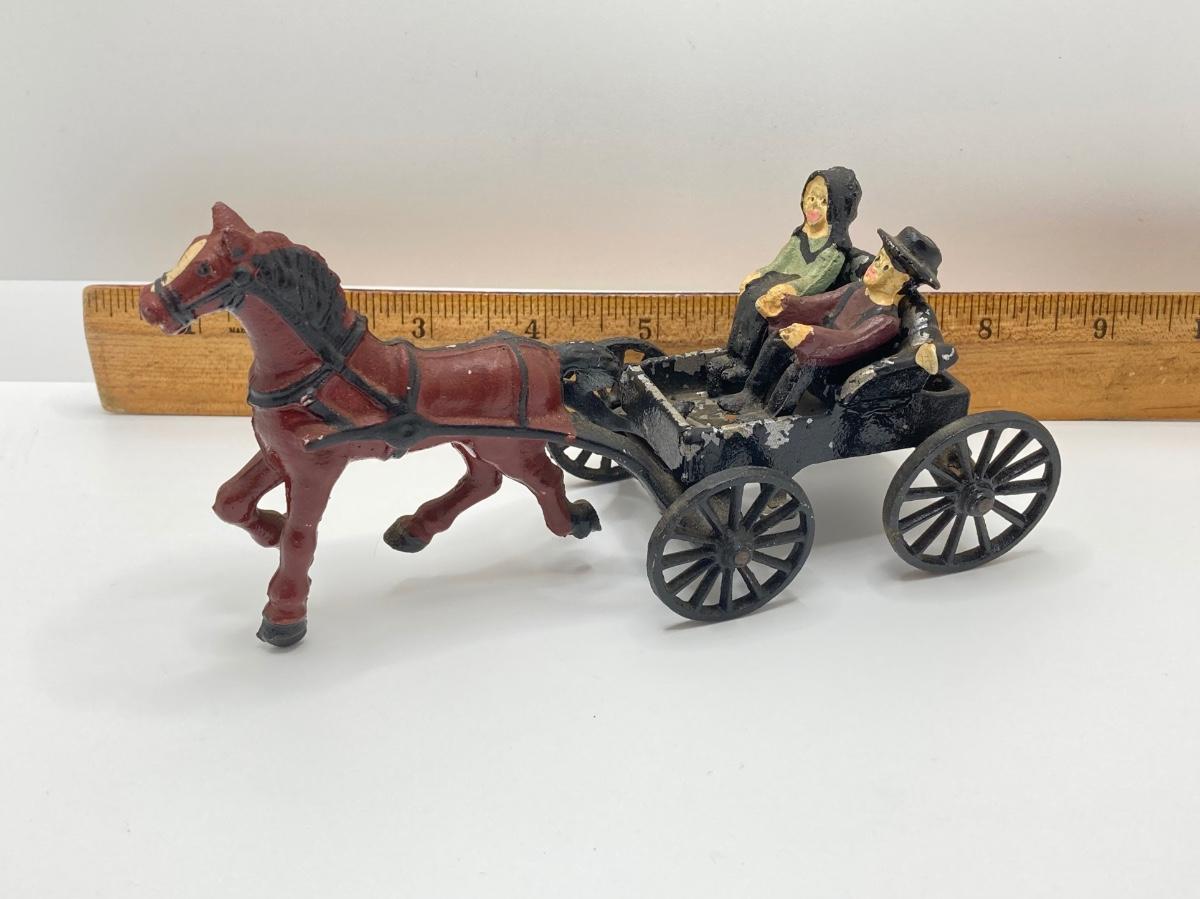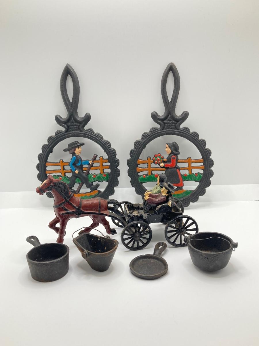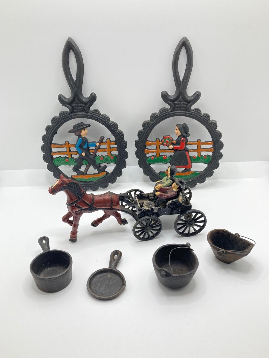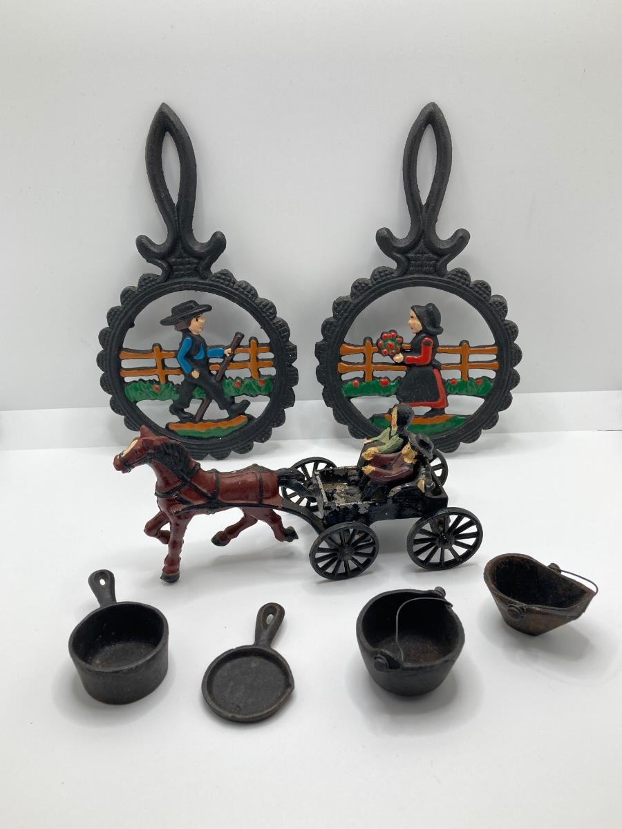 LOT 59: Decorative Cast Iron Collection - Miniature Horse and Buggy and Four Piece Cookware Set with Pair of Trivets