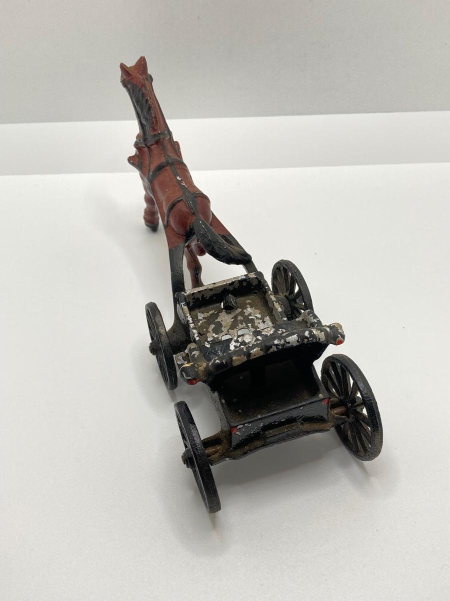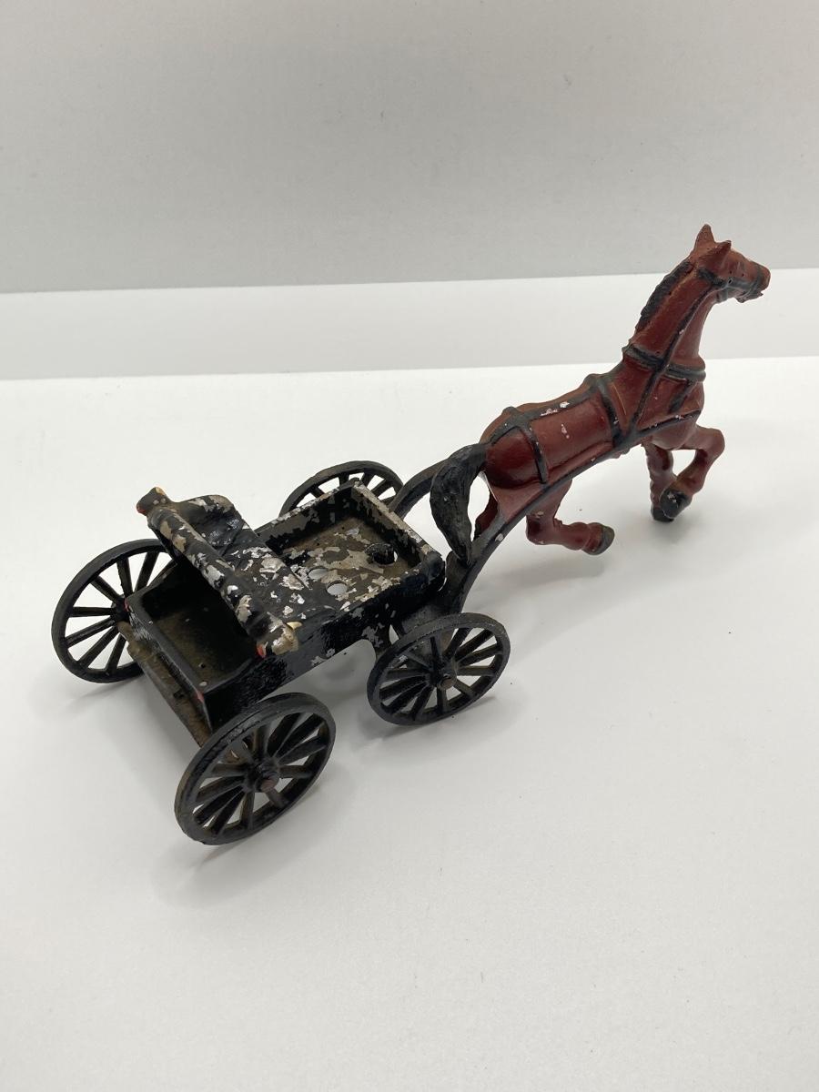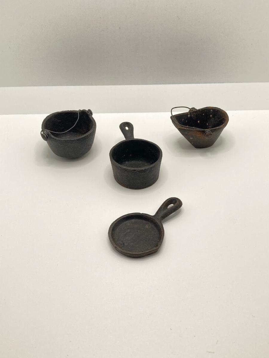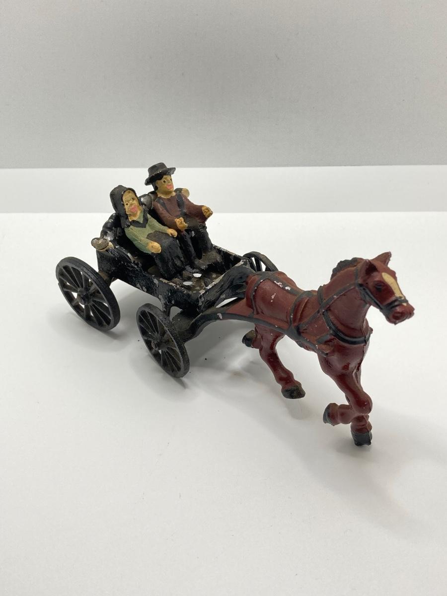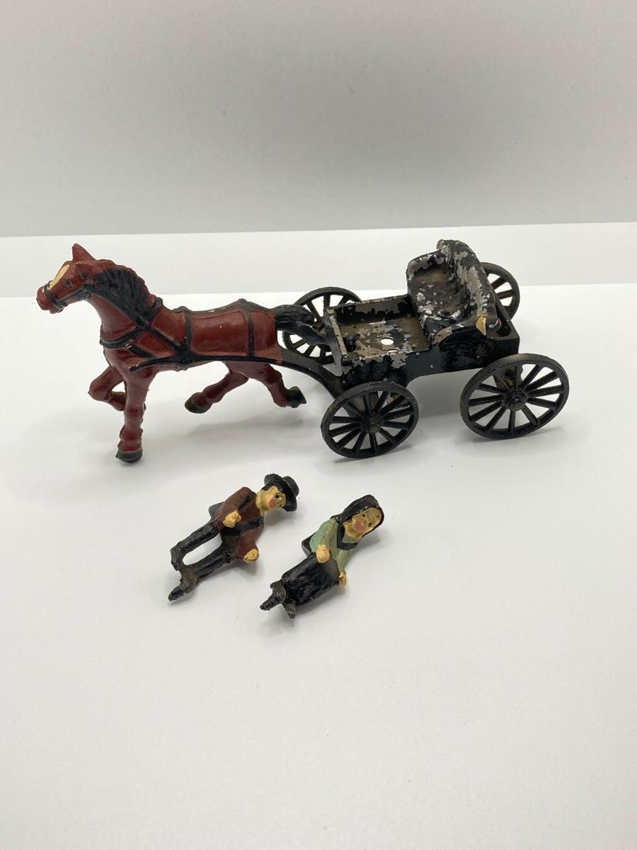 LOT 59: Decorative Cast Iron Collection - Miniature Horse and Buggy and Four Piece Cookware Set with Pair of Trivets