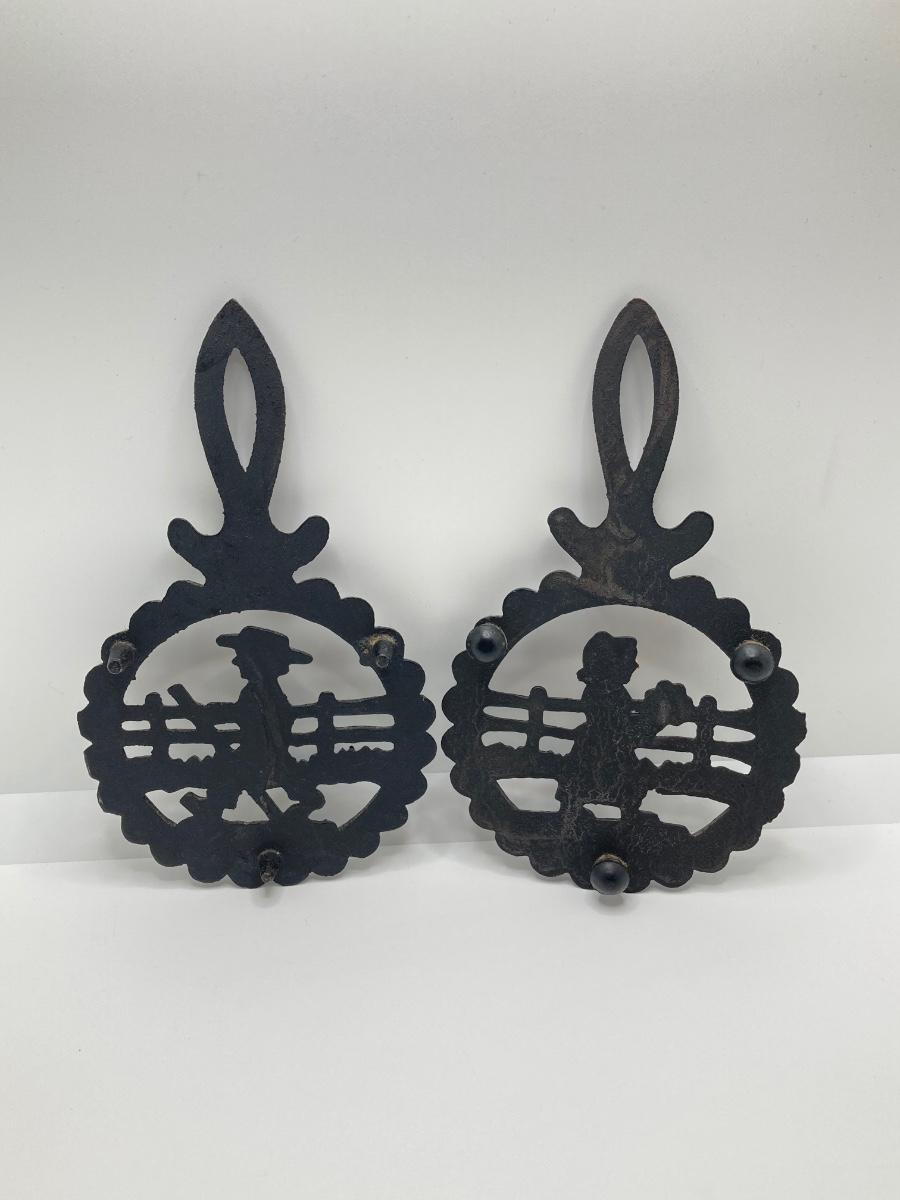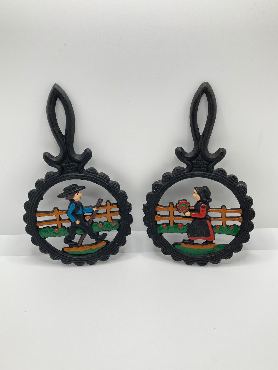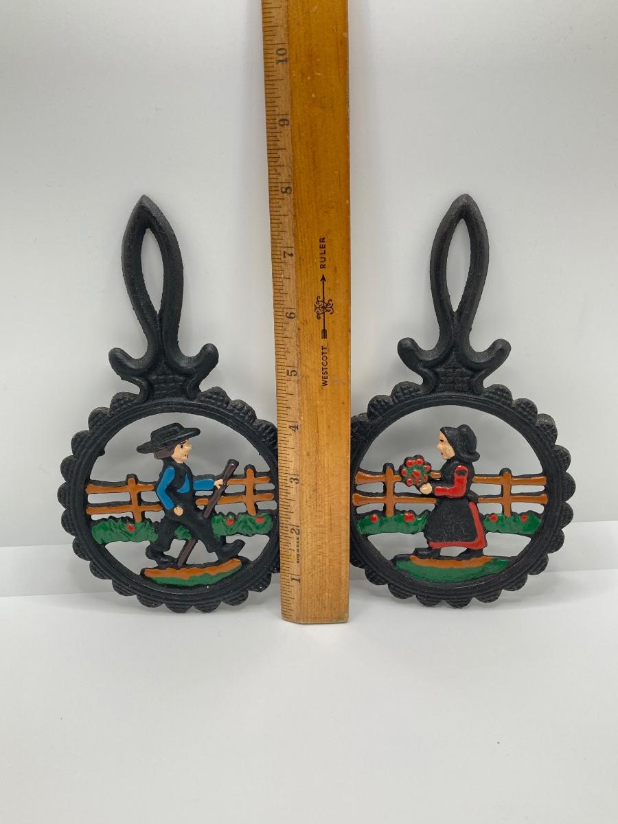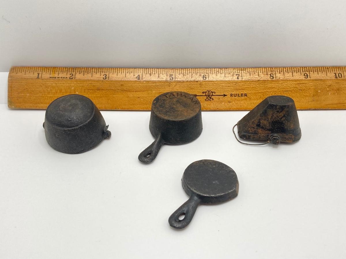 LOT 59: Decorative Cast Iron Collection - Miniature Horse and Buggy and Four Piece Cookware Set with Pair of Trivets