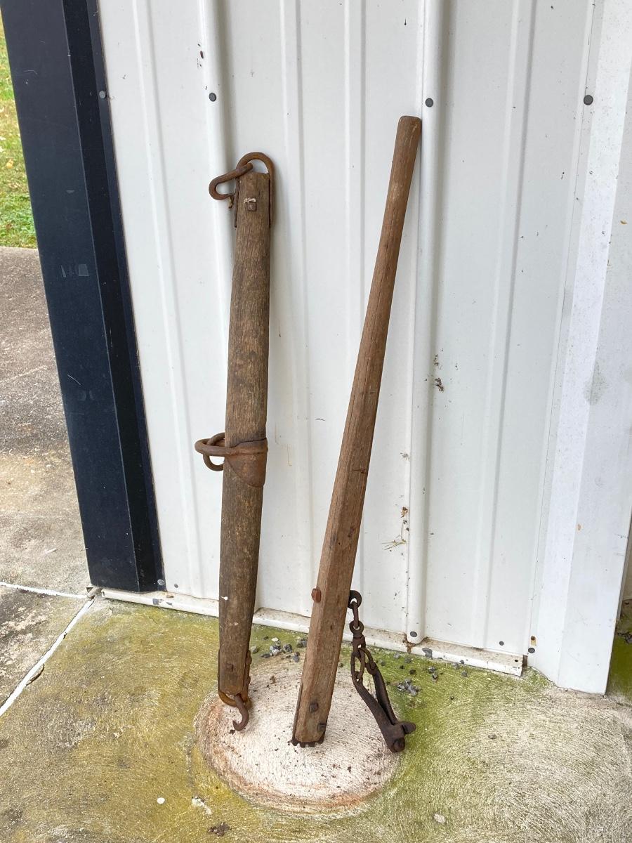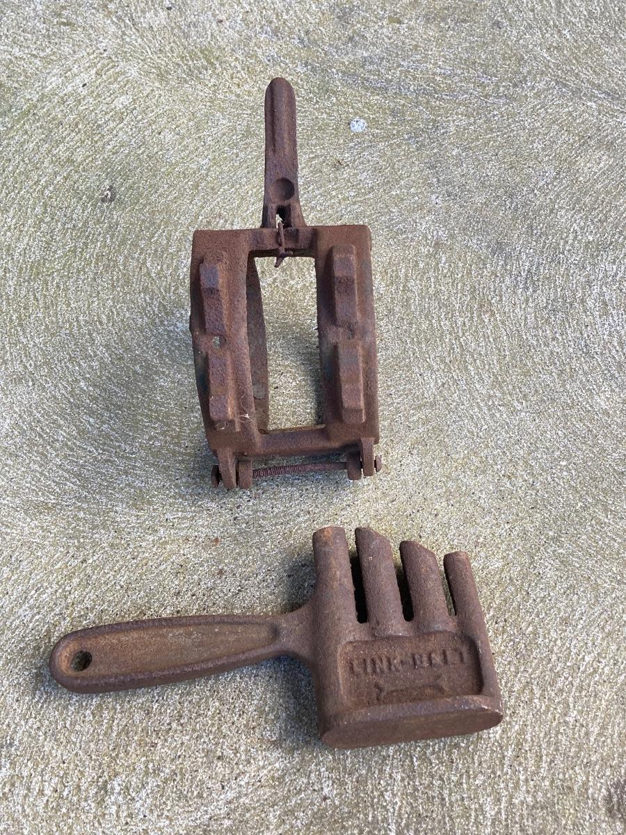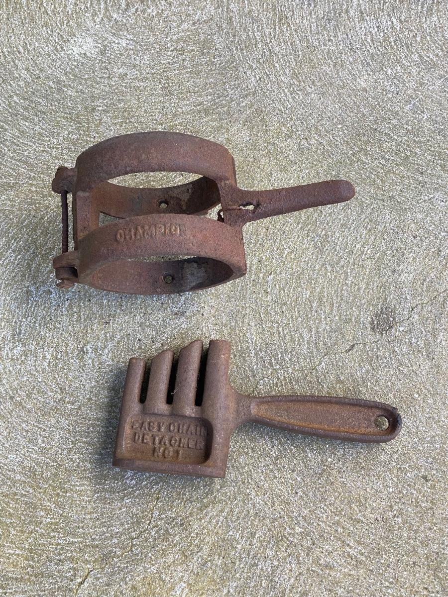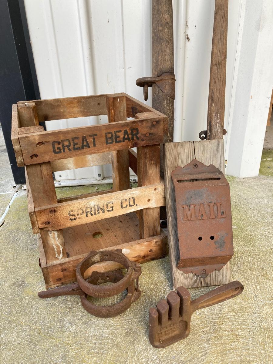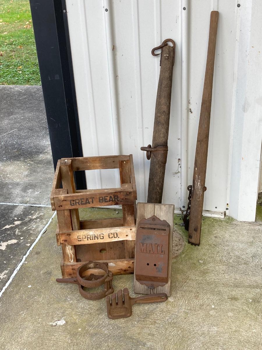 LOT 71: Vintage Great Bear Water Crate, Mail Slot, Wooden Yoke, Fence Puller, Asparagus Bunch Tool and Easy Chain Detacher No 1 Link Belt Tool