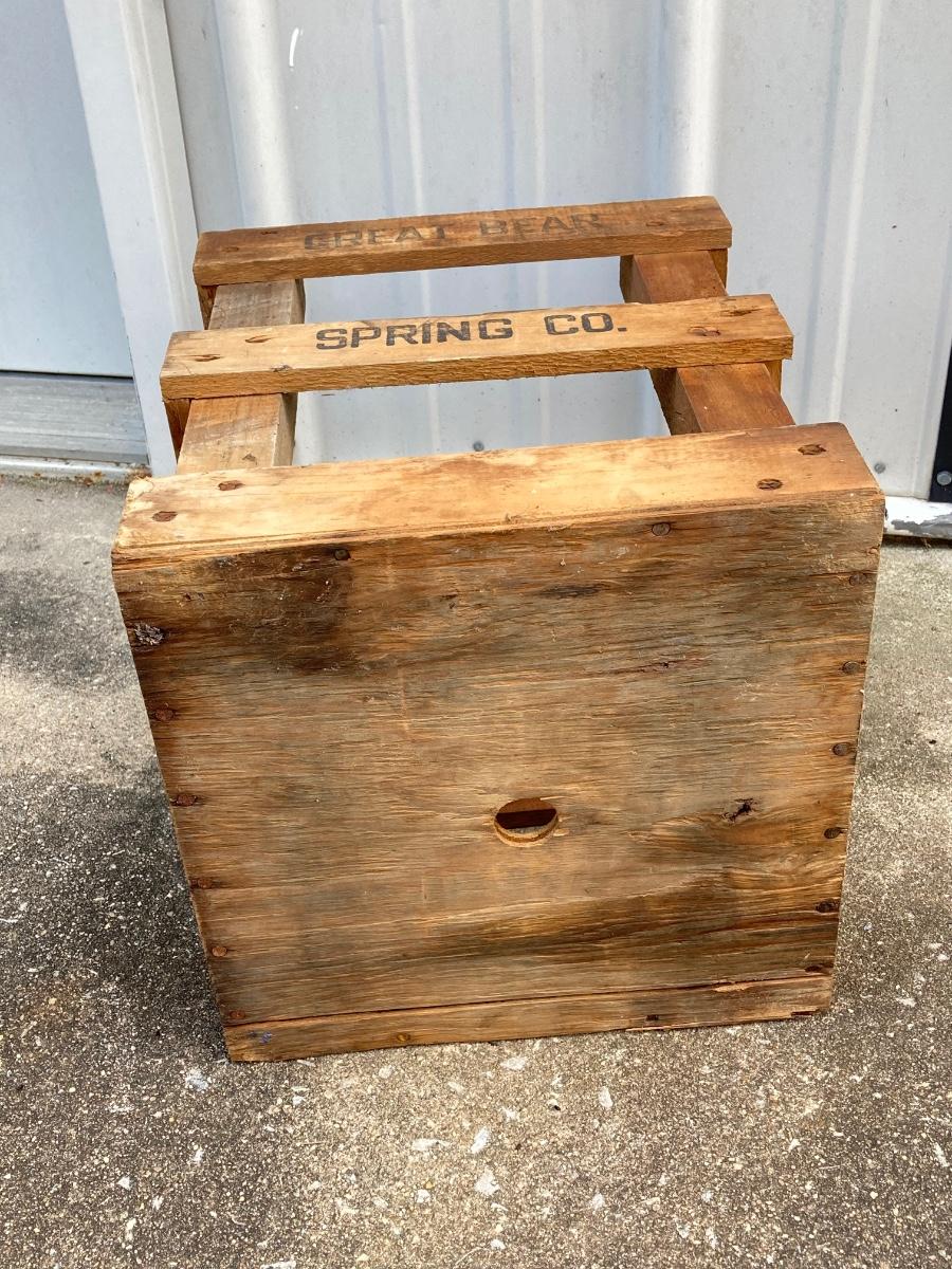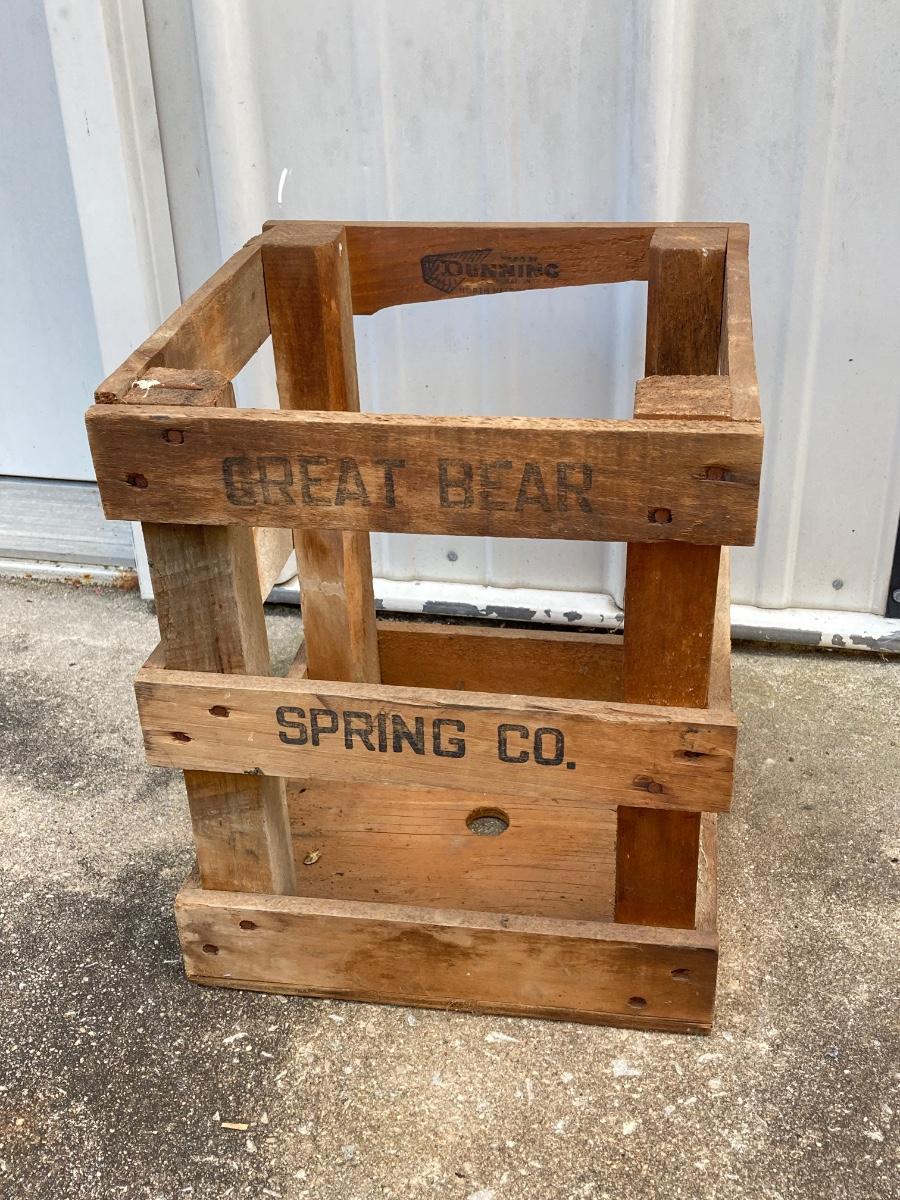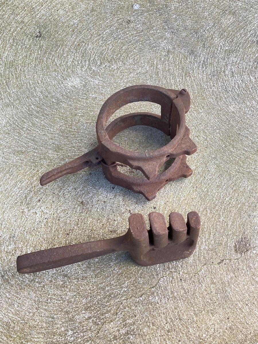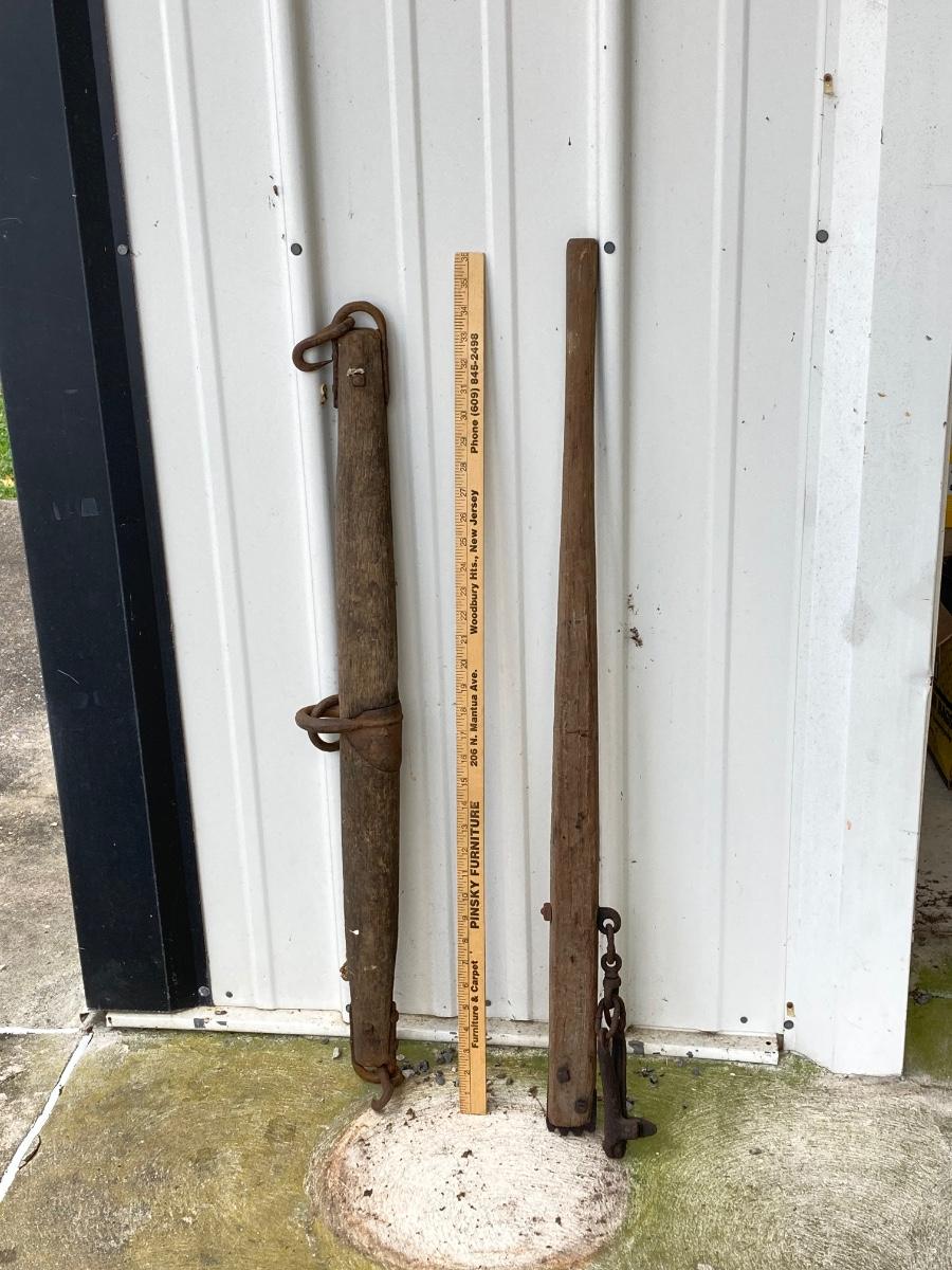 LOT 71: Vintage Great Bear Water Crate, Mail Slot, Wooden Yoke, Fence Puller, Asparagus Bunch Tool and Easy Chain Detacher No 1 Link Belt Tool