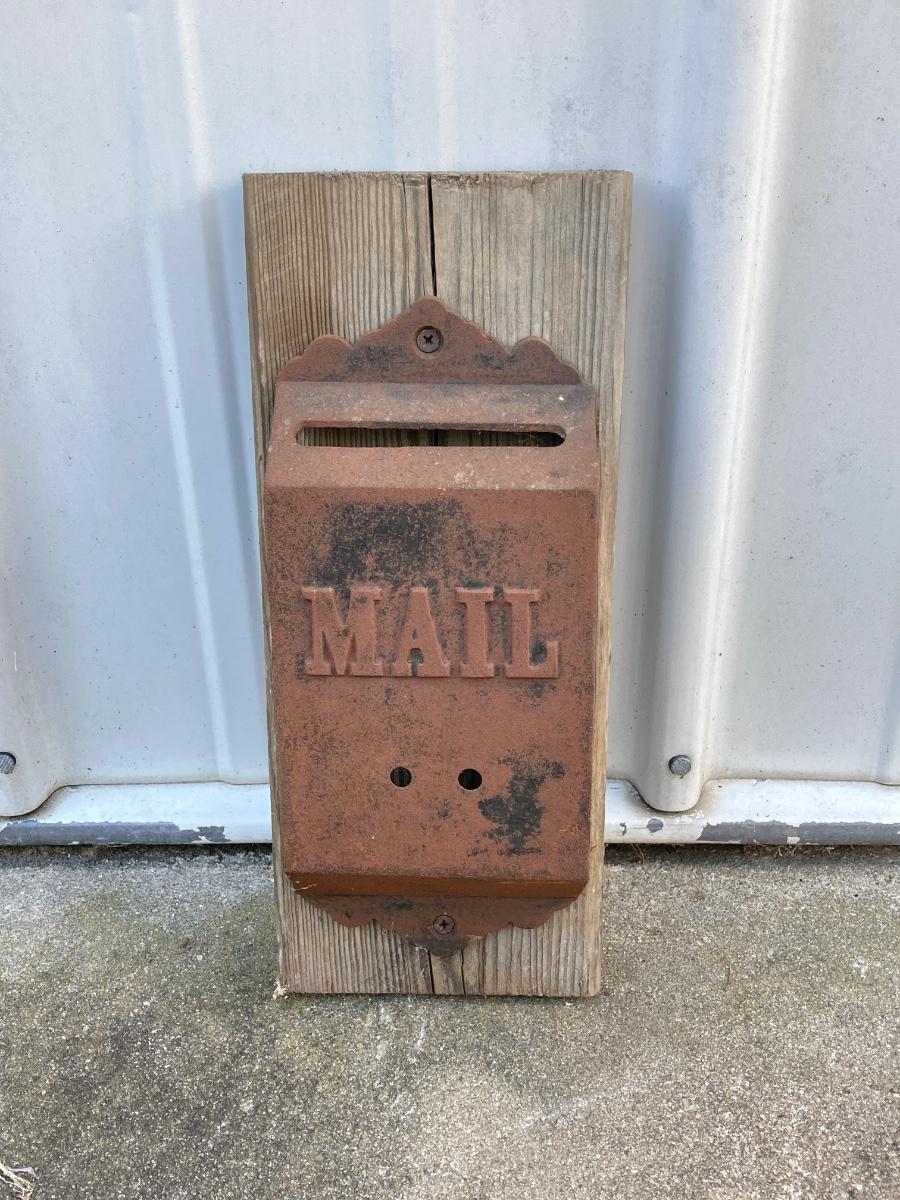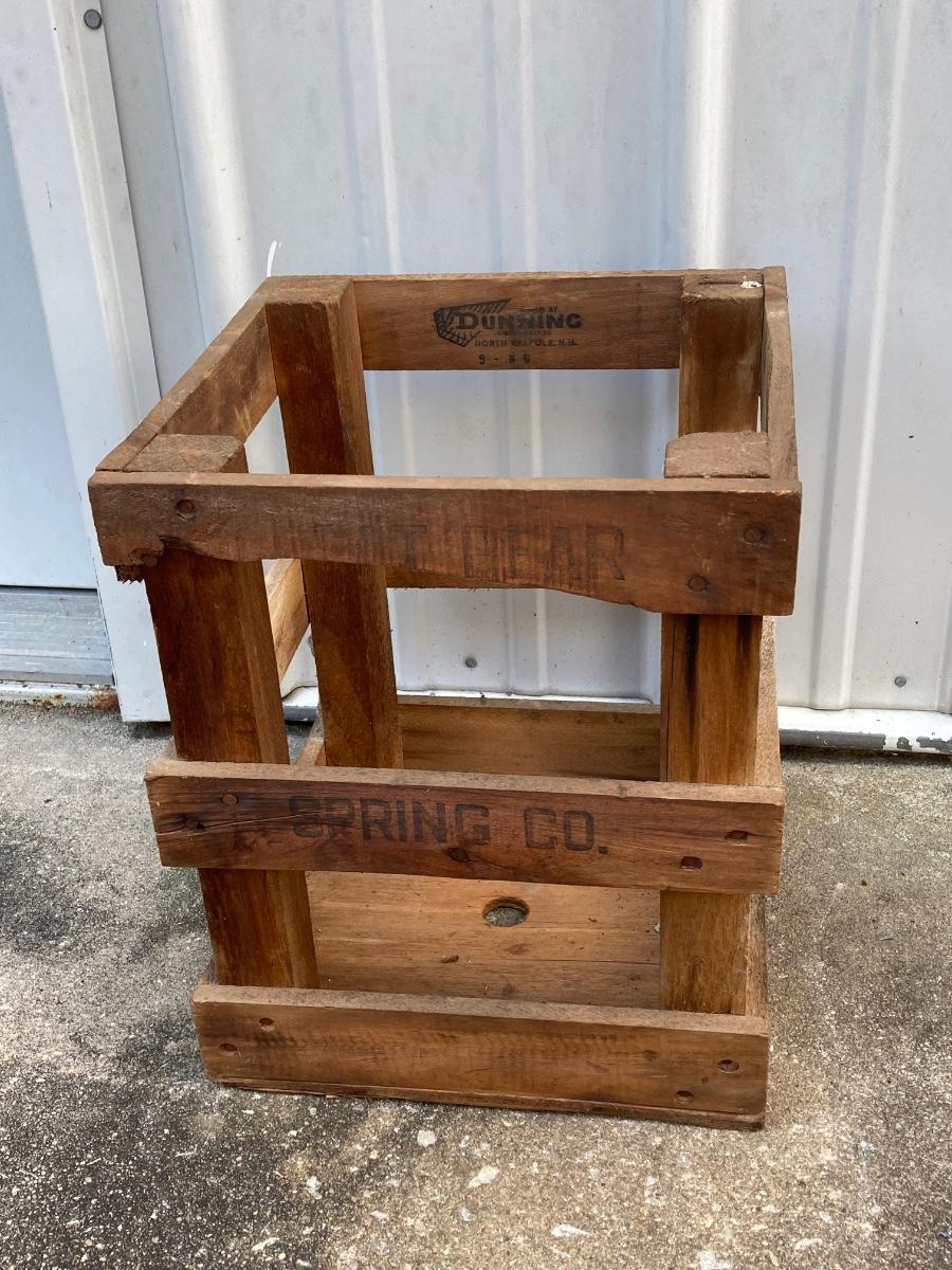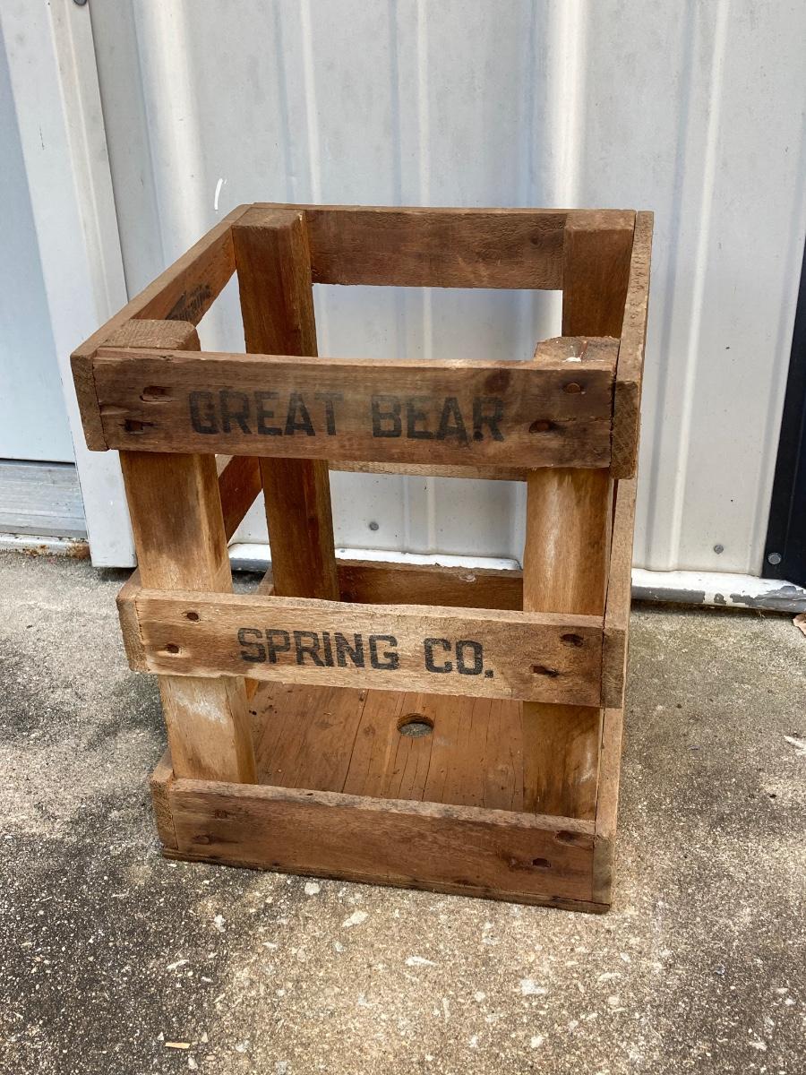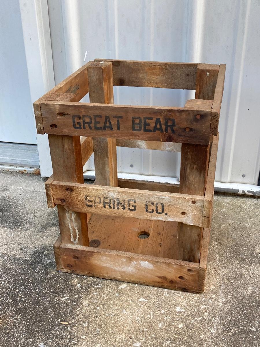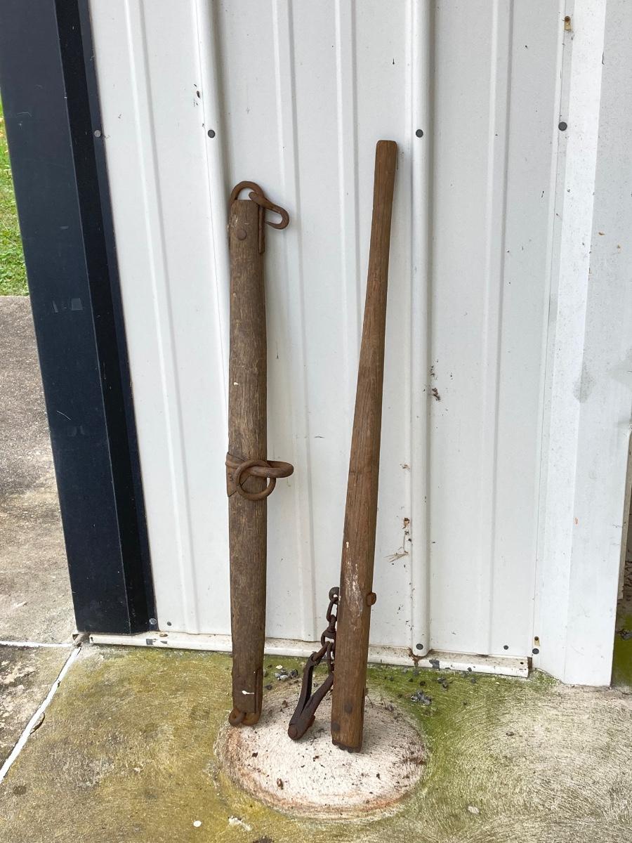 LOT 71: Vintage Great Bear Water Crate, Mail Slot, Wooden Yoke, Fence Puller, Asparagus Bunch Tool and Easy Chain Detacher No 1 Link Belt Tool