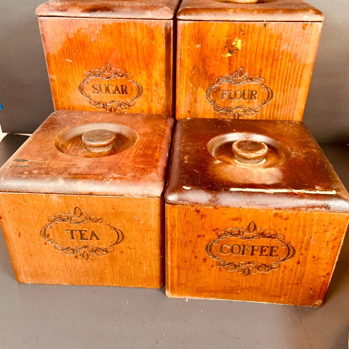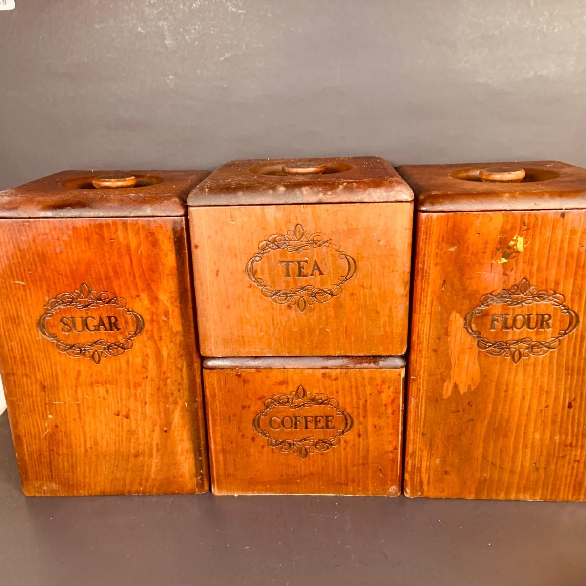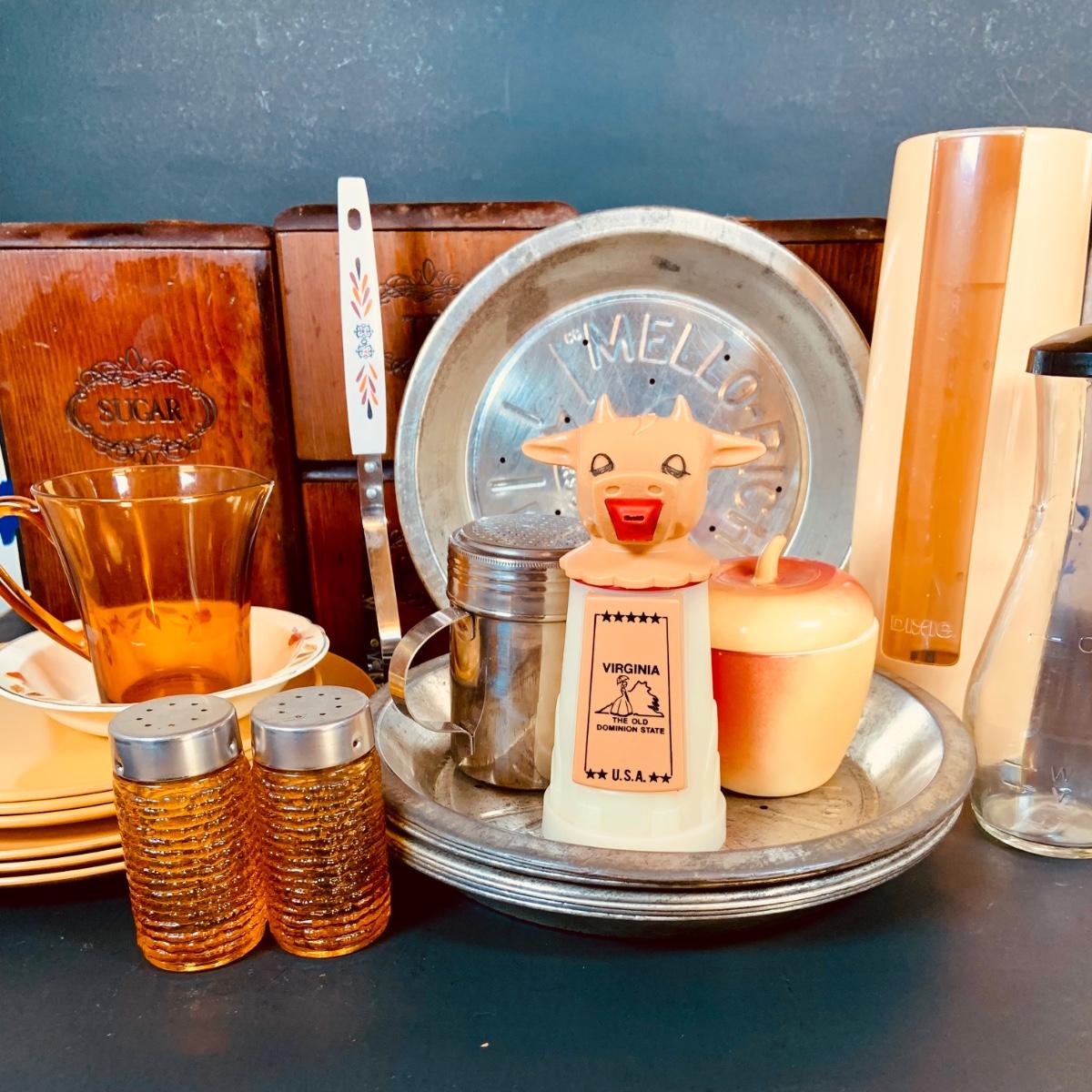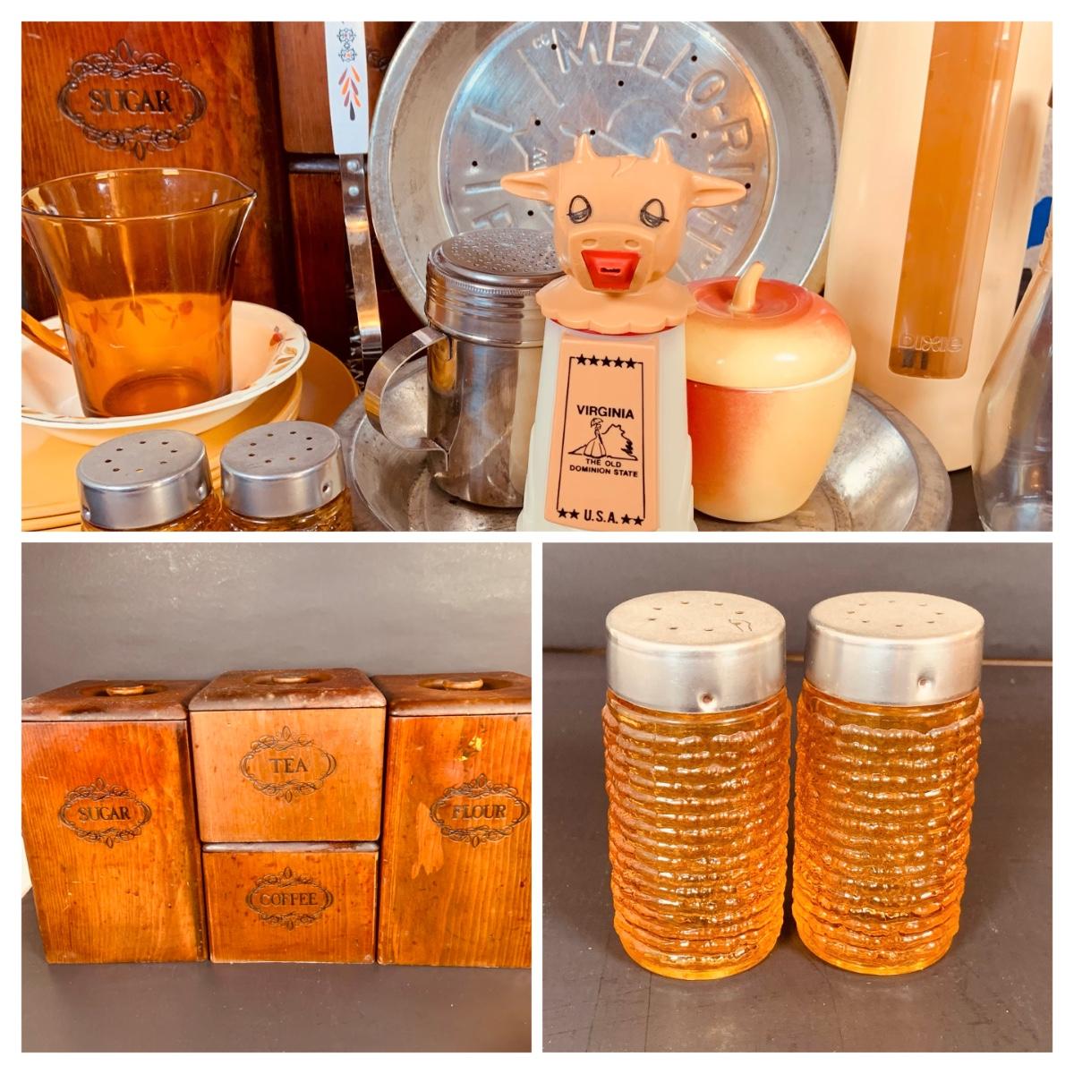LOT:82: Vintage Kitchen Featuring a 4 Piece Wooden Canister Set Amber Glass Salt and Pepper Shakers, Cow Creamer, Mrs. Smilth Mello-Rich Pie Tins and More