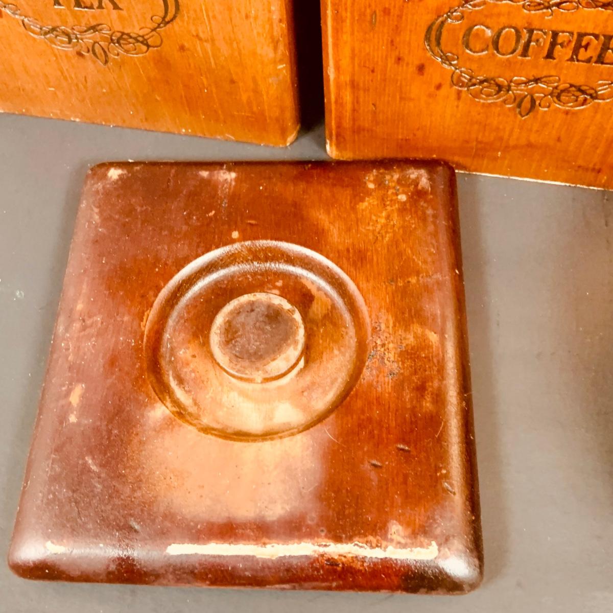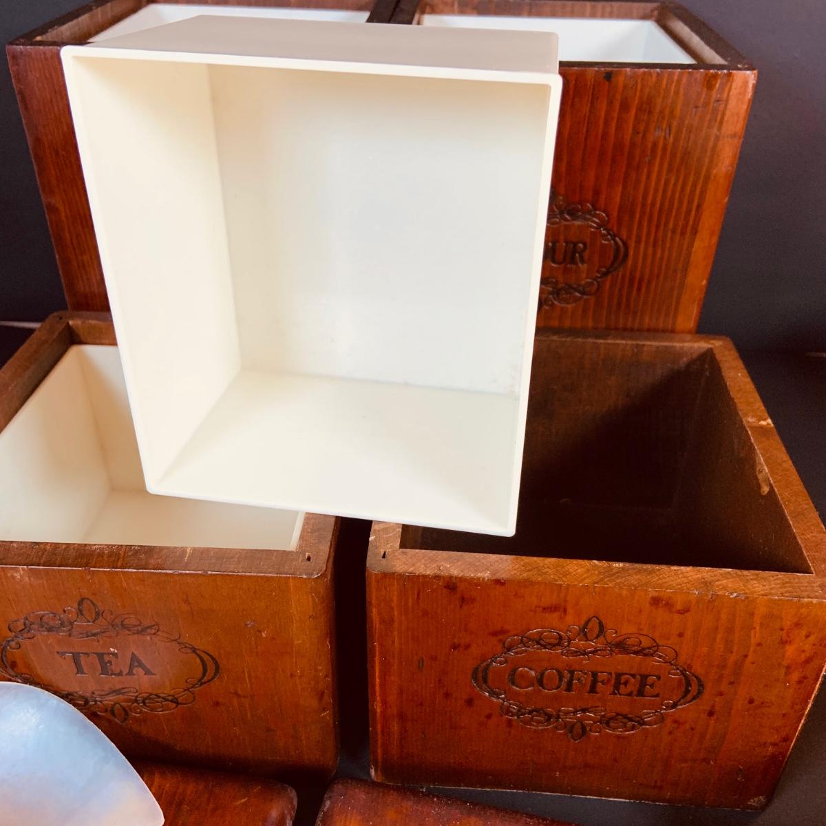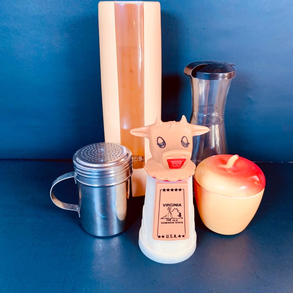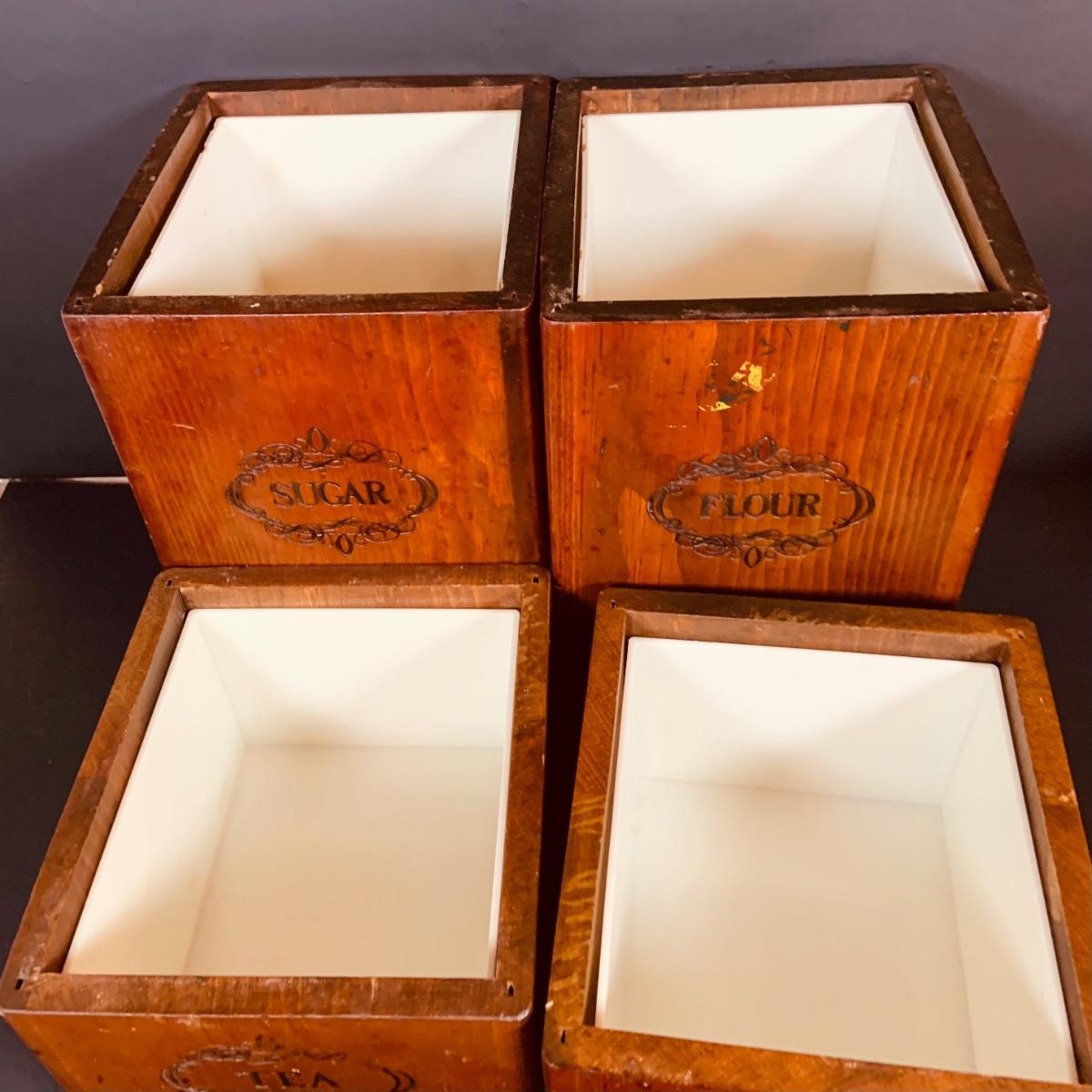 LOT:82: Vintage Kitchen Featuring a 4 Piece Wooden Canister Set Amber Glass Salt and Pepper Shakers, Cow Creamer, Mrs. Smilth Mello-Rich Pie Tins and More