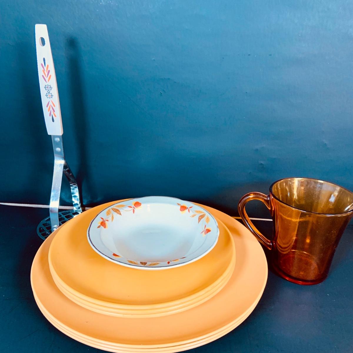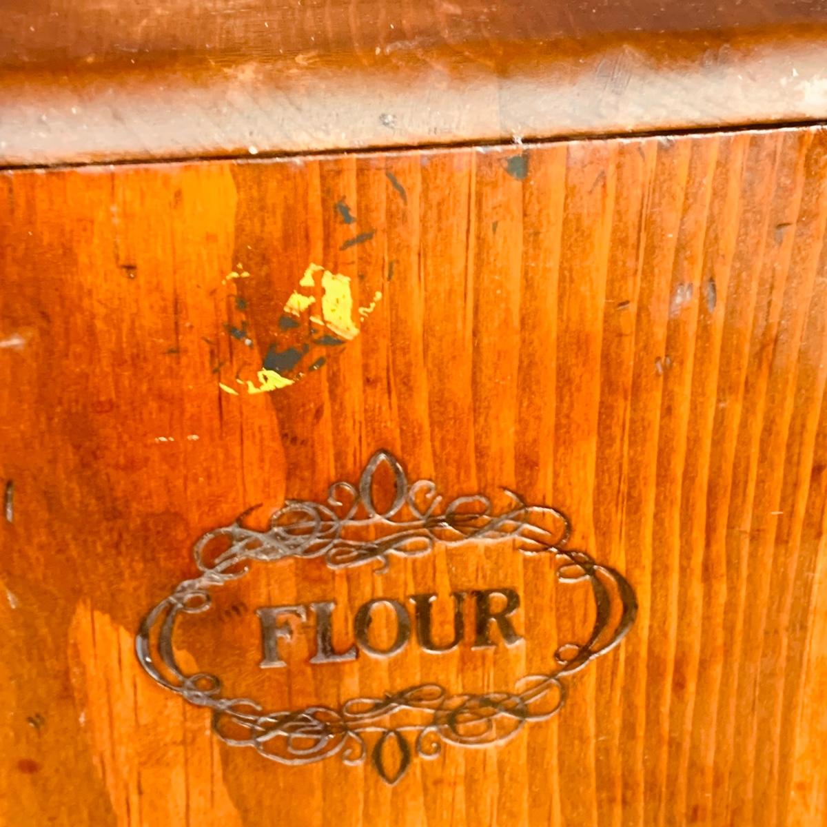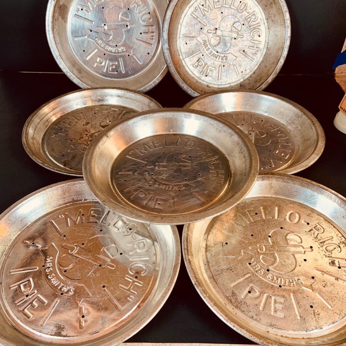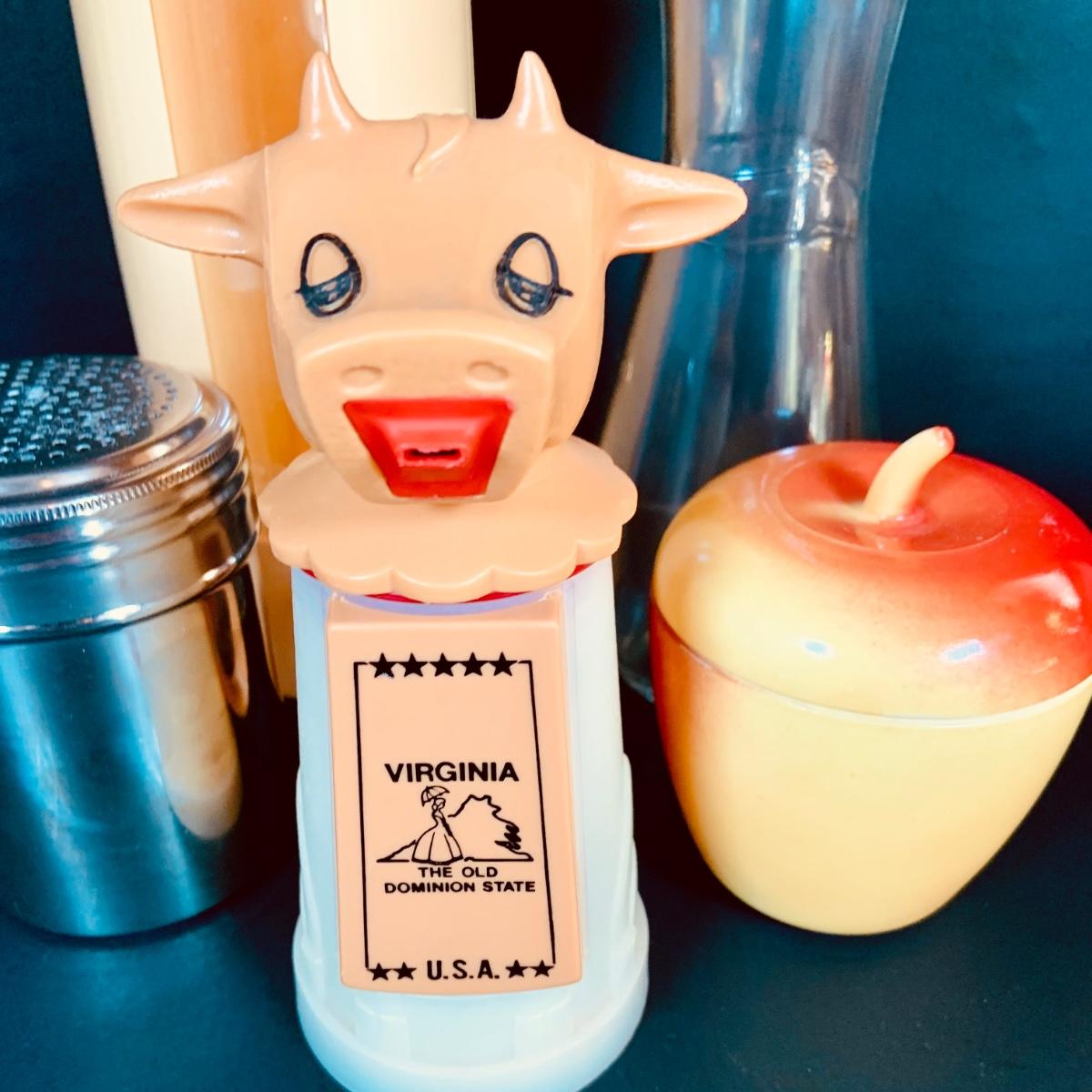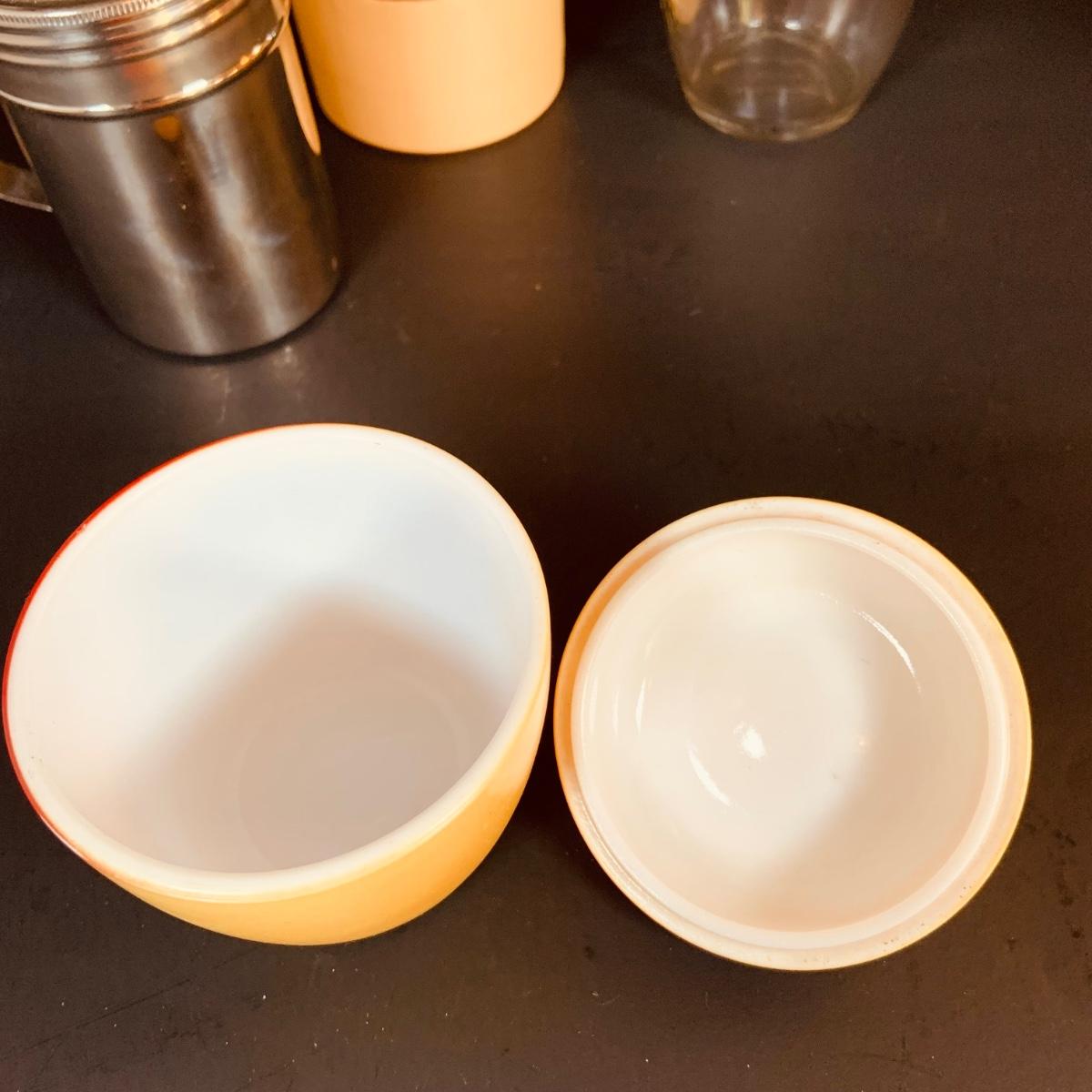 LOT:82: Vintage Kitchen Featuring a 4 Piece Wooden Canister Set Amber Glass Salt and Pepper Shakers, Cow Creamer, Mrs. Smilth Mello-Rich Pie Tins and More