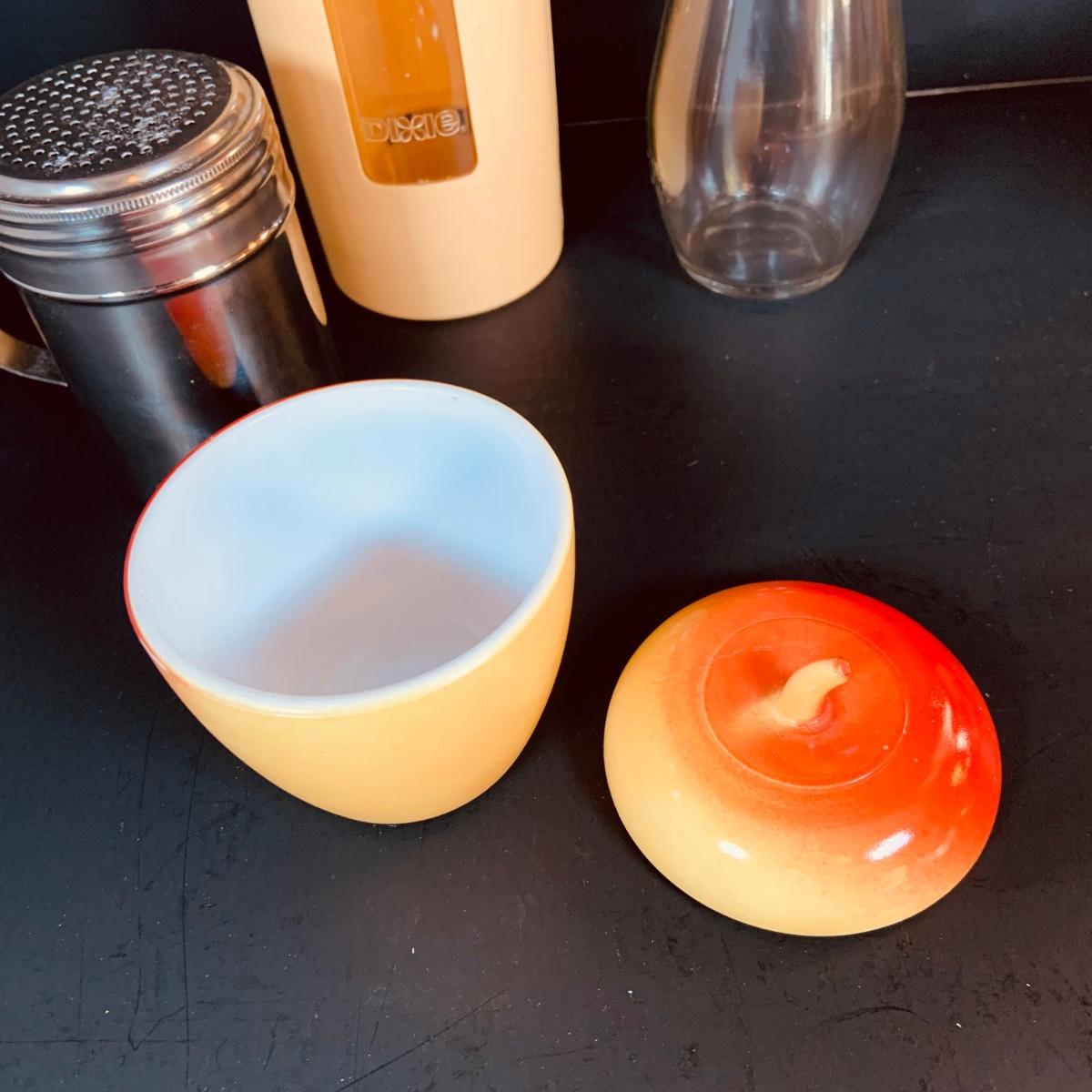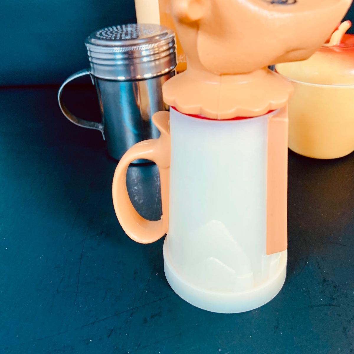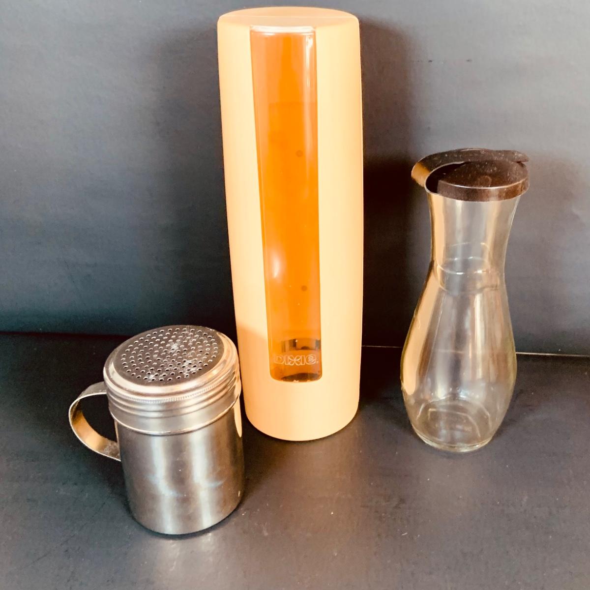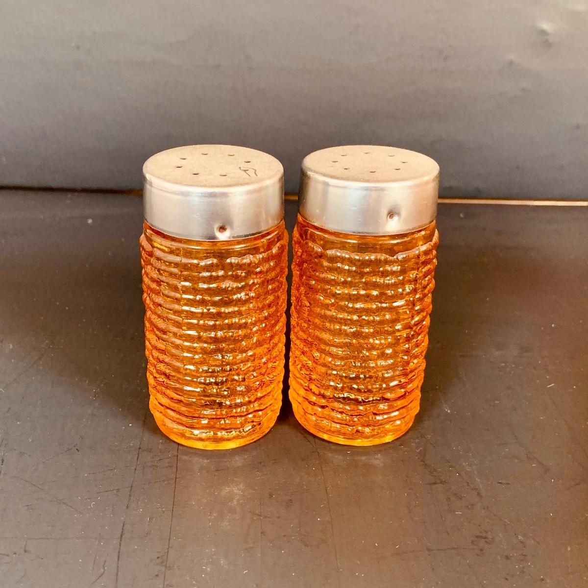 LOT:82: Vintage Kitchen Featuring a 4 Piece Wooden Canister Set Amber Glass Salt and Pepper Shakers, Cow Creamer, Mrs. Smilth Mello-Rich Pie Tins and More
