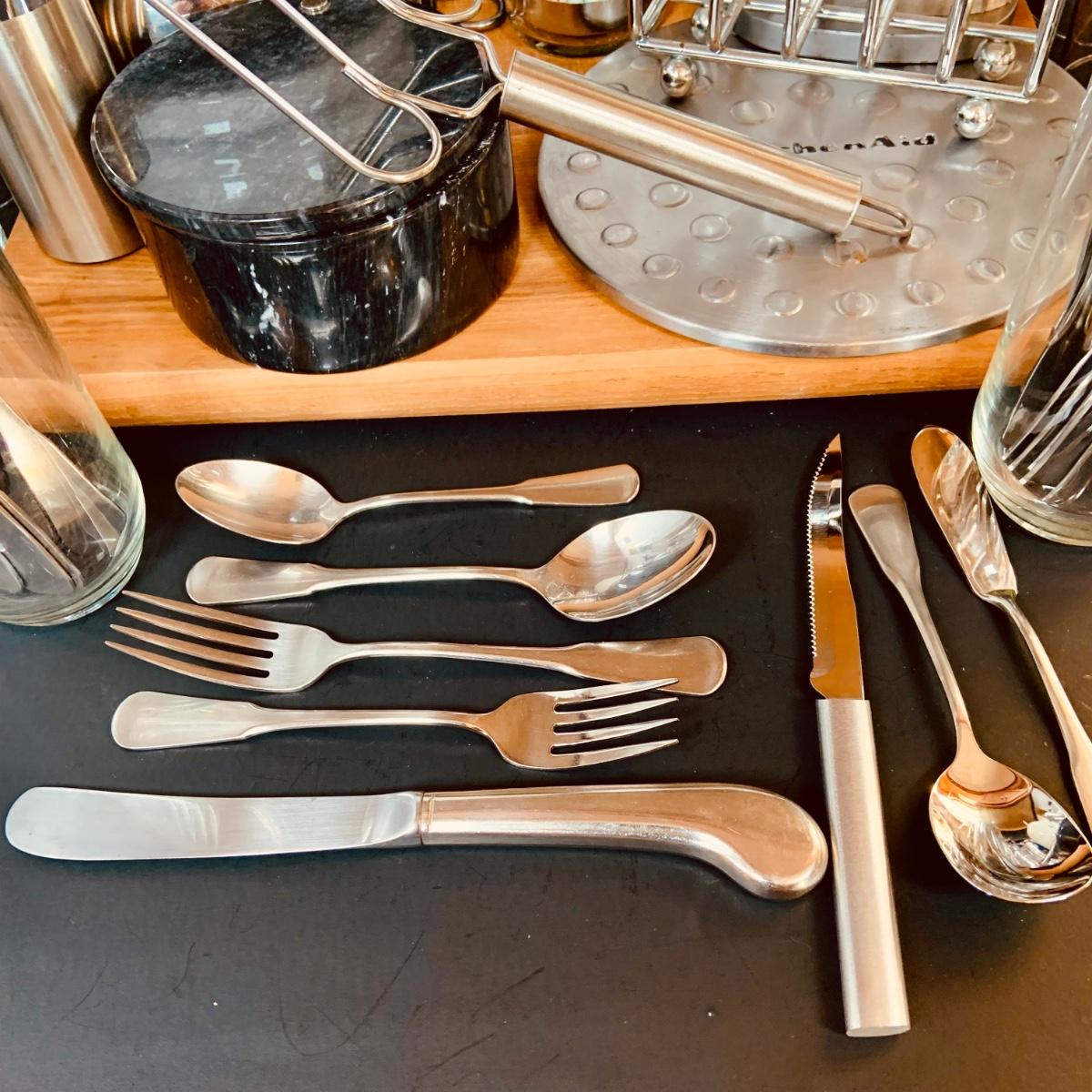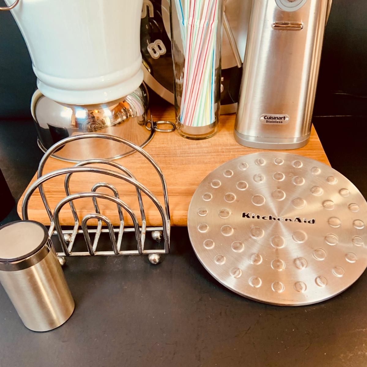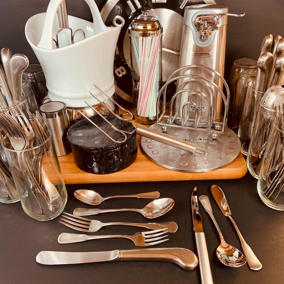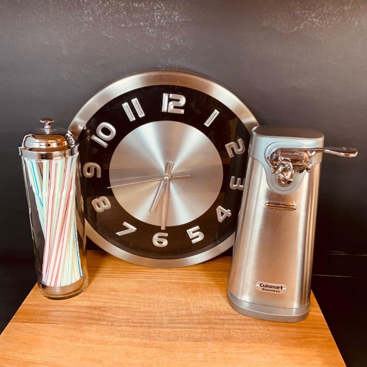 LOT:5: Collection of Stainless Steel Kitchen Tools Including a Cuisinart Electric Can Opener, Straw Holder, Large Clock, Kitchen Aid Trivet Over 70 Pieces of Oneida Flatware, and More