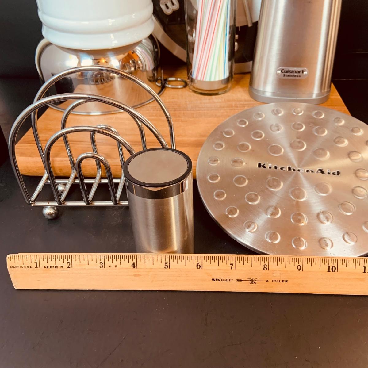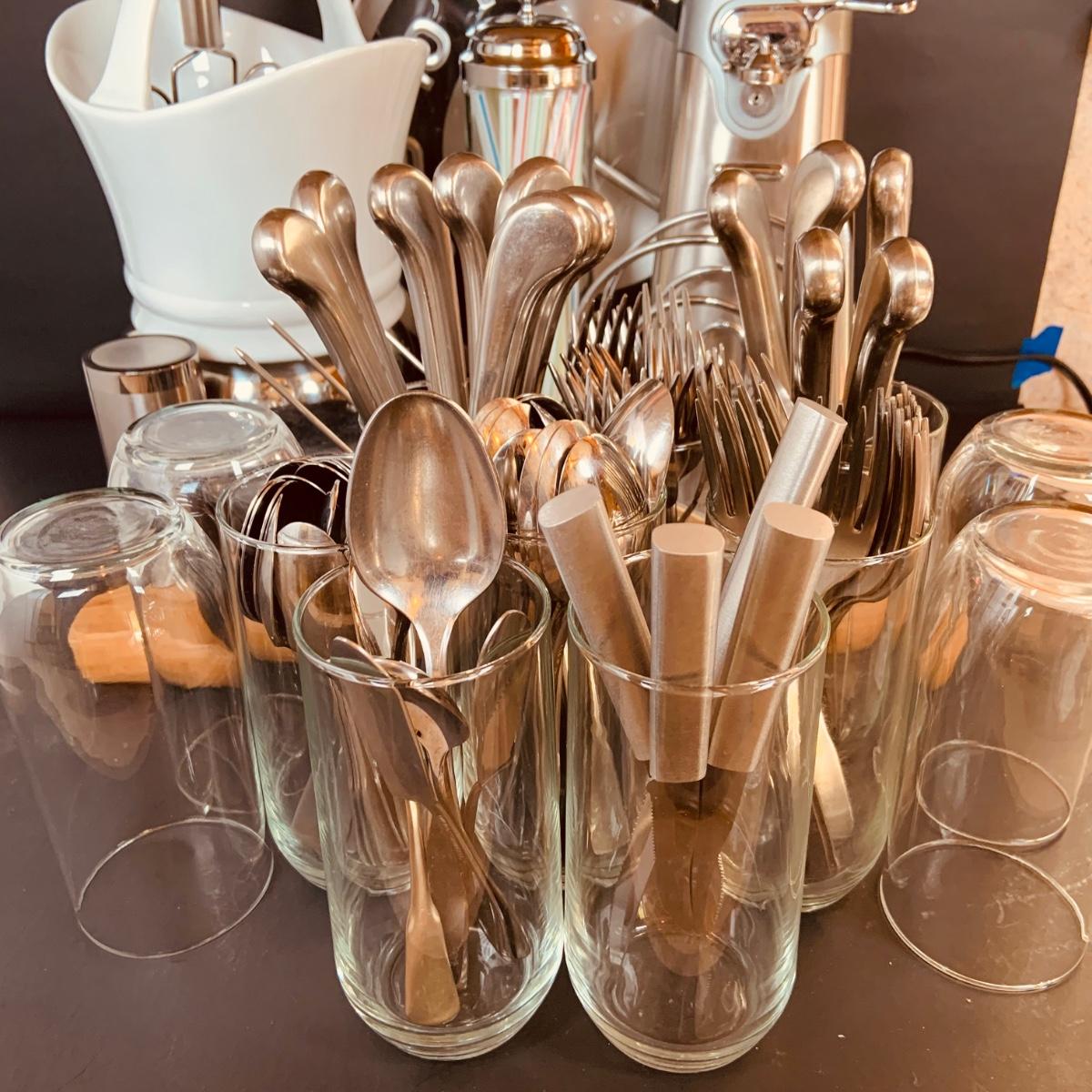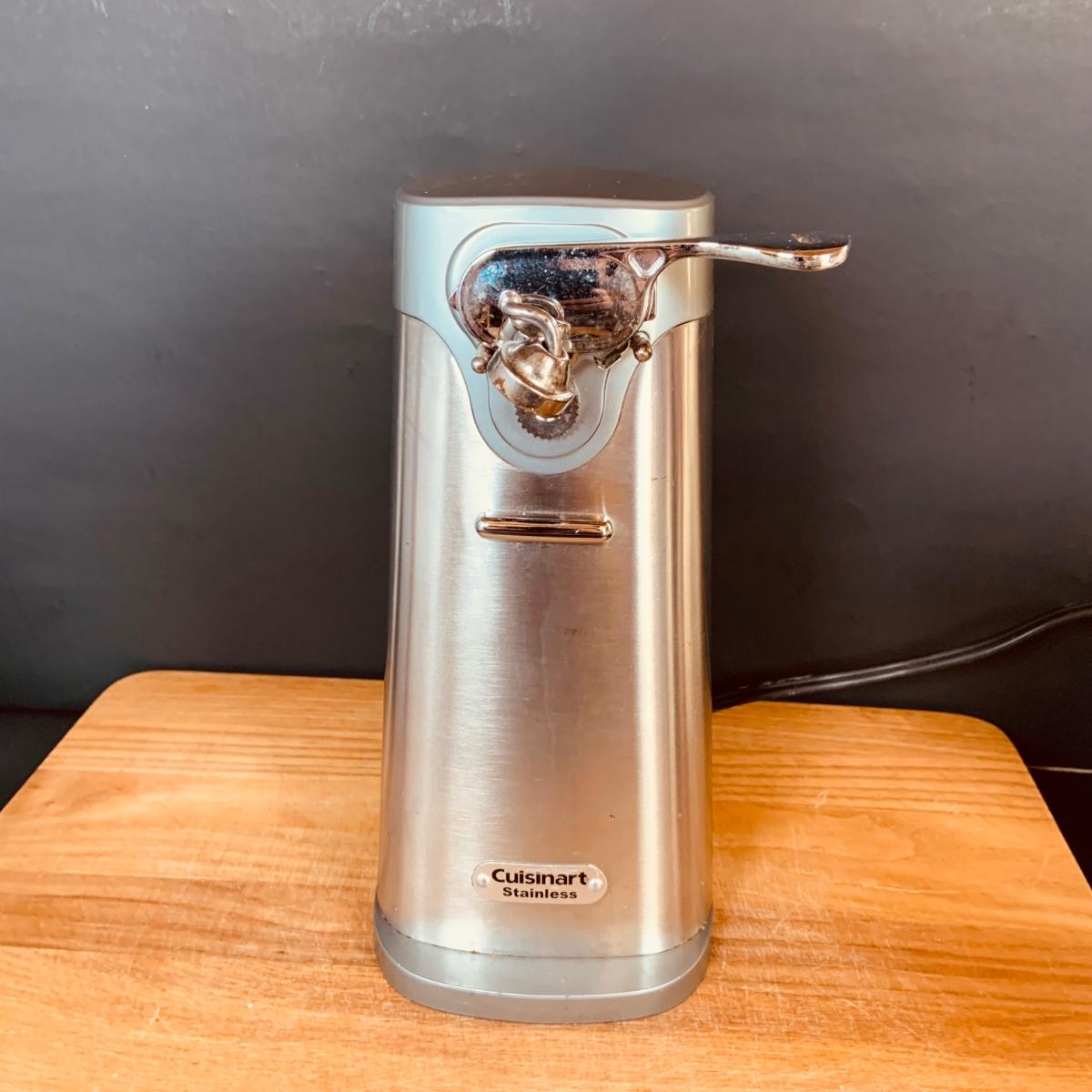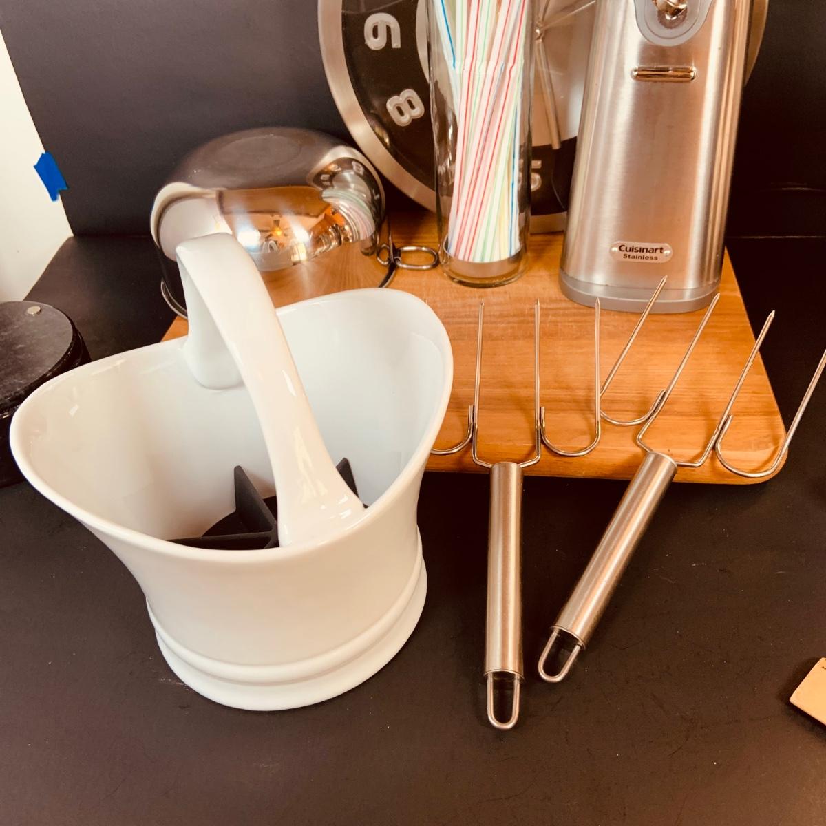 LOT:5: Collection of Stainless Steel Kitchen Tools Including a Cuisinart Electric Can Opener, Straw Holder, Large Clock, Kitchen Aid Trivet Over 70 Pieces of Oneida Flatware, and More