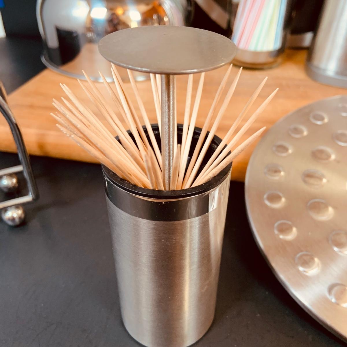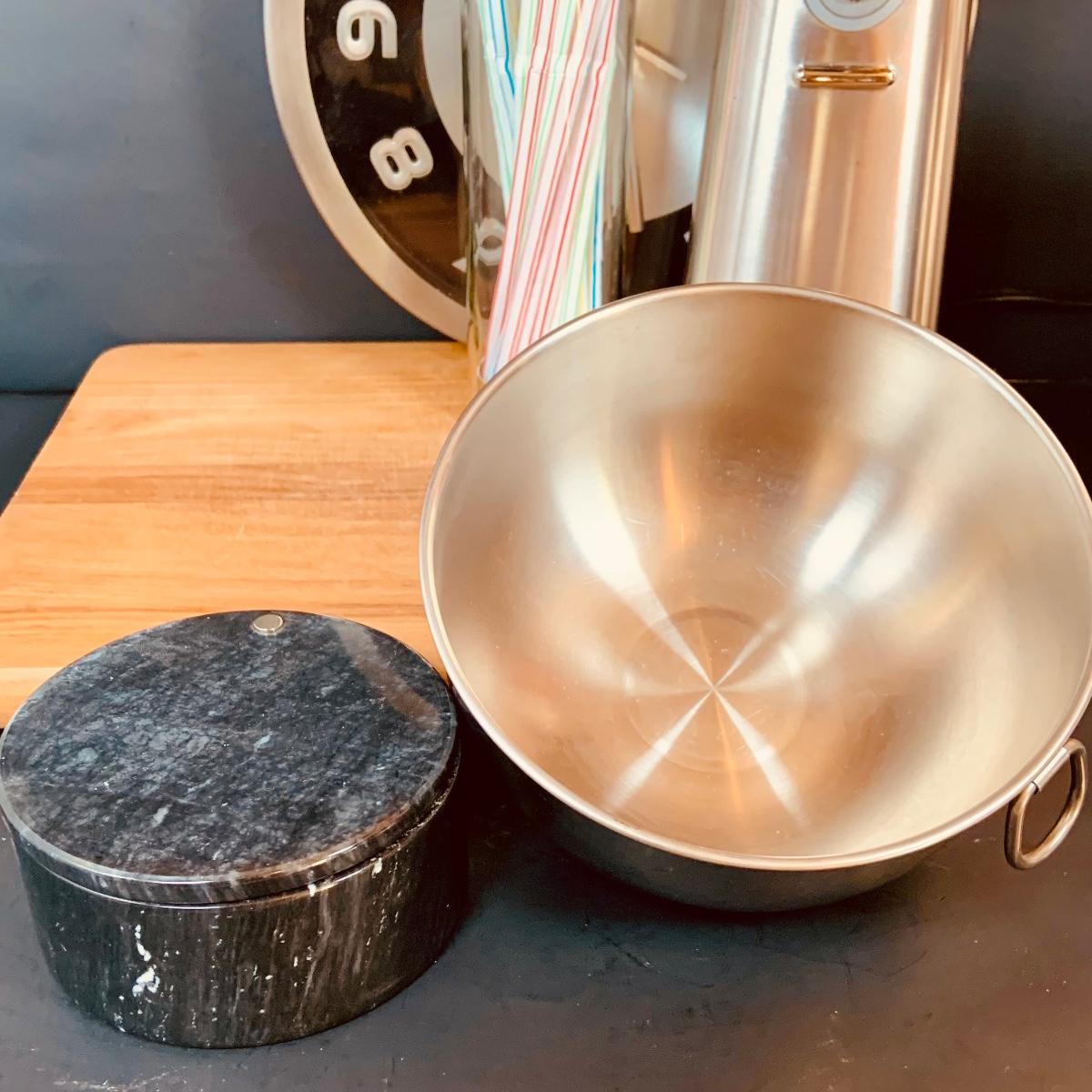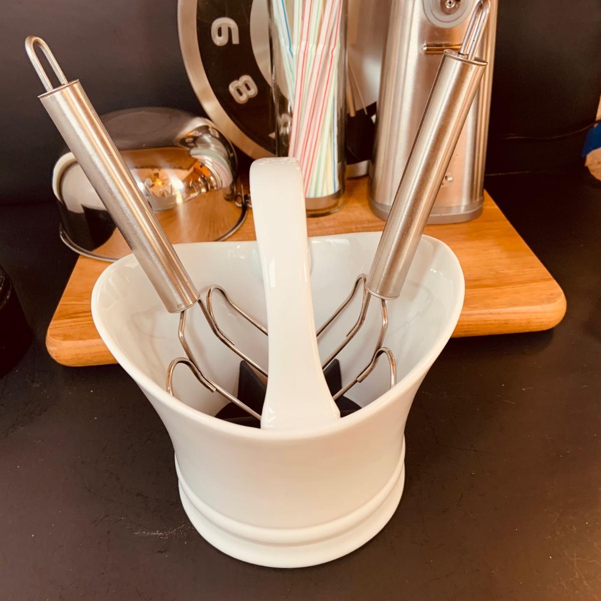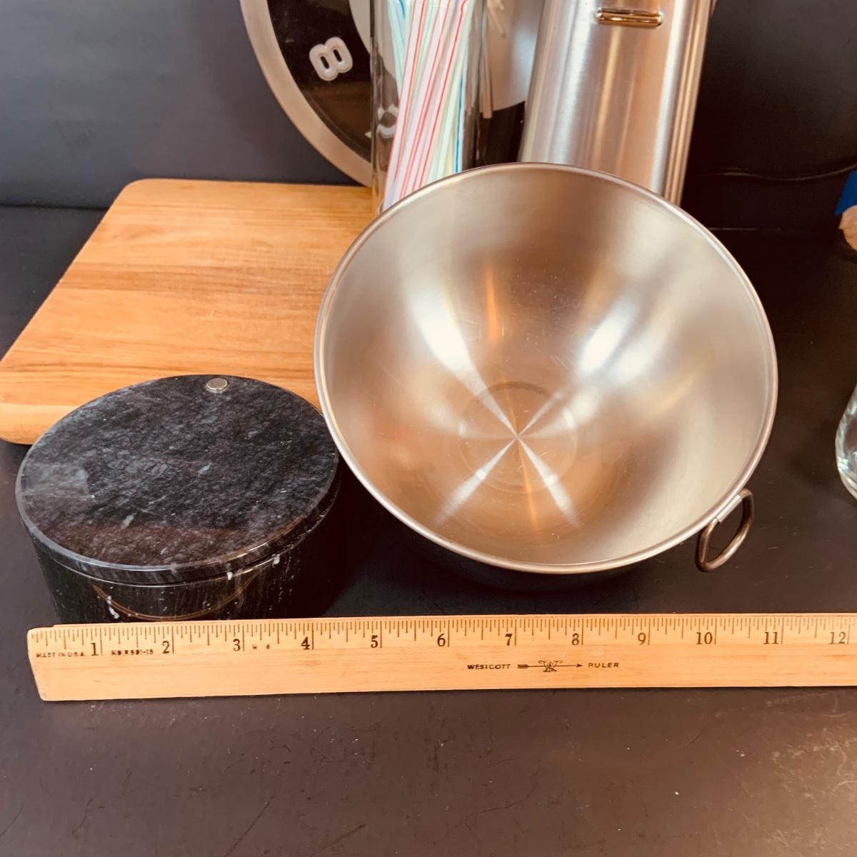 LOT:5: Collection of Stainless Steel Kitchen Tools Including a Cuisinart Electric Can Opener, Straw Holder, Large Clock, Kitchen Aid Trivet Over 70 Pieces of Oneida Flatware, and More