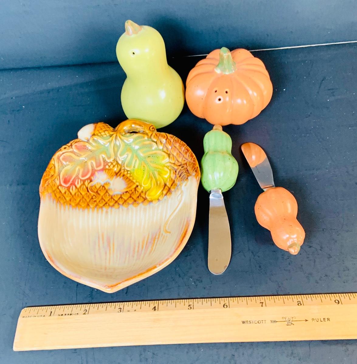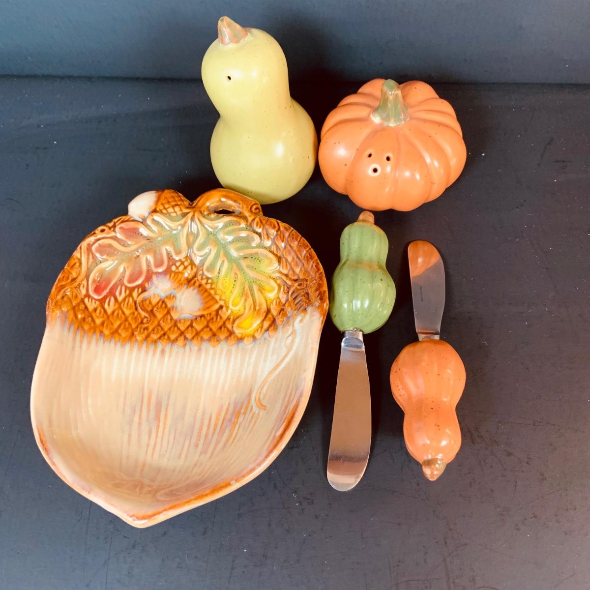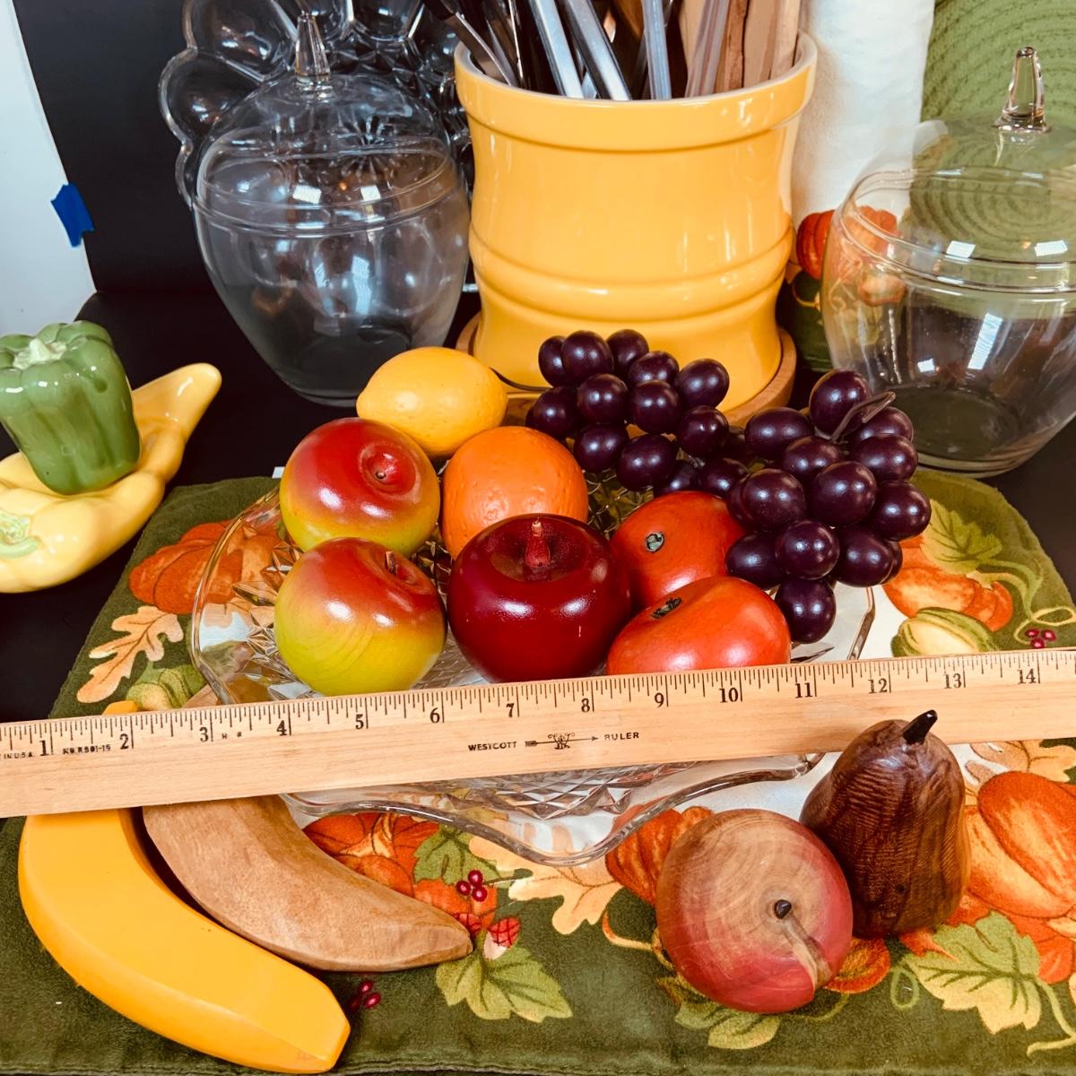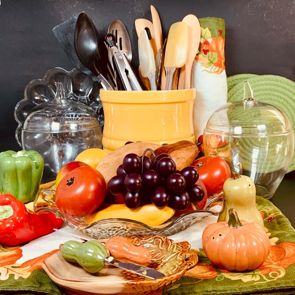 LOT:86: The Fall Kitchen with Vintage Wood Fruit, Ceramic Salt and Pepper sets, Glass Apple Jars, Pyrex Rupper Spatulas, a Stoneware Chefs Utensle Caddy with a Lazy Susan Base. Autum Placemats & More