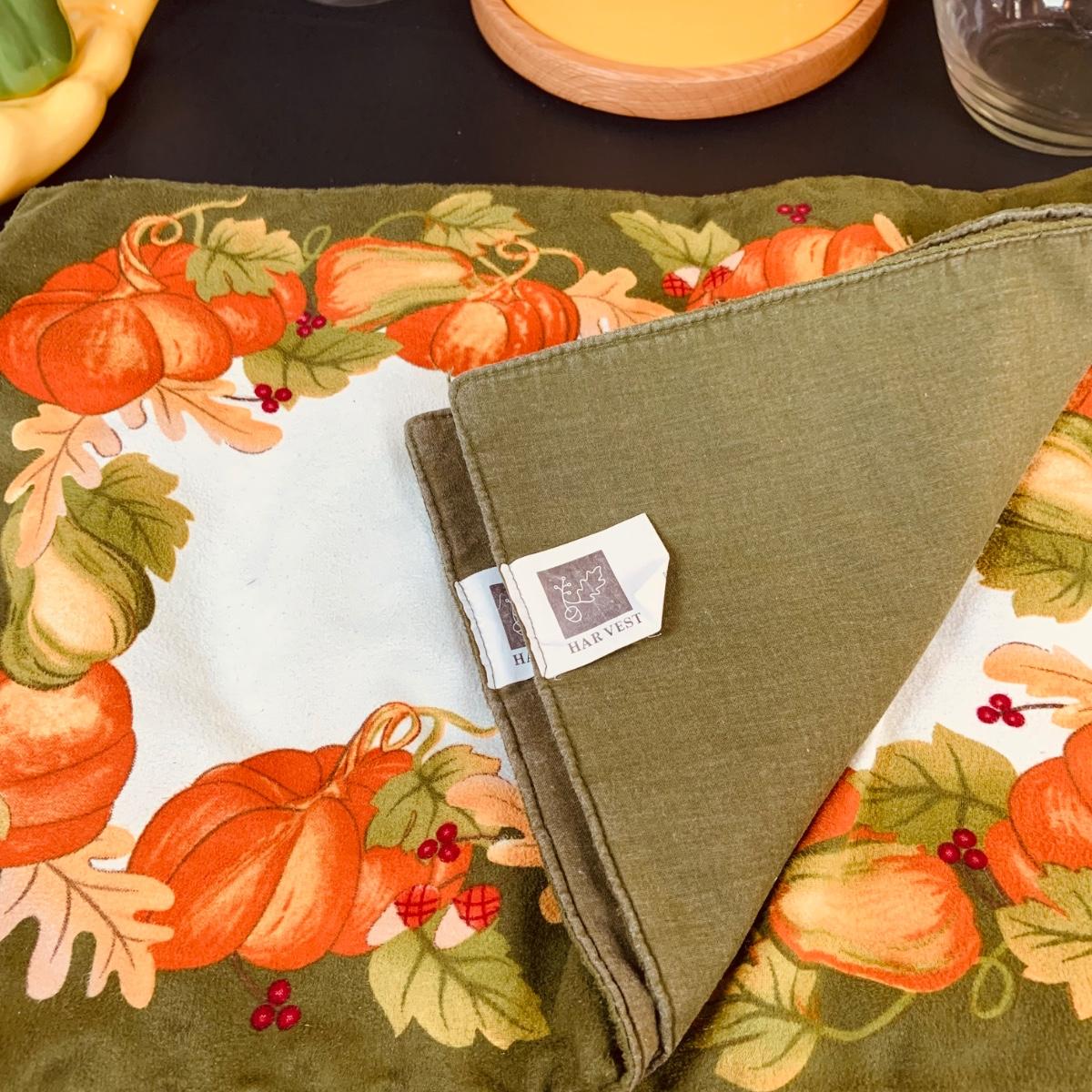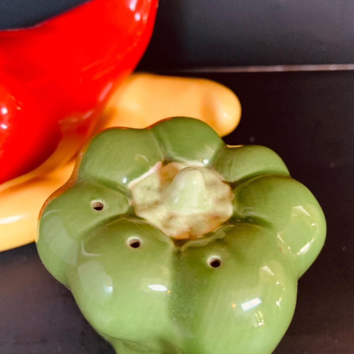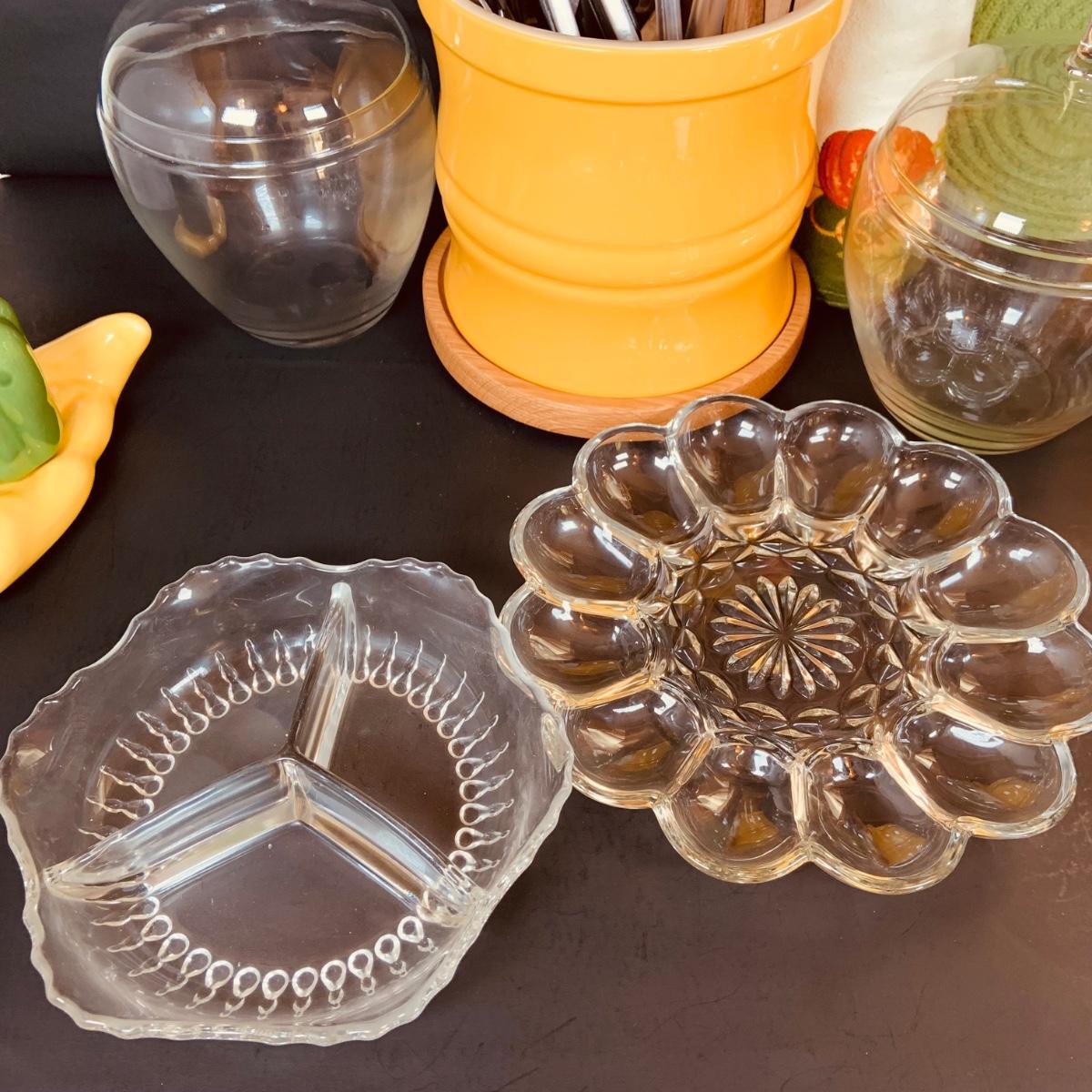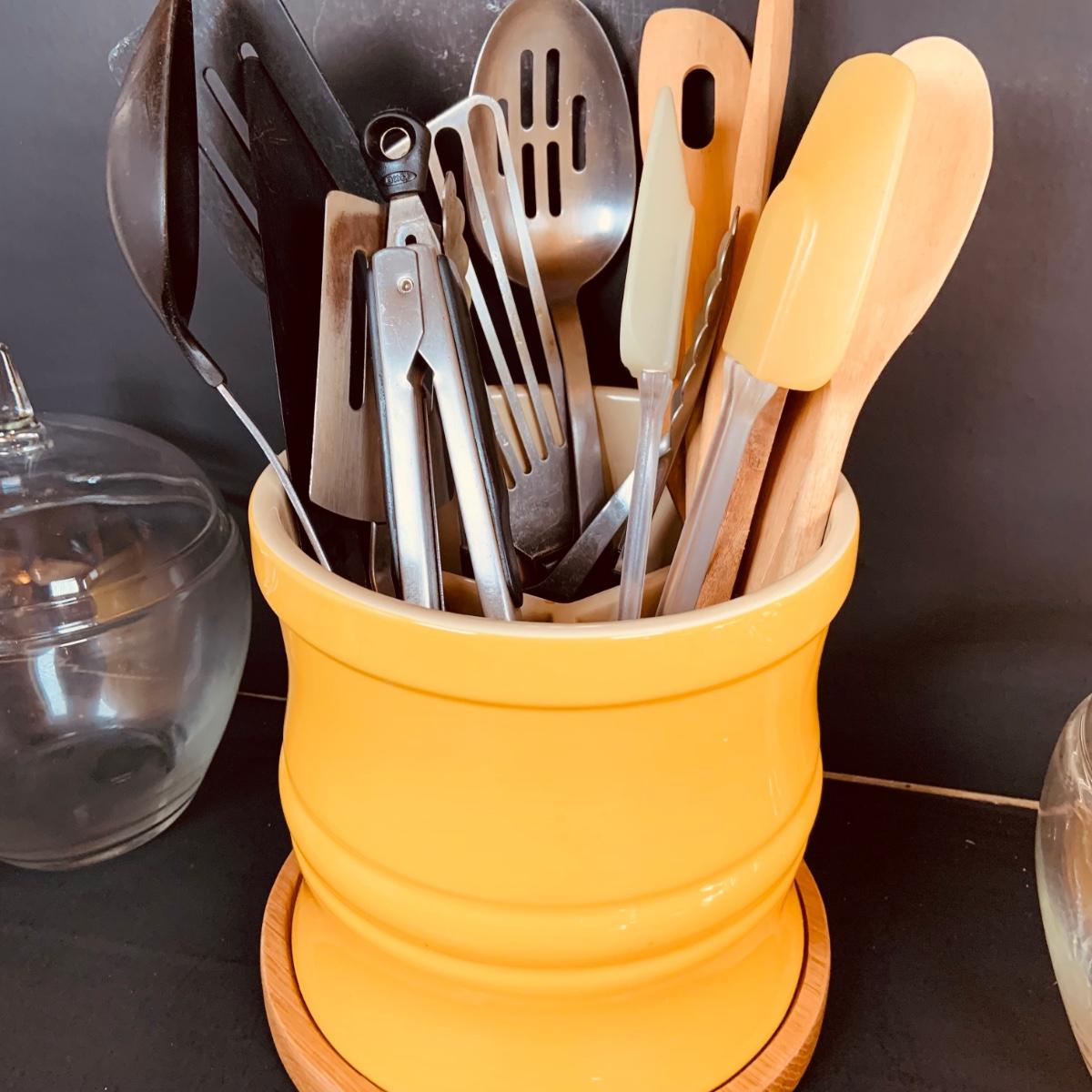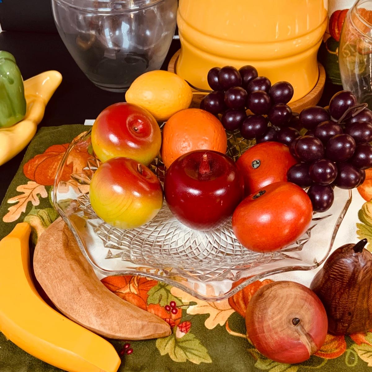 LOT:86: The Fall Kitchen with Vintage Wood Fruit, Ceramic Salt and Pepper sets, Glass Apple Jars, Pyrex Rupper Spatulas, a Stoneware Chefs Utensle Caddy with a Lazy Susan Base. Autum Placemats & More