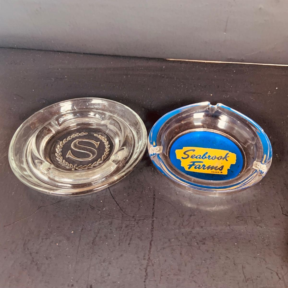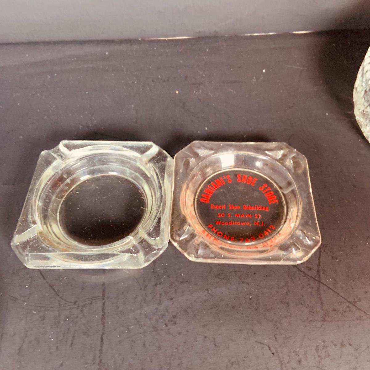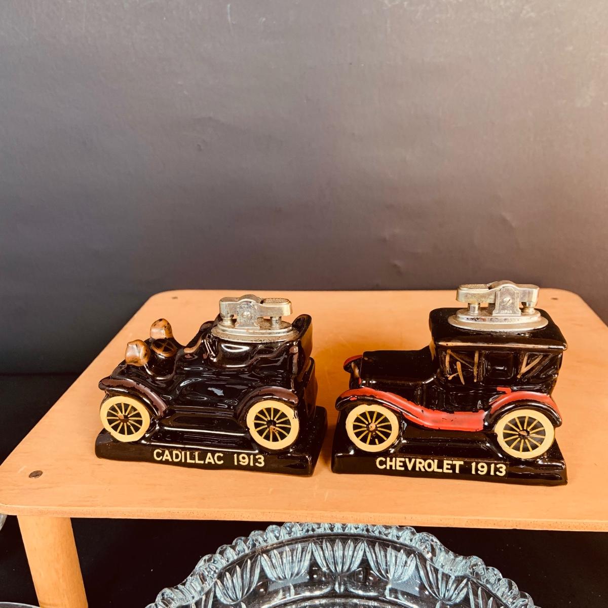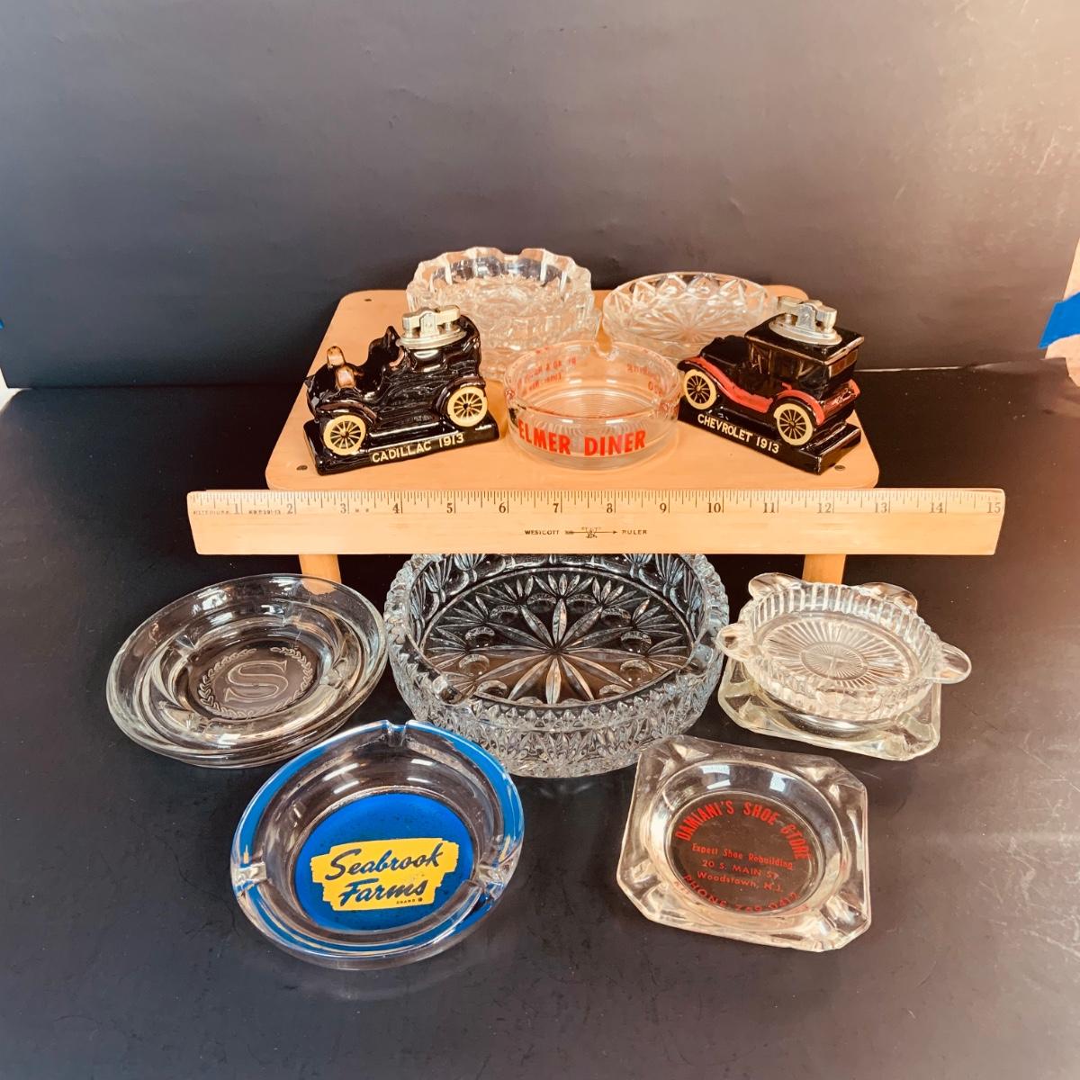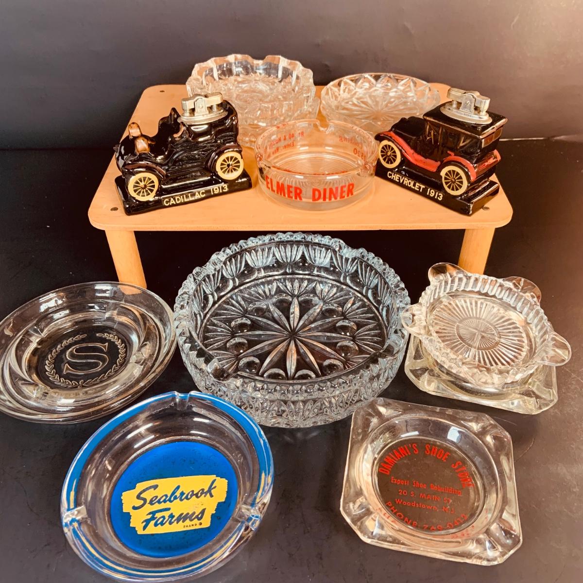 LOT:93: Collection of Vintage Mid Century Glass. Plastic and Crystal Ashtrays and 2 Car Shaped Lighters