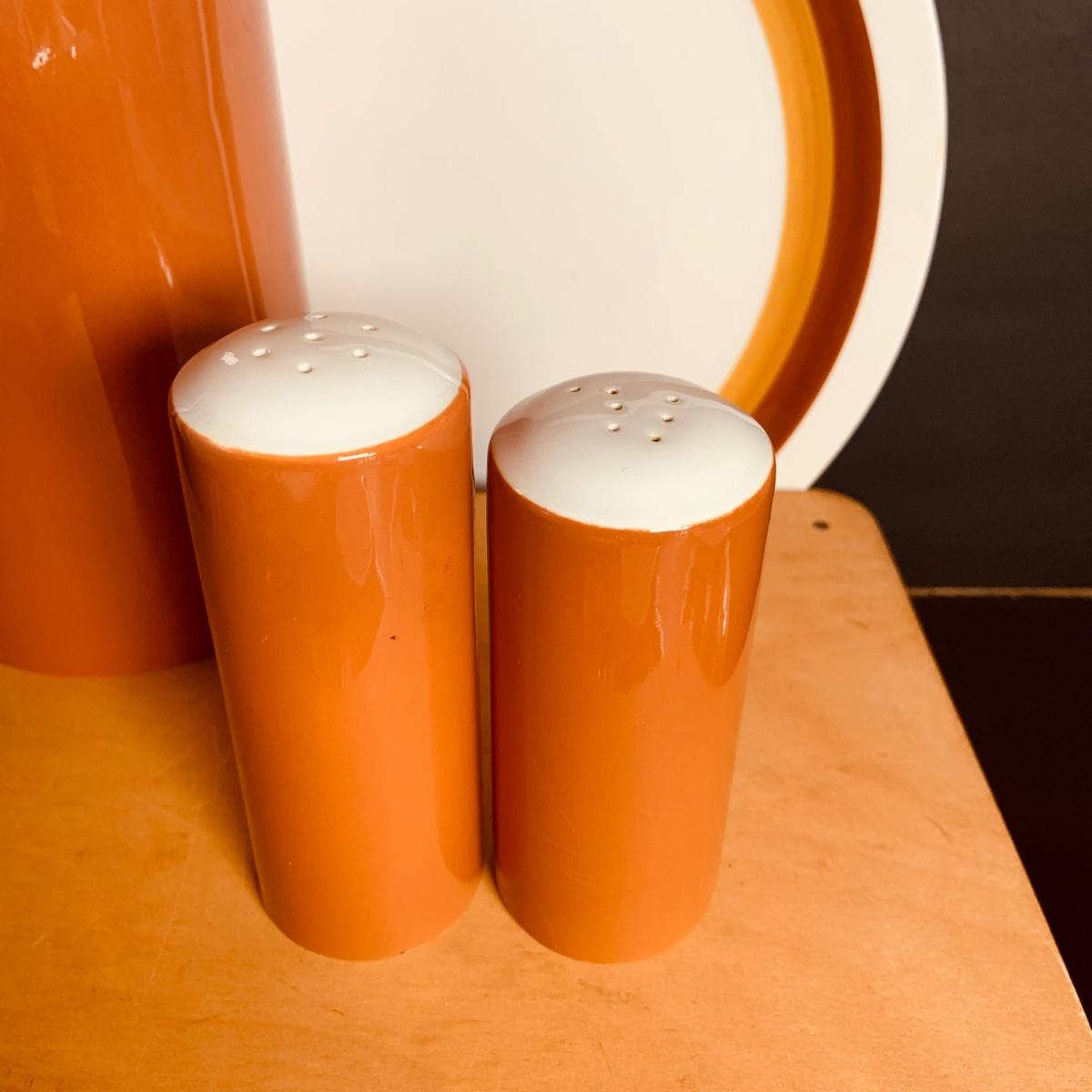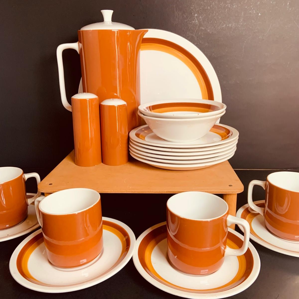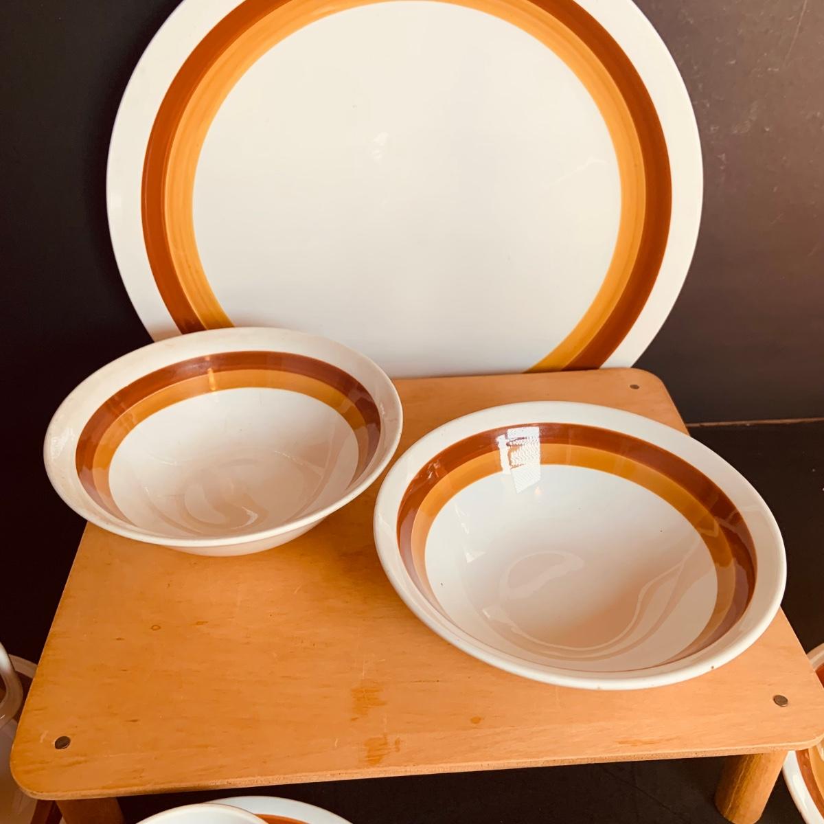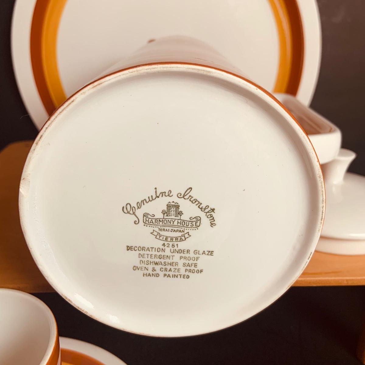 LOT:95: Mid Century Harmony House Ironstone Coffee Decanter, Salt and Pepper Shakers, Cups and Saucers, Salad Dishes and Bowls and Platter.
