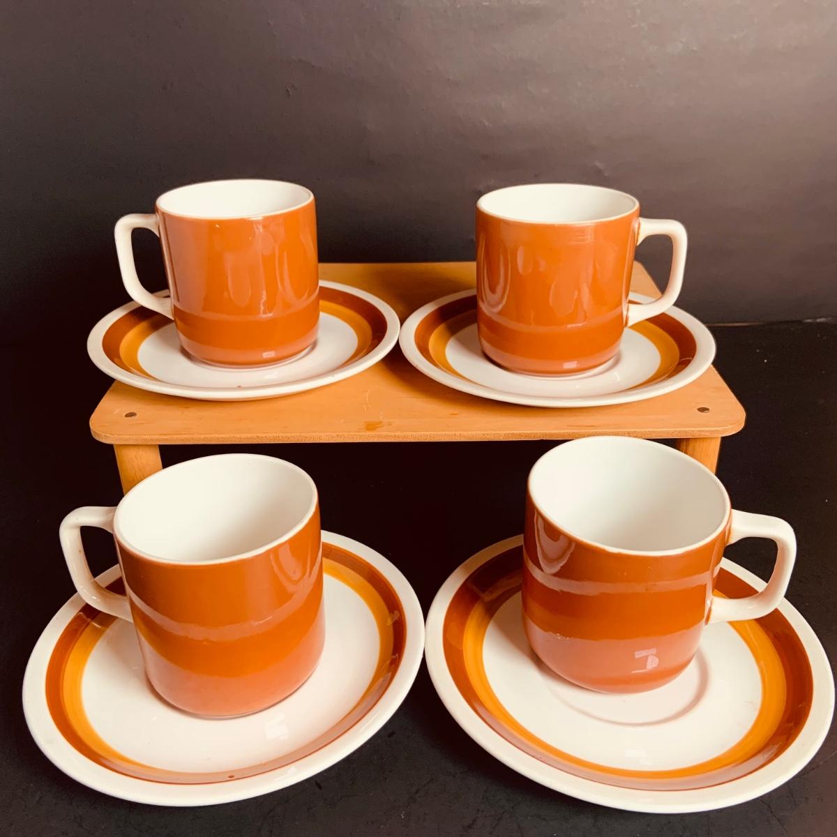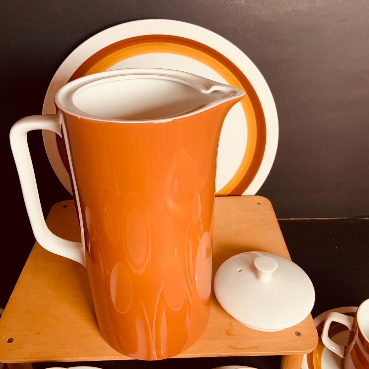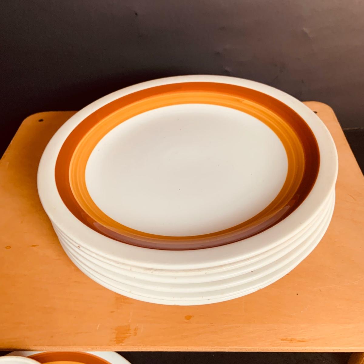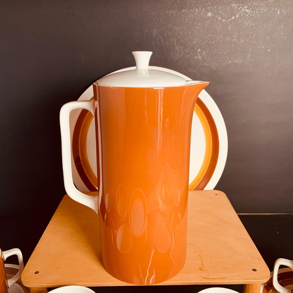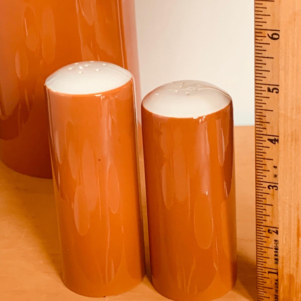 LOT:95: Mid Century Harmony House Ironstone Coffee Decanter, Salt and Pepper Shakers, Cups and Saucers, Salad Dishes and Bowls and Platter.