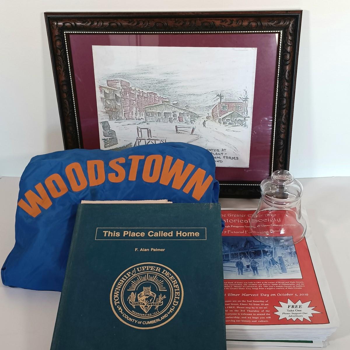 LOT 111: Local History Collection- Woodstown Jacket, SeaBrook Farms Watercolor Print, Elmer Historical Society Fundraiser Books & More