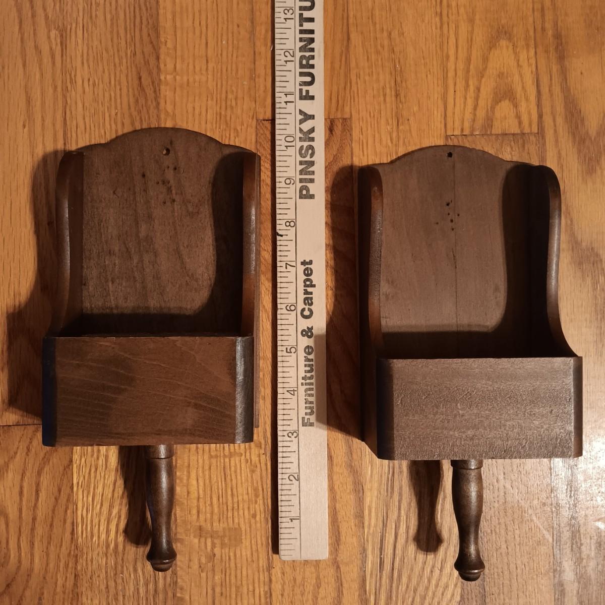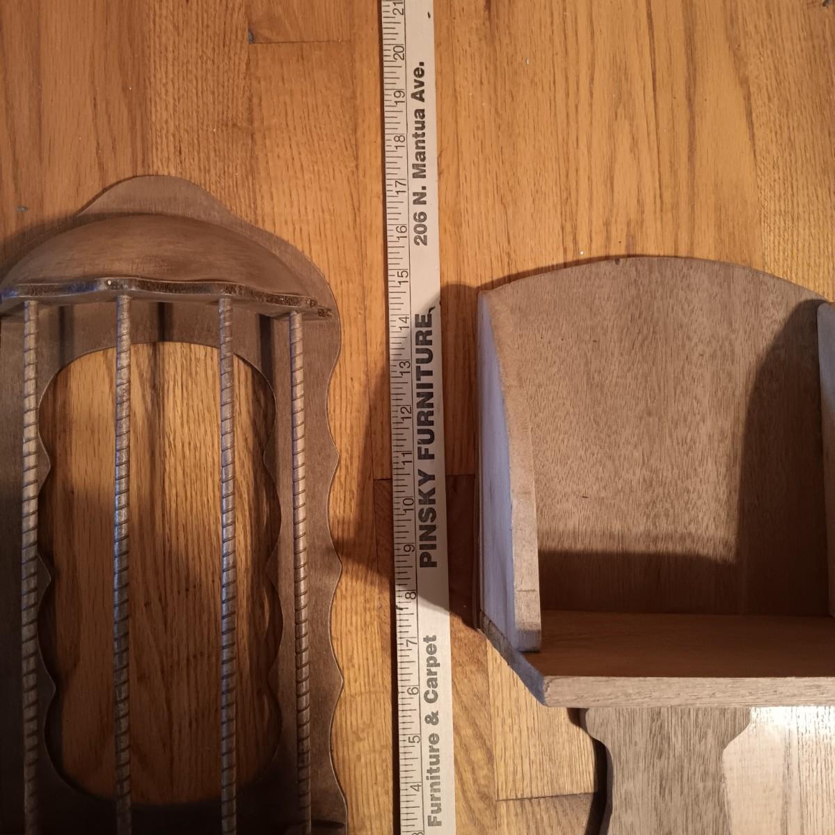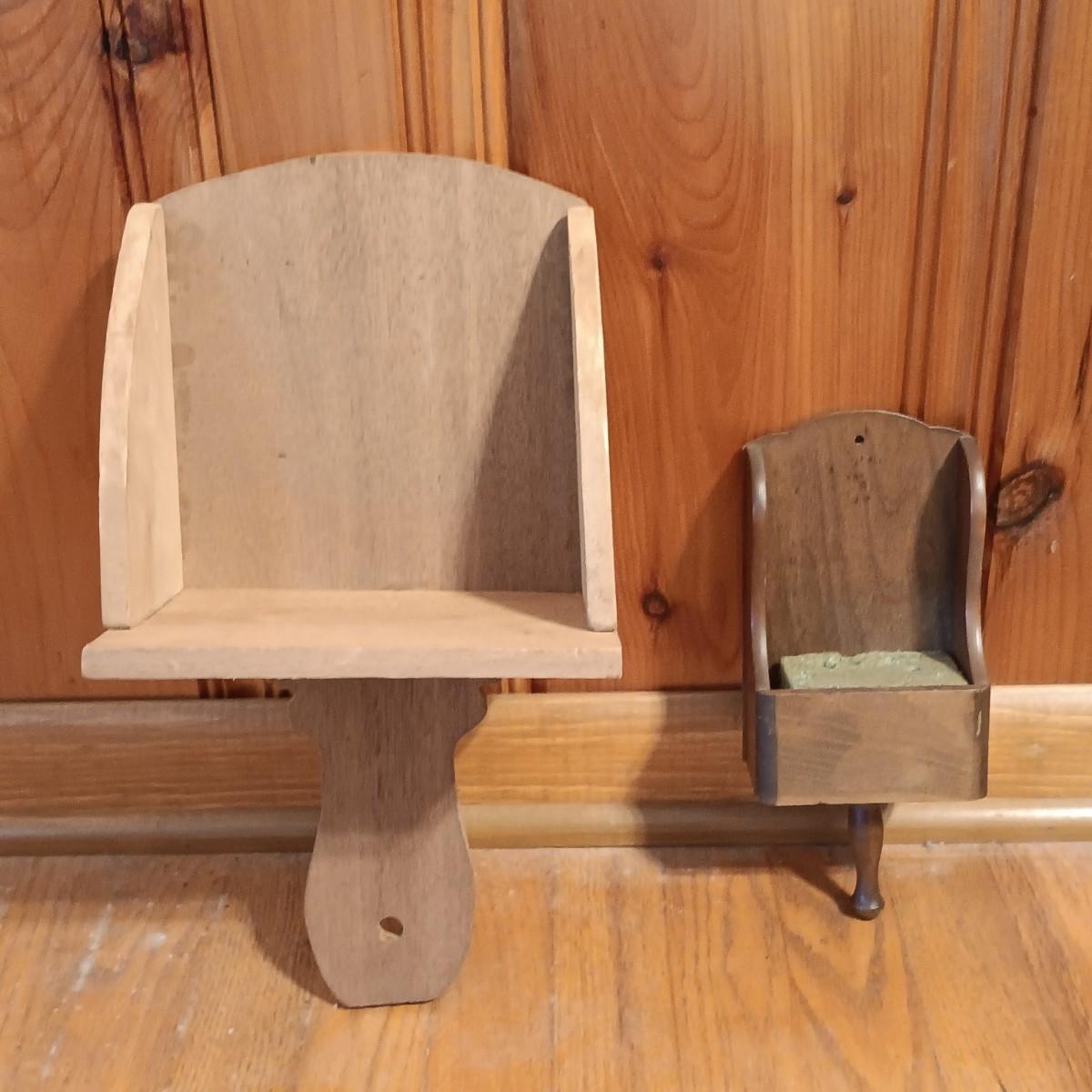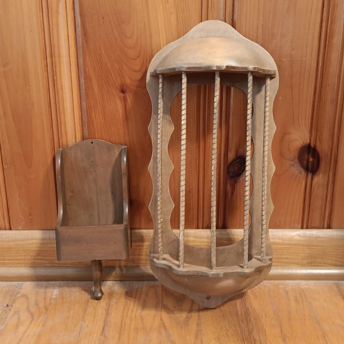 LOT 123: Primitive Decor Wood Scoop Wall Shelves, Wood Bucket and Wood Pocket Cage