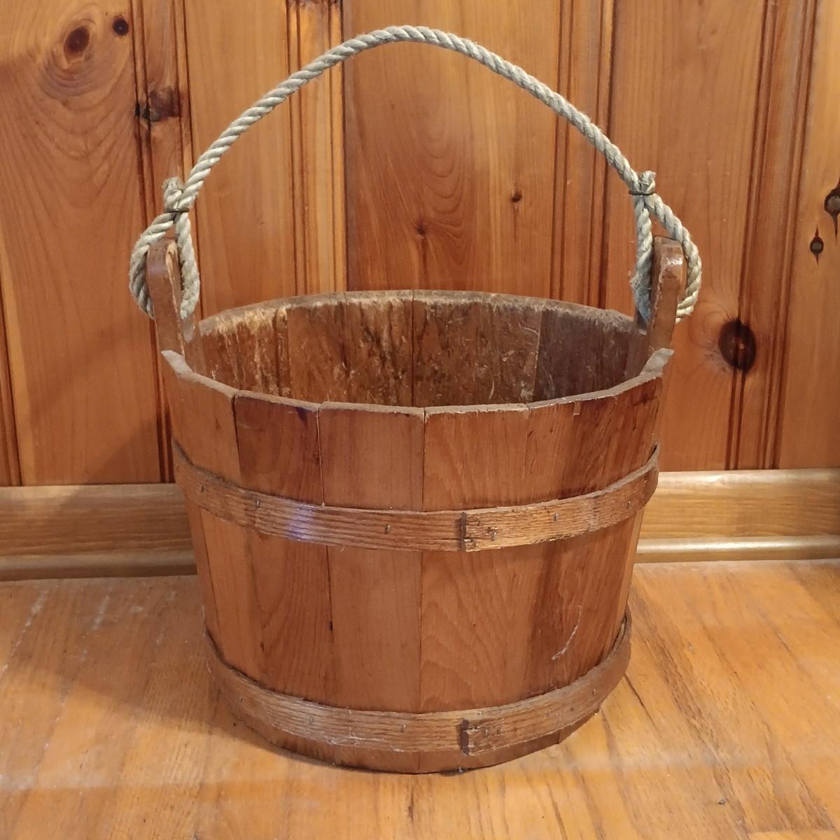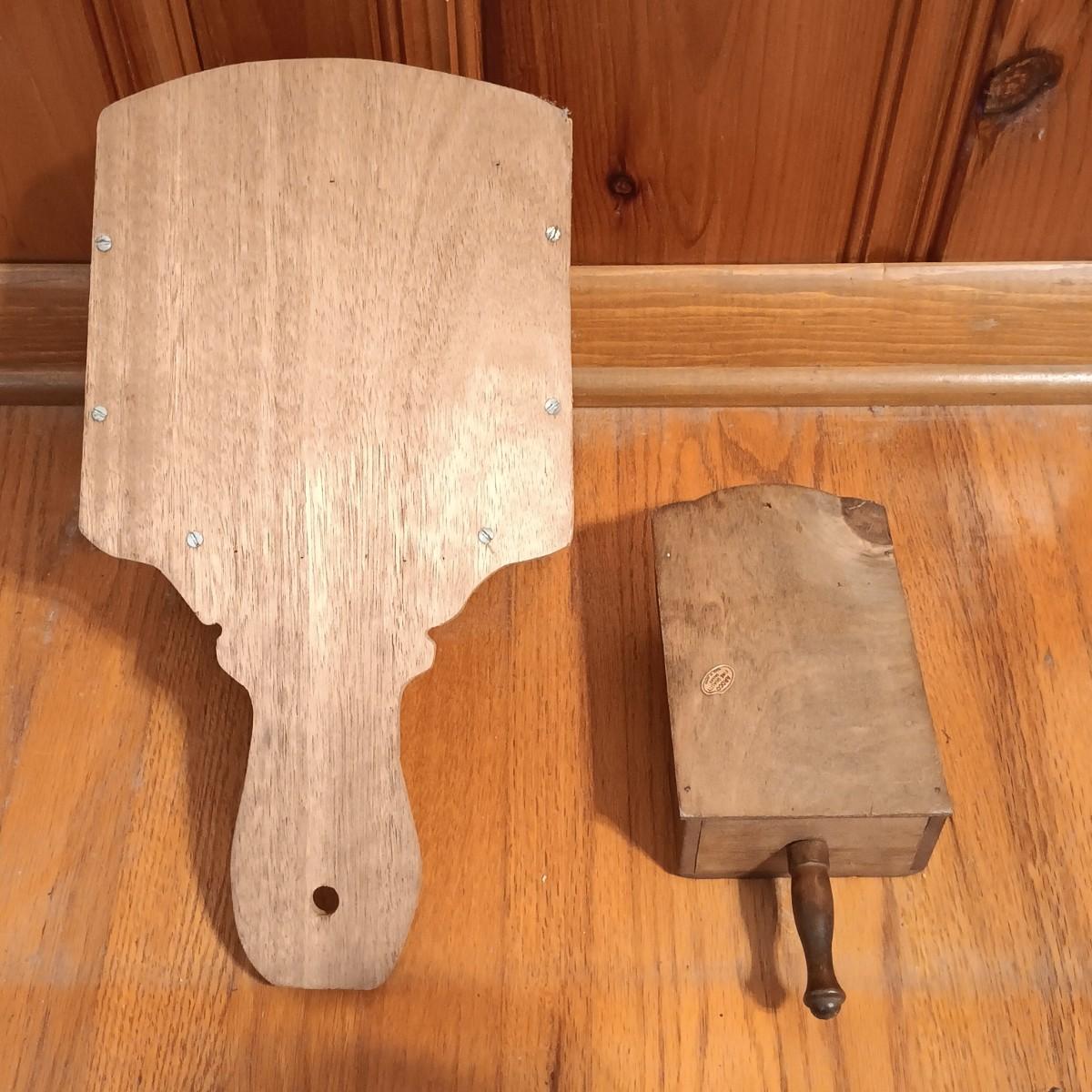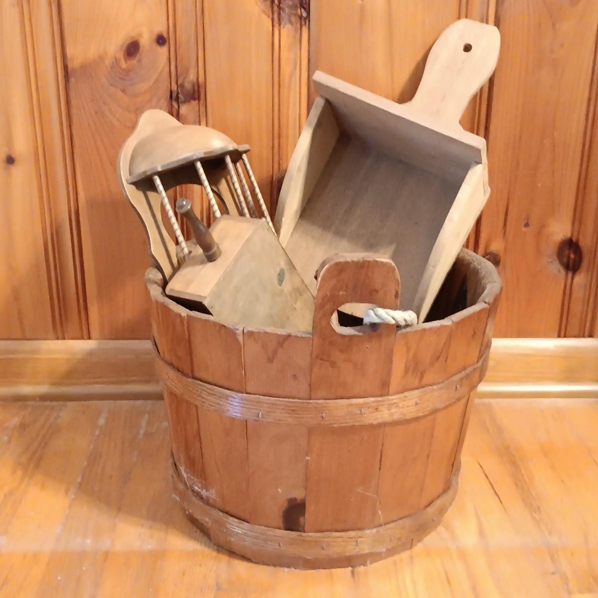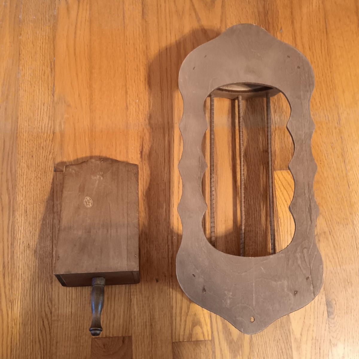 LOT 123: Primitive Decor Wood Scoop Wall Shelves, Wood Bucket and Wood Pocket Cage