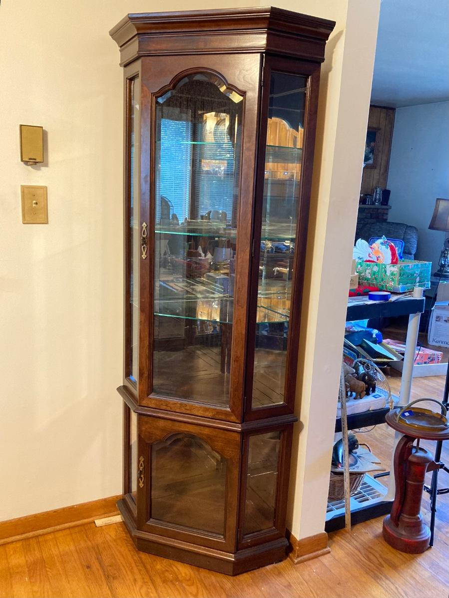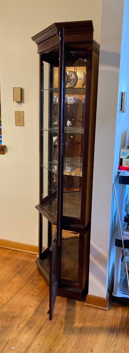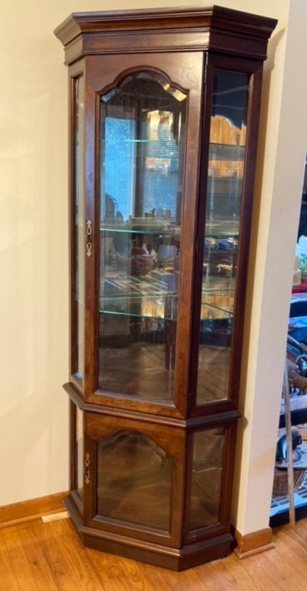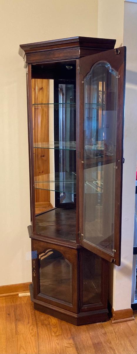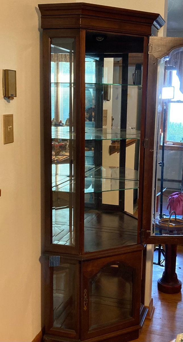 LOT 141: Wood / Glass Corner Lighted Curio Cabinet