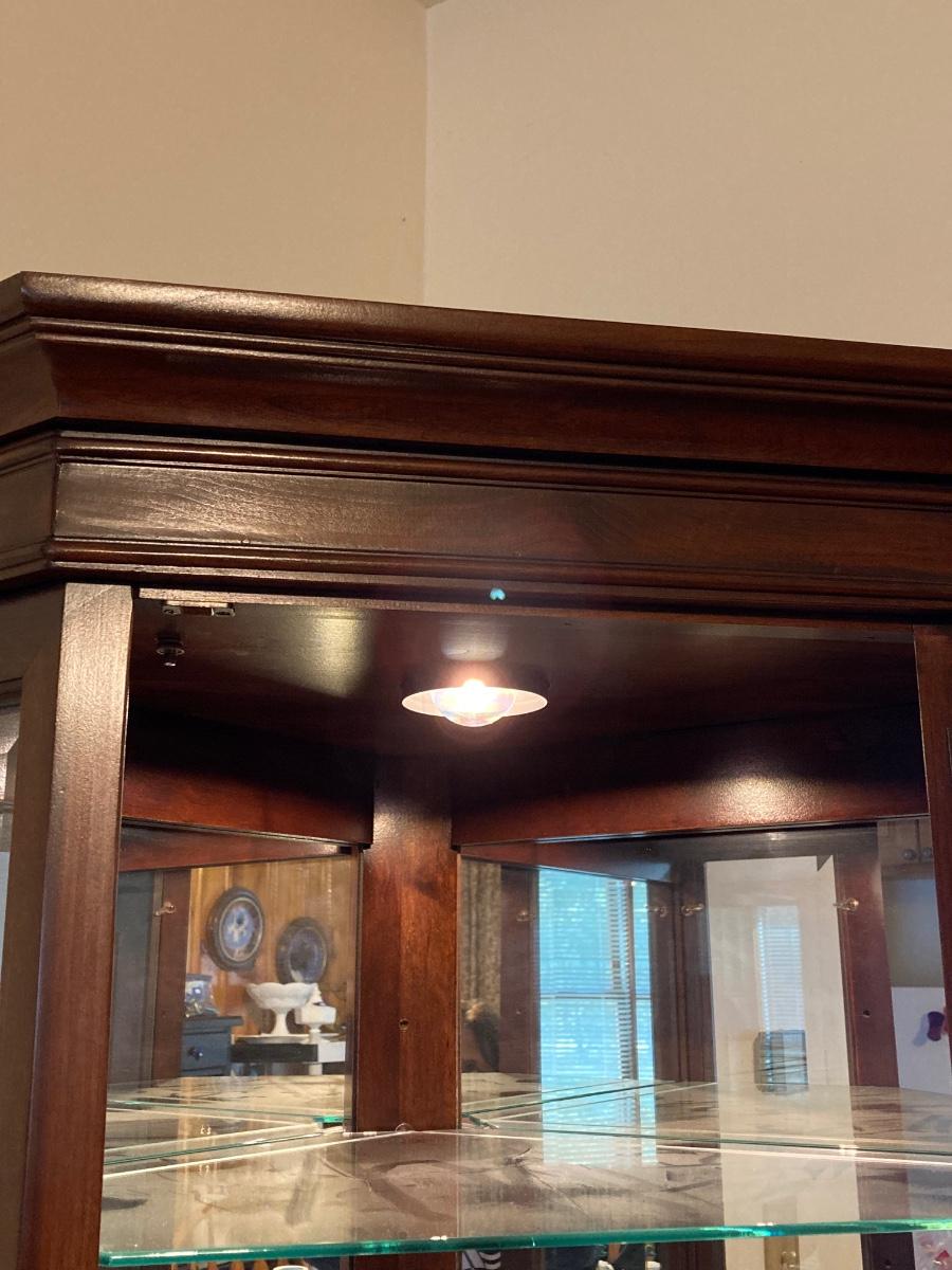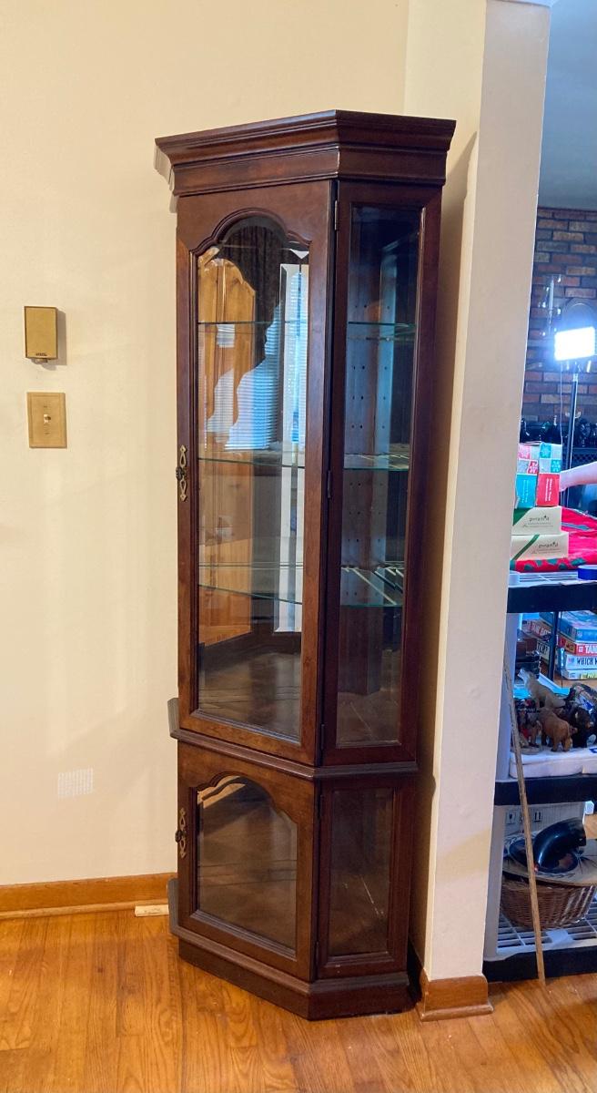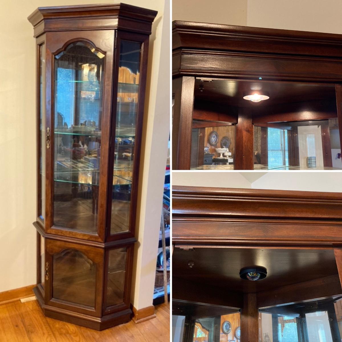 LOT 141: Wood / Glass Corner Lighted Curio Cabinet